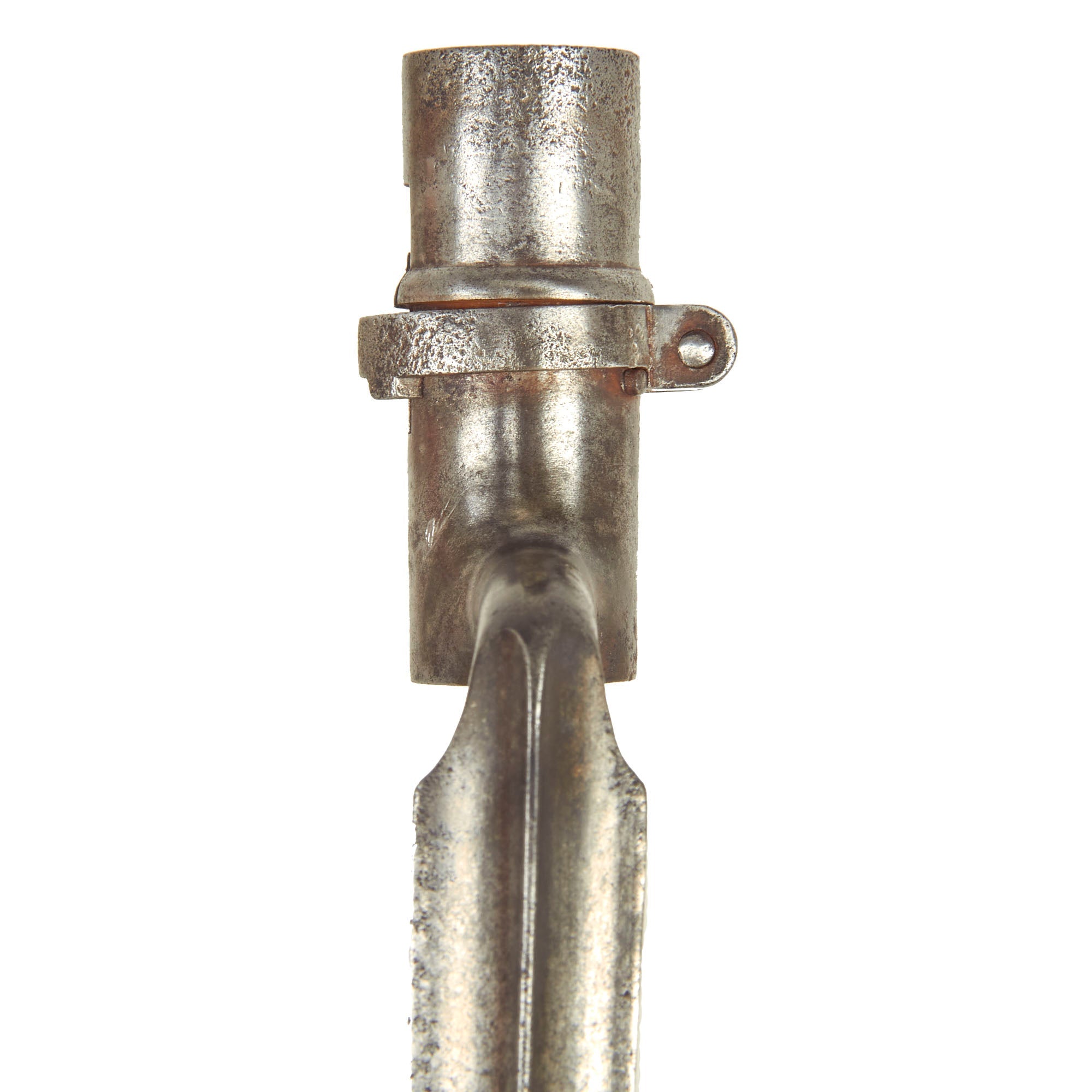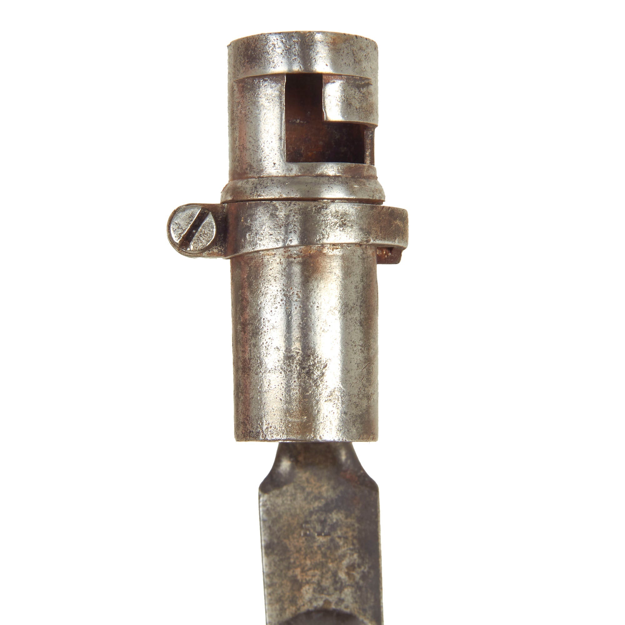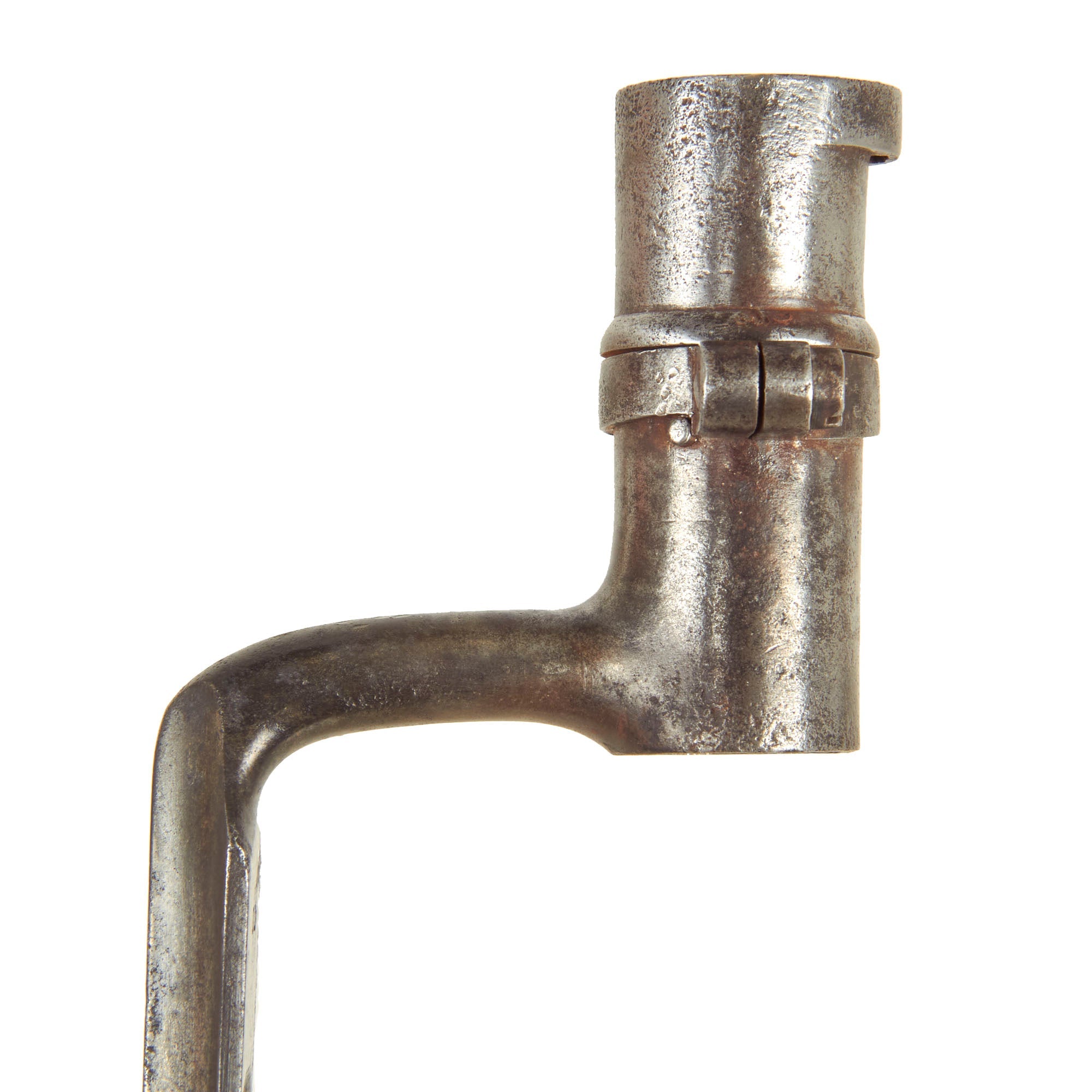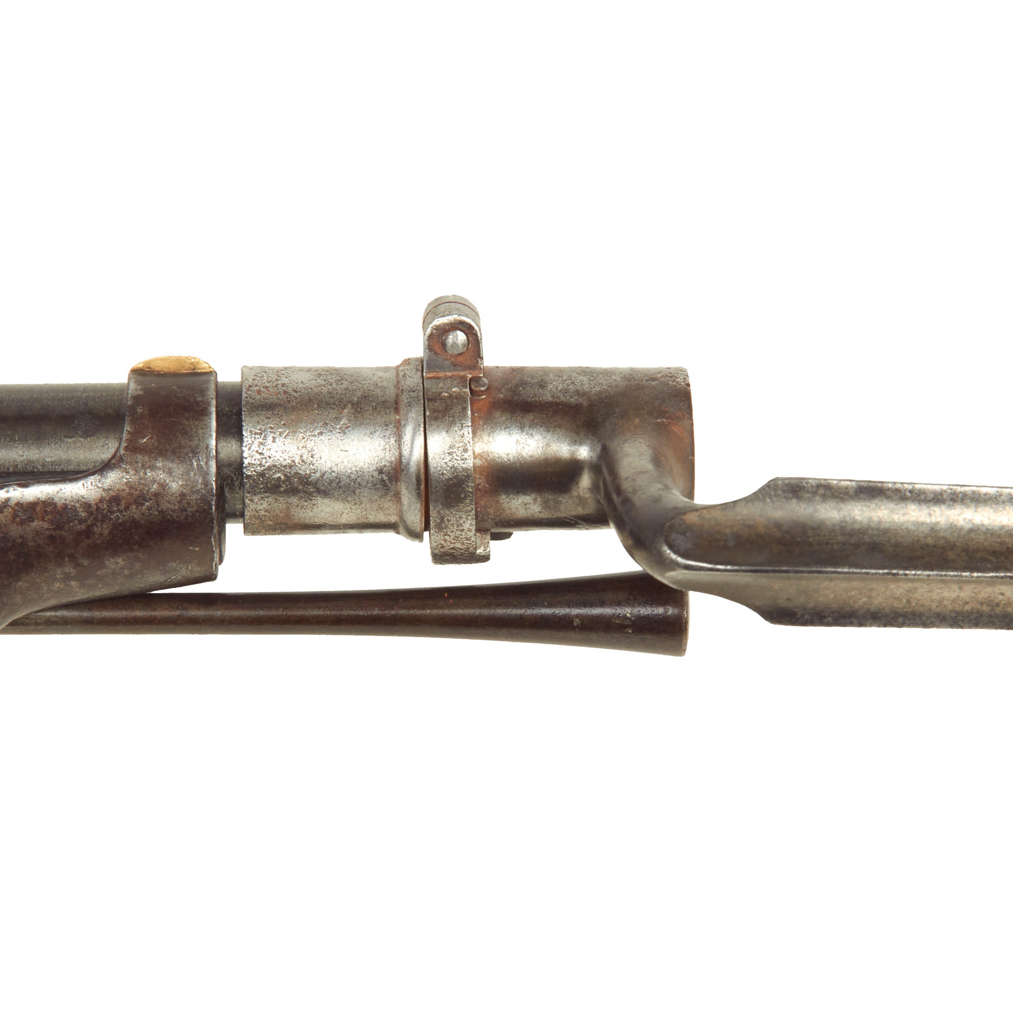 The included bayonet is very nice, correctly stamped US on the ricasso, and has a lovely aged patina. It locks onto the front of the musket well, though oxidation on the inside of the socket prevents it from sliding on all the way. The ring lock is also frozen, which we did not correct to avoid damaging it. The bayonet overall shows a stained patina, with a few areas of rust peppering. Almost all were melted down or sleeved to fit later versions of the Springfield Rifle, so this is a real treat!