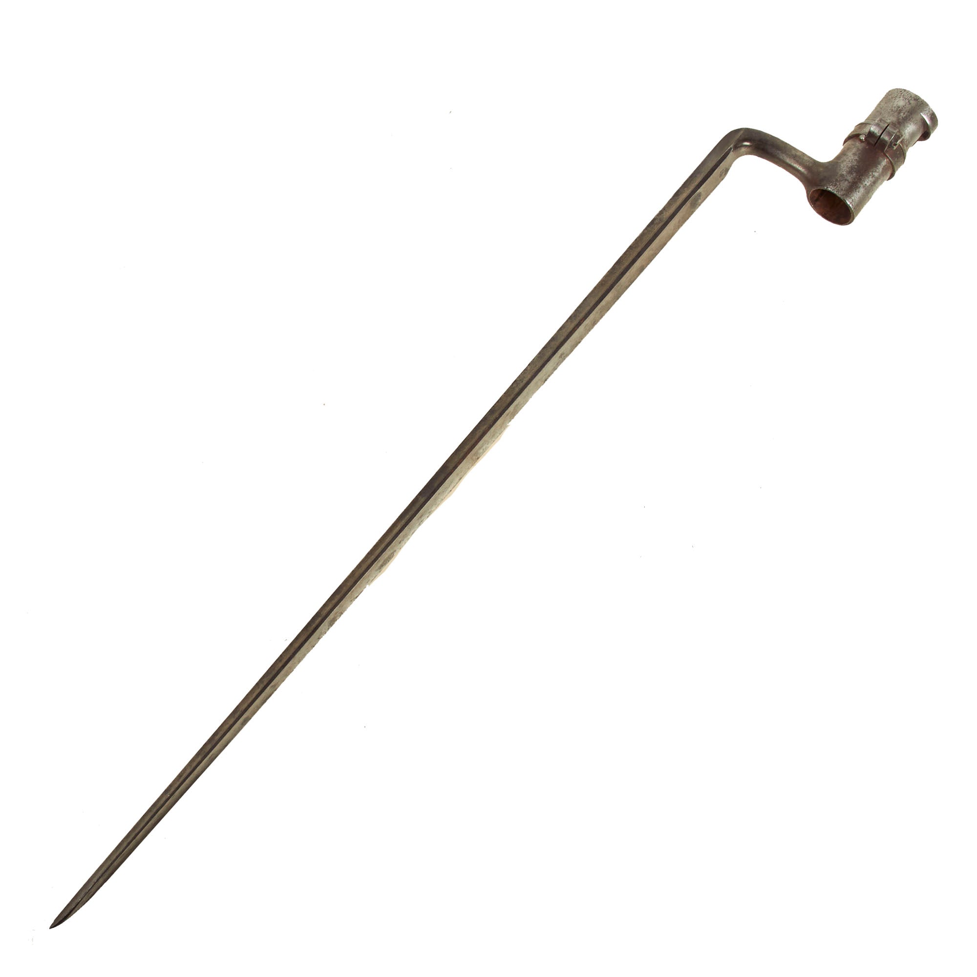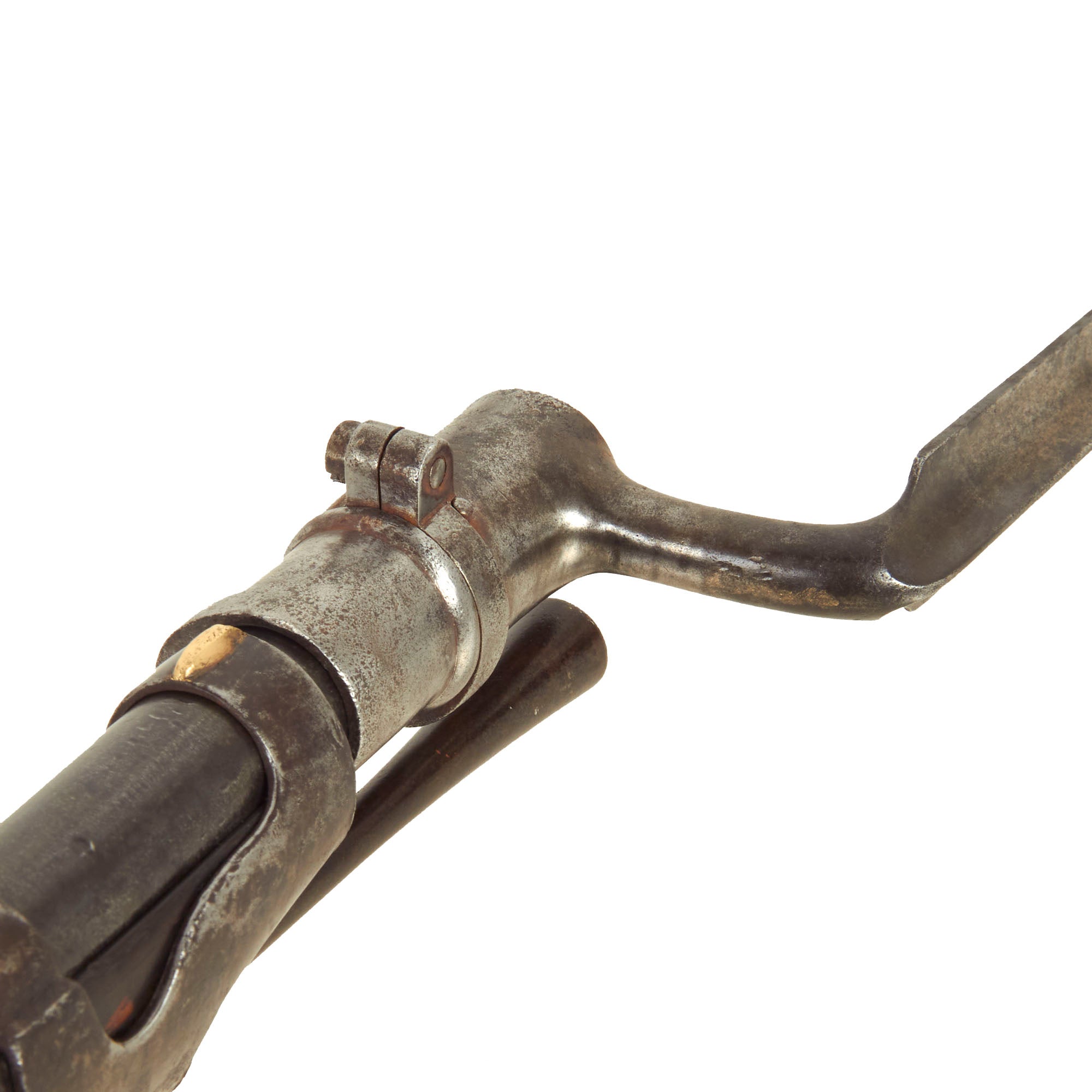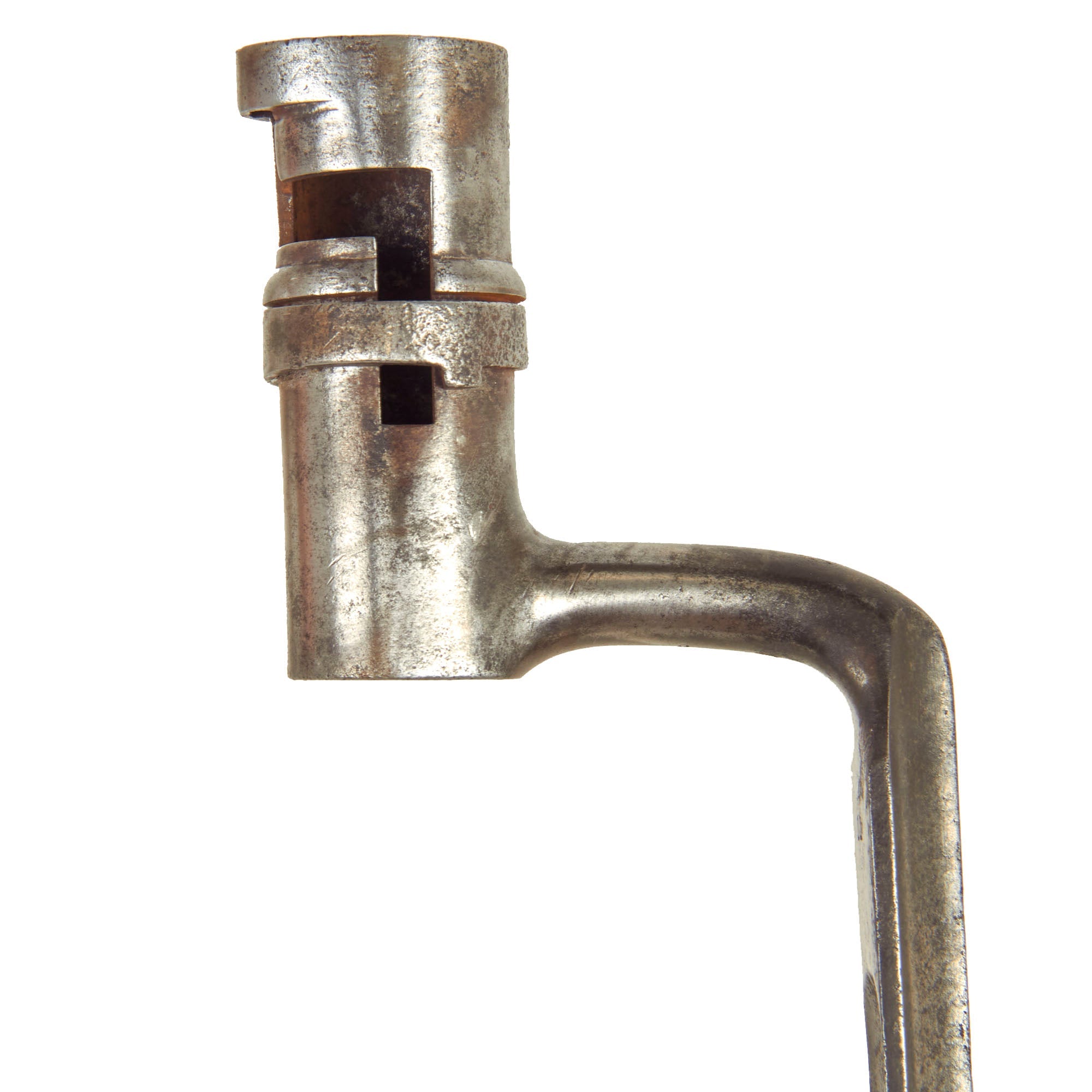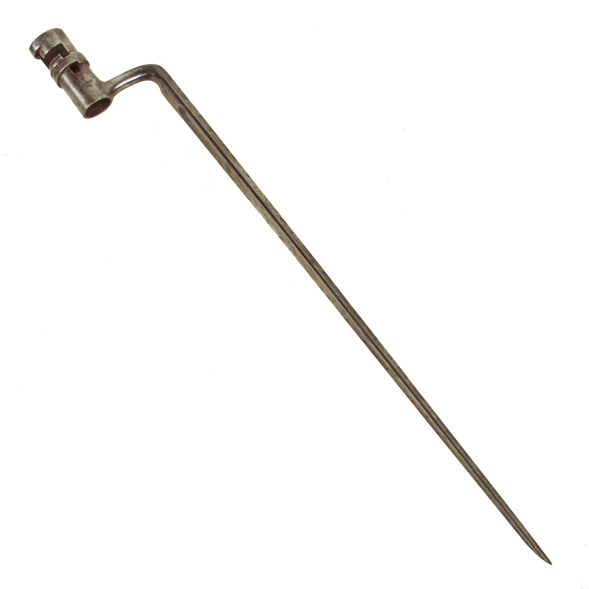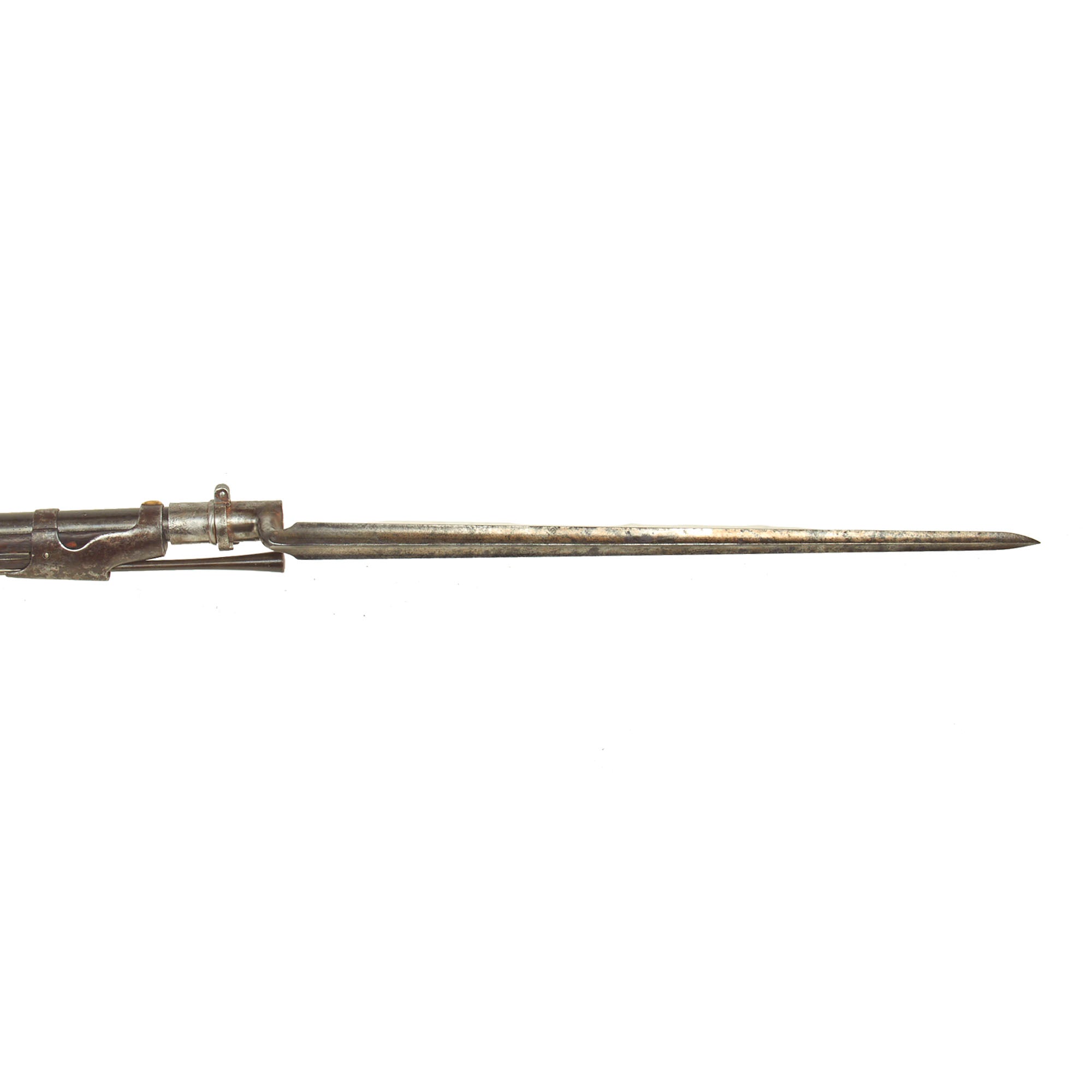 The included bayonet is very nice, correctly stamped US on the ricasso, and has a lovely aged patina. It locks onto the front of the musket well, though oxidation on the inside of the socket prevents it from sliding on all the way. The ring lock is also frozen, which we did not correct to avoid damaging it. The bayonet overall shows a stained patina, with a few areas of rust peppering. Almost all were melted down or sleeved to fit later versions of the Springfield Rifle, so this is a real treat!