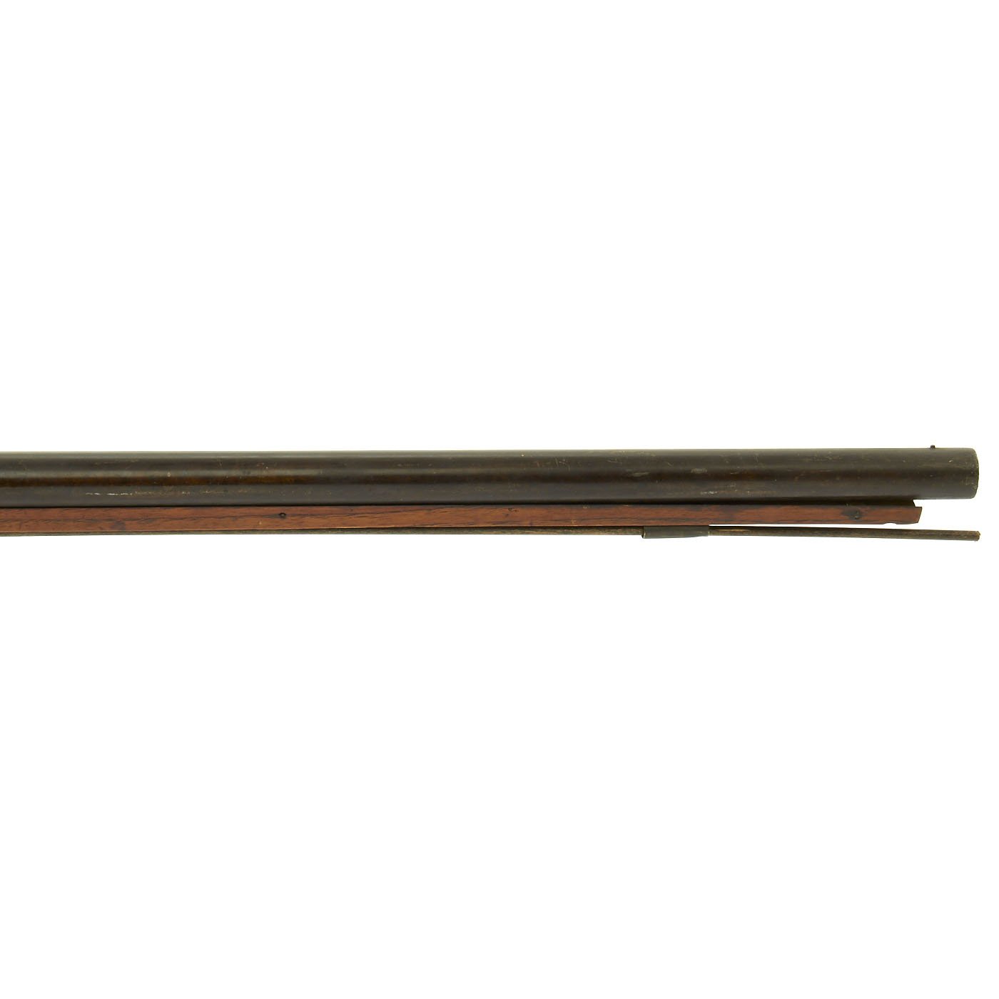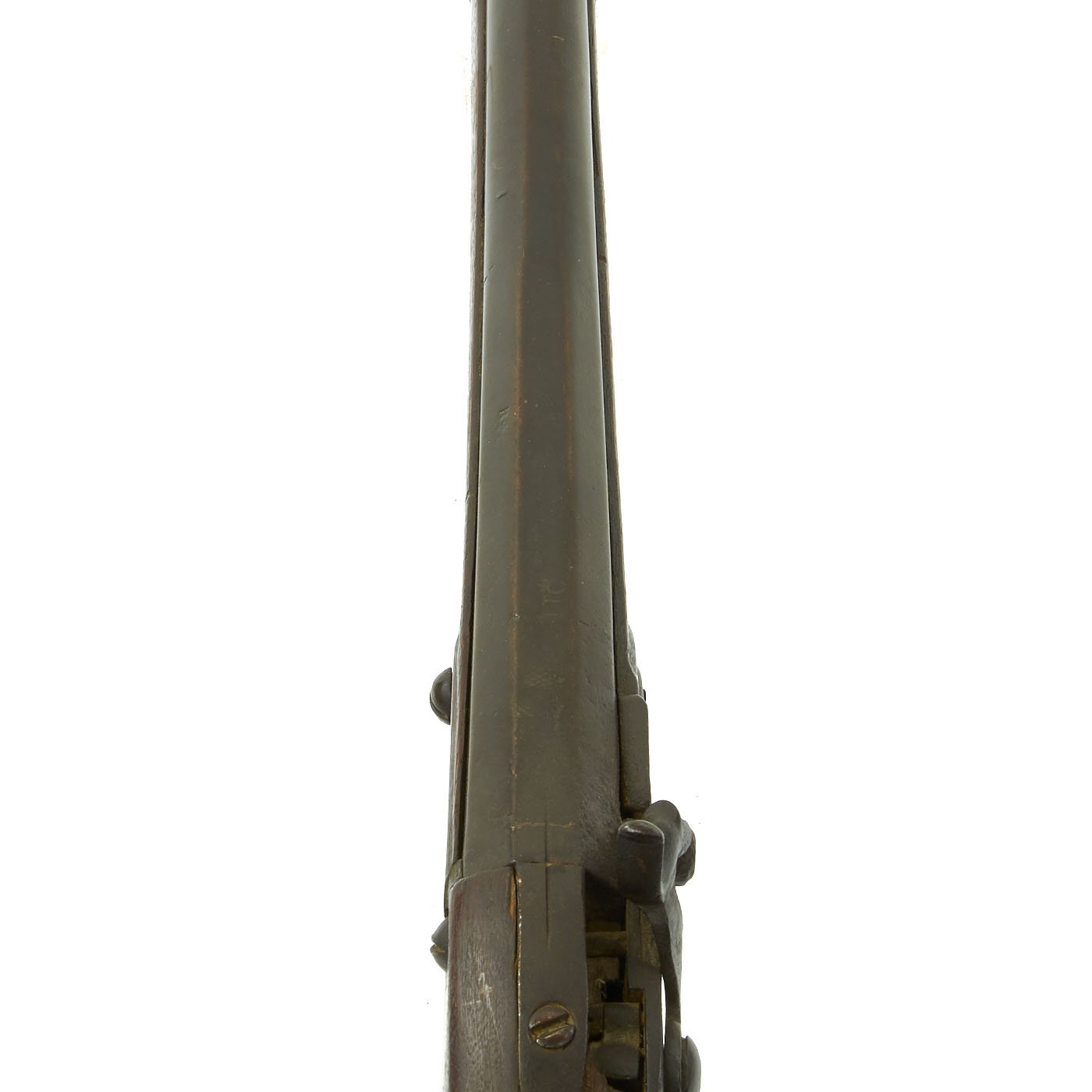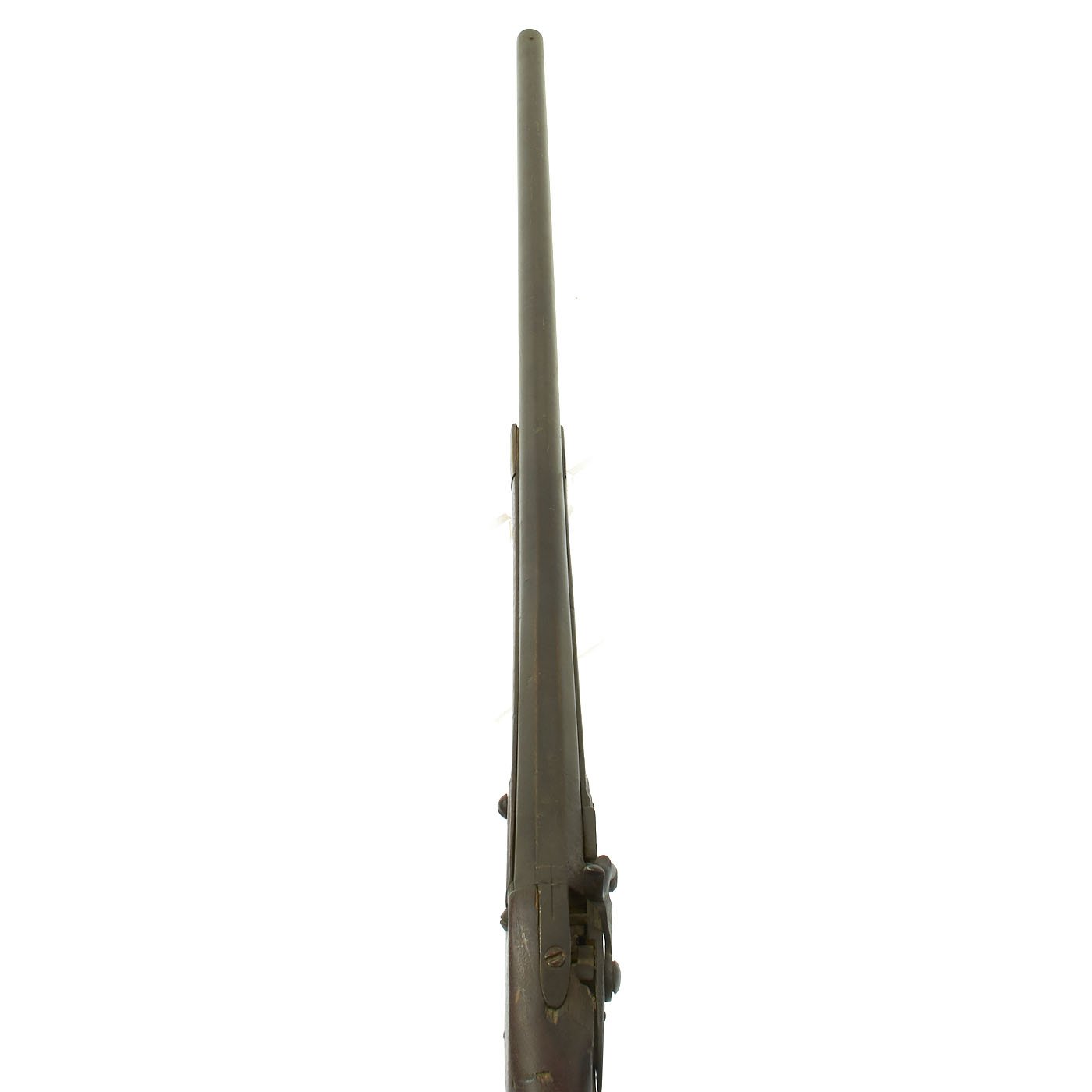 It has come from very long term storage and is offered as it came, un-restored and uncleaned. There is a chunk of wood missing behind the lock on the right hand side, but this could easily be restored. The barrel measures 34" and comes with ram rod, with an overall length of 49 1/2".