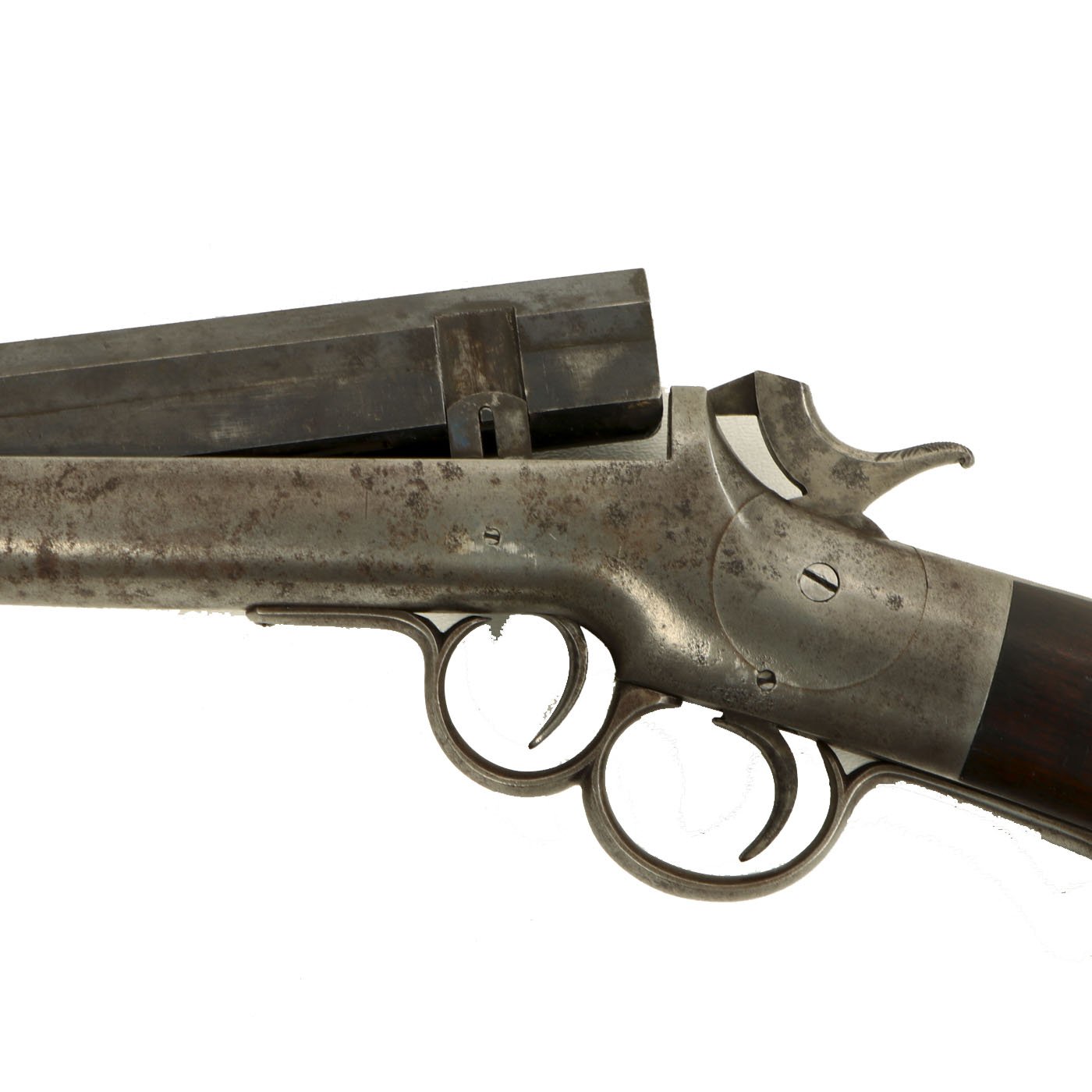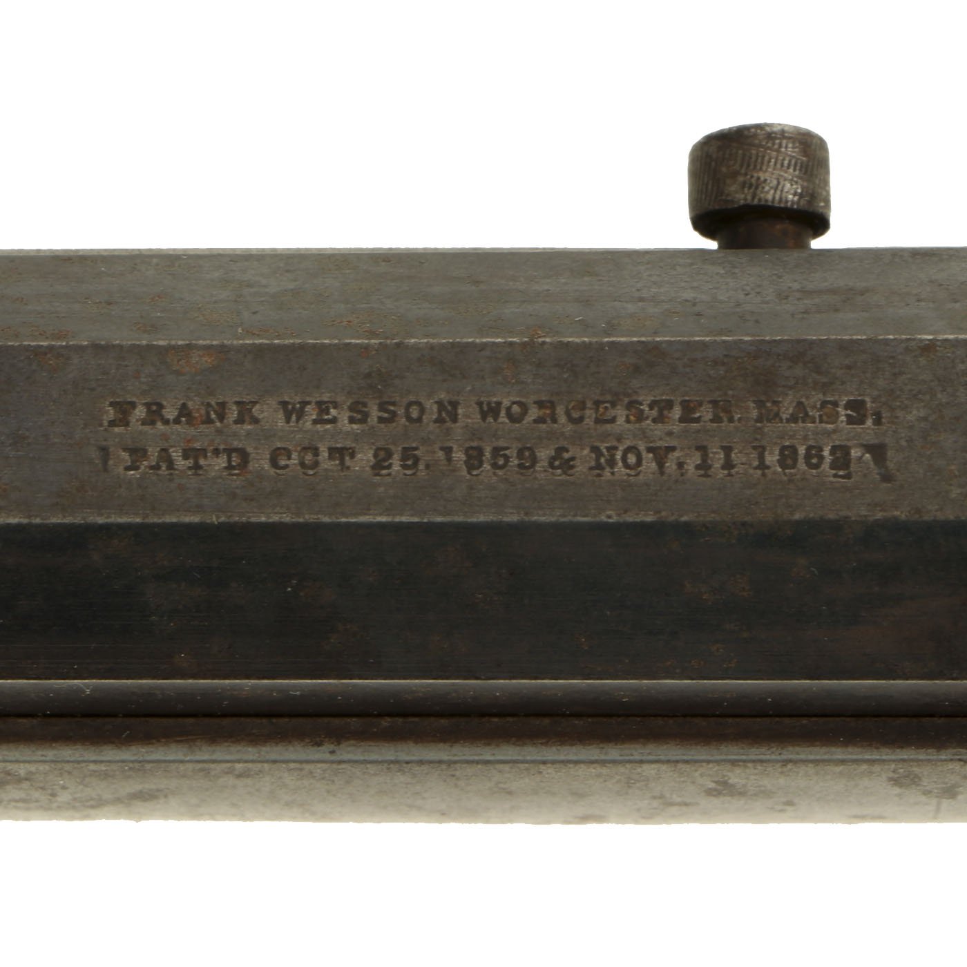 Original Item: Only One Available. This is an excellent Frank Wesson .32 caliber single-shot breech loading rifle in good condition. It is a top-break design that features a 24" octagonal barrel, and this example bears serial number 4832 on the trigger guard. During the Civil War, Frank Wesson supplied approximately 3,000 of these carbines in .44 long rimfire to B. Kittredge & Company of Cincinnati. Kittredge then supplied 760 to Indiana, 1,366 to Kentucky, and others to Kansas and Missouri. Most were then issued to units from those states.