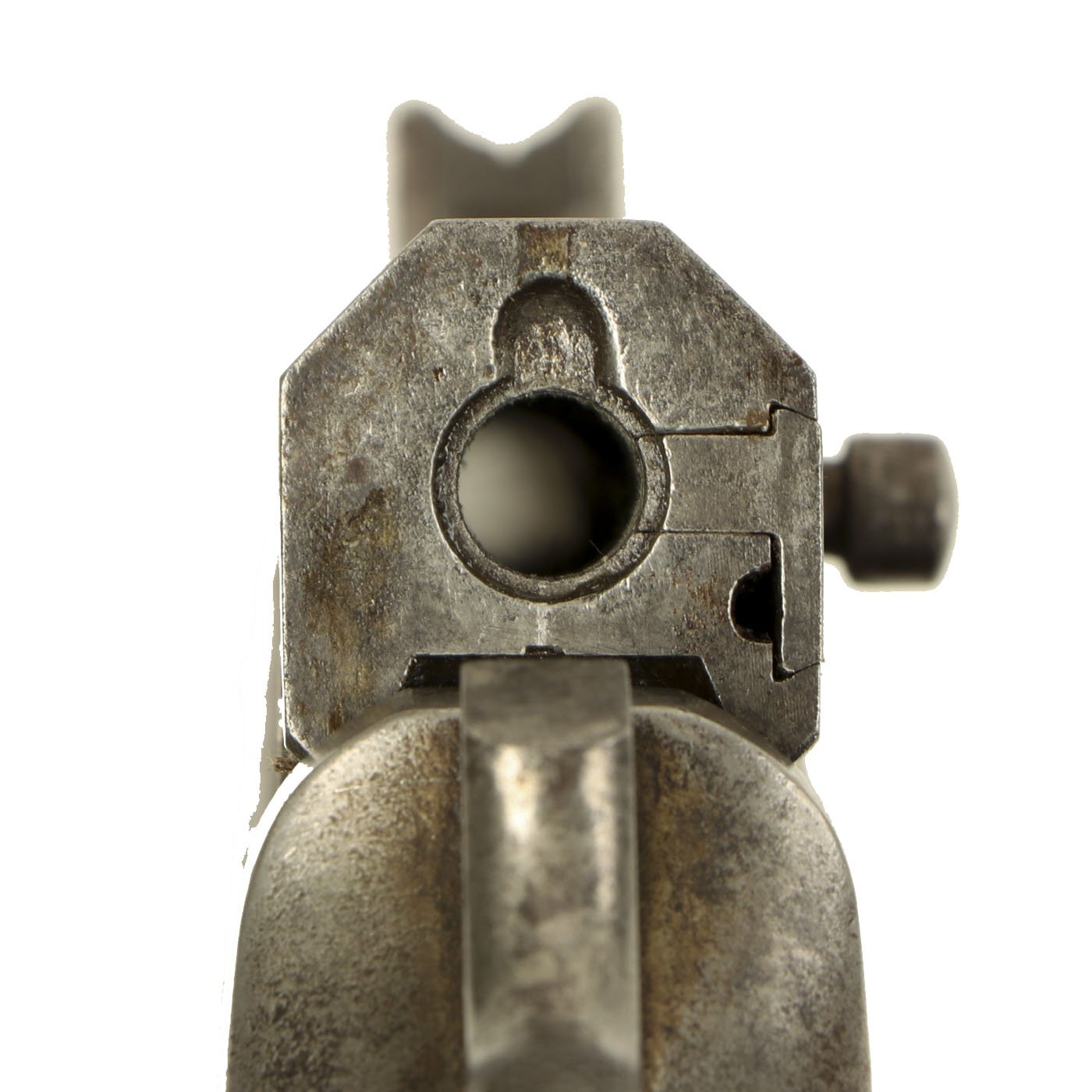 This gun does not seem to have seen much use, and the barrel still has much of the original blued finish. There is even some case hardening left on the ejector and barrel retaining latch. The receiver is still bright steel, with a peppery patina in areas. The bore shows clear lands and grooves, though there is a bit of lead fouling in the grooves, as well as light wear.