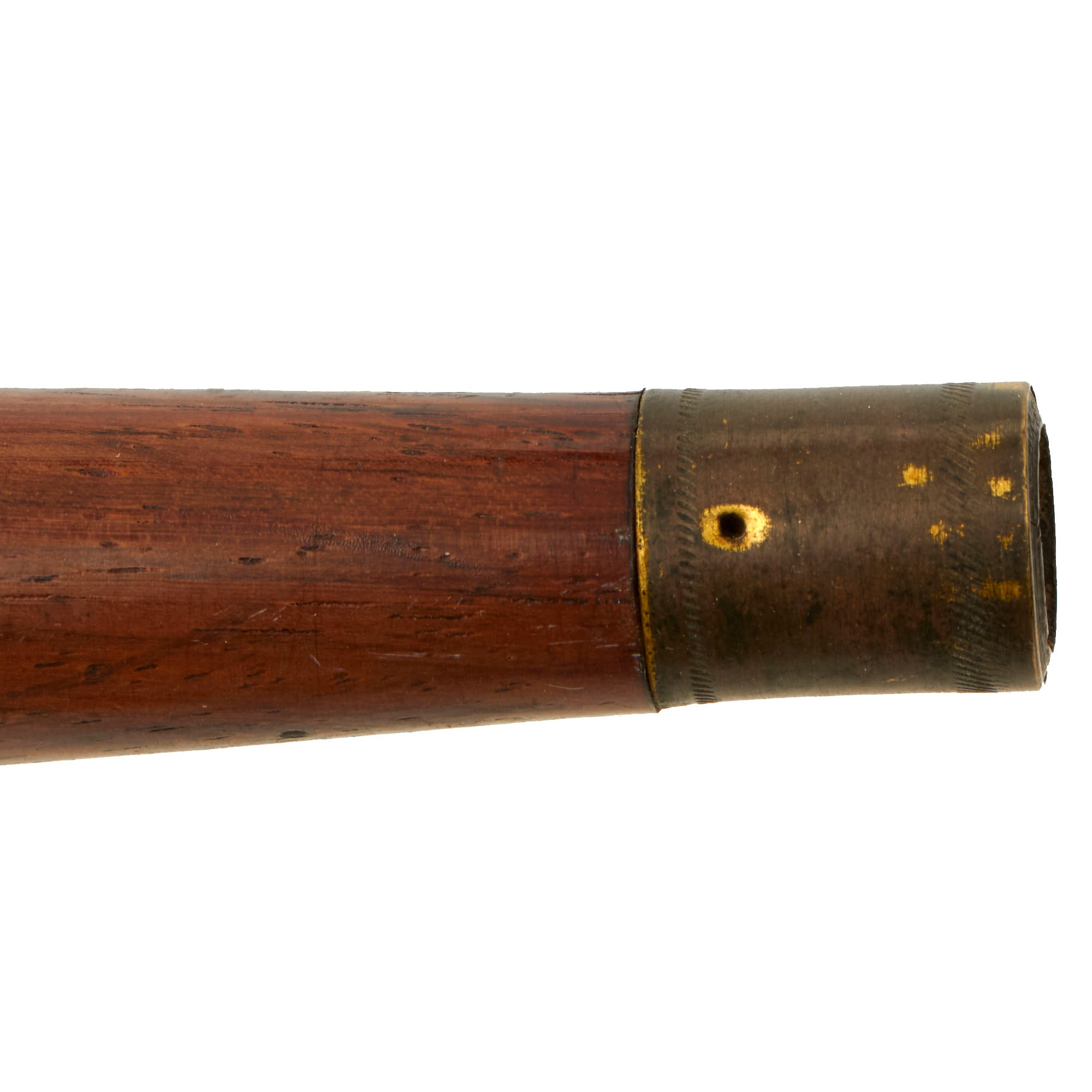 The fife measures 16¼” overall, originally made in a fine quality wood with brass caps on each end. It seems functional but we don't know how to play so we can’t test it.