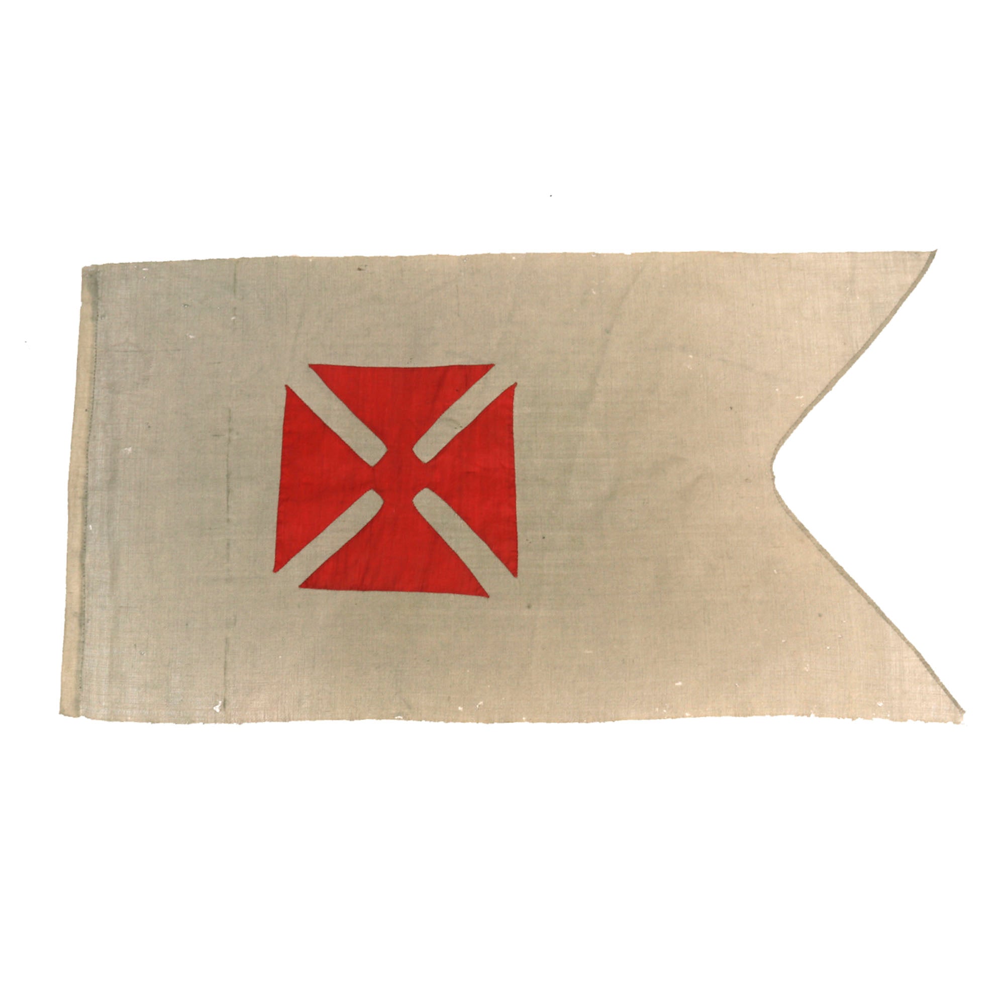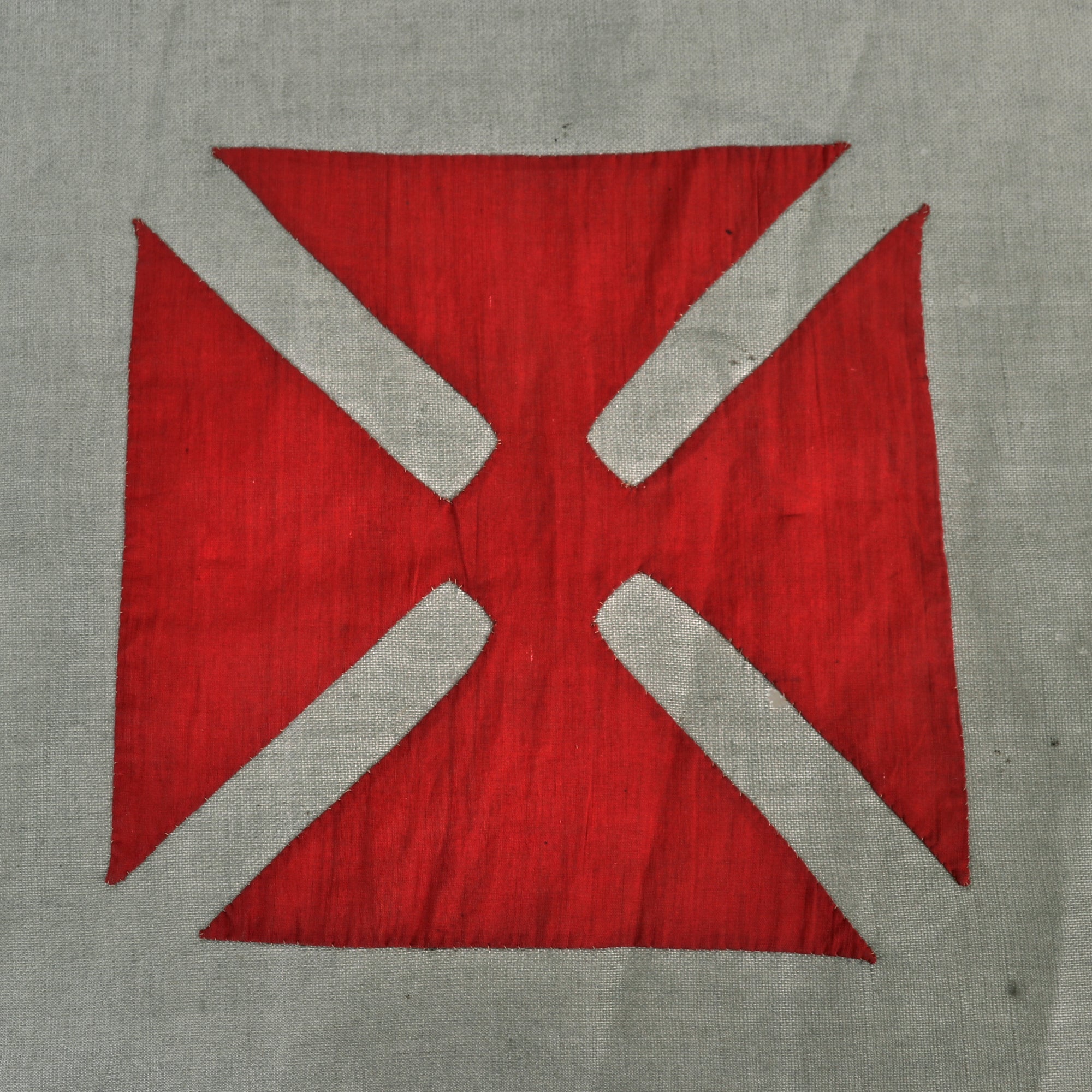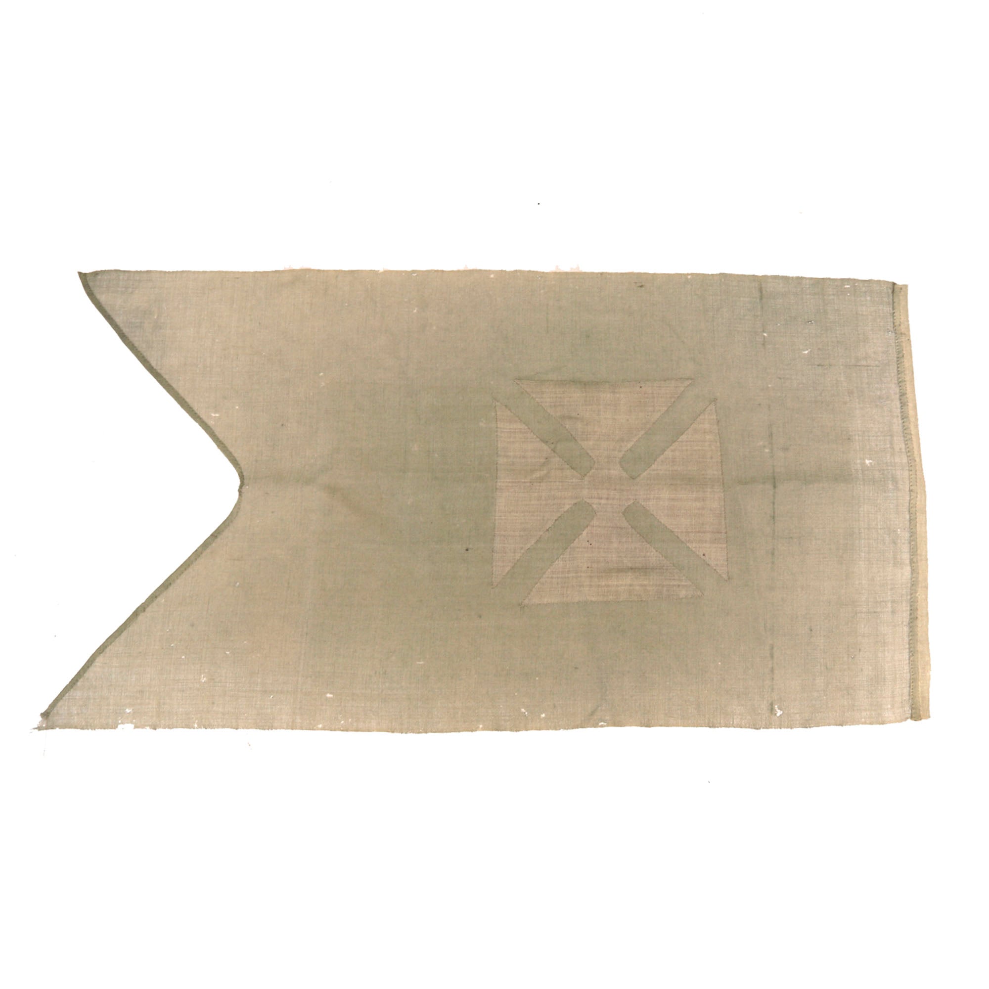 The guidon, which measures 19 x 38”, is of handmade construction, with the header stitching very evident of hand-stitching. The guidon was originally a heavy blue color, but has faded to an almost-white color. The Maltese Cross in the center is also hand-stitched and is red, denoting the 1st Division of V Corps.
