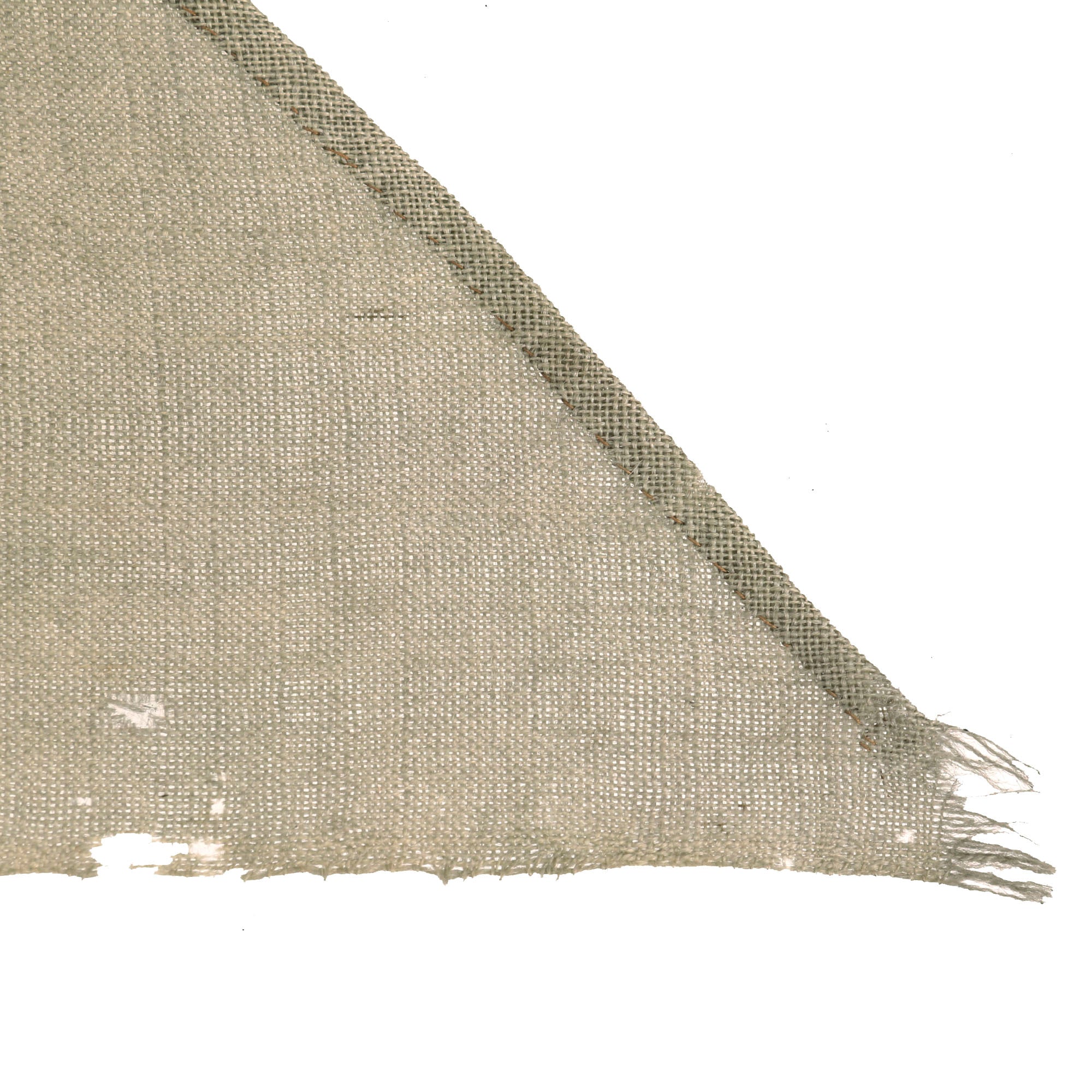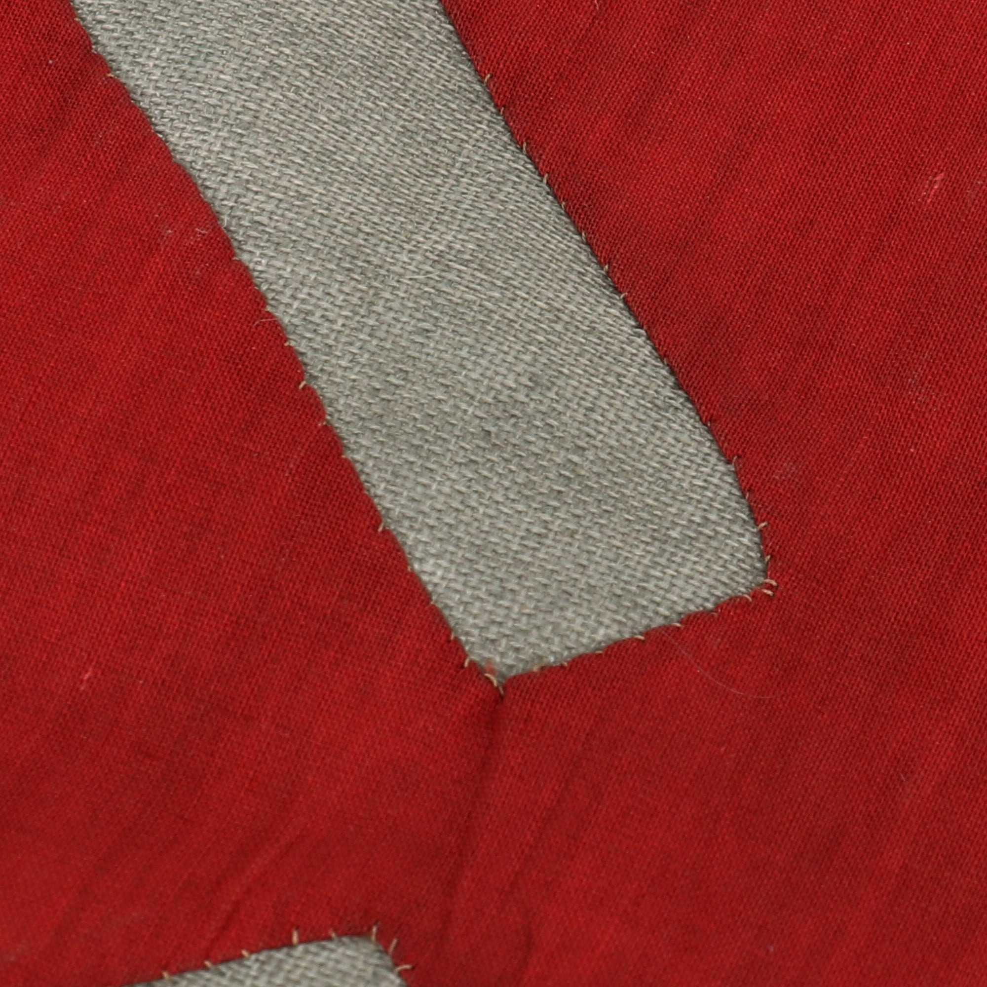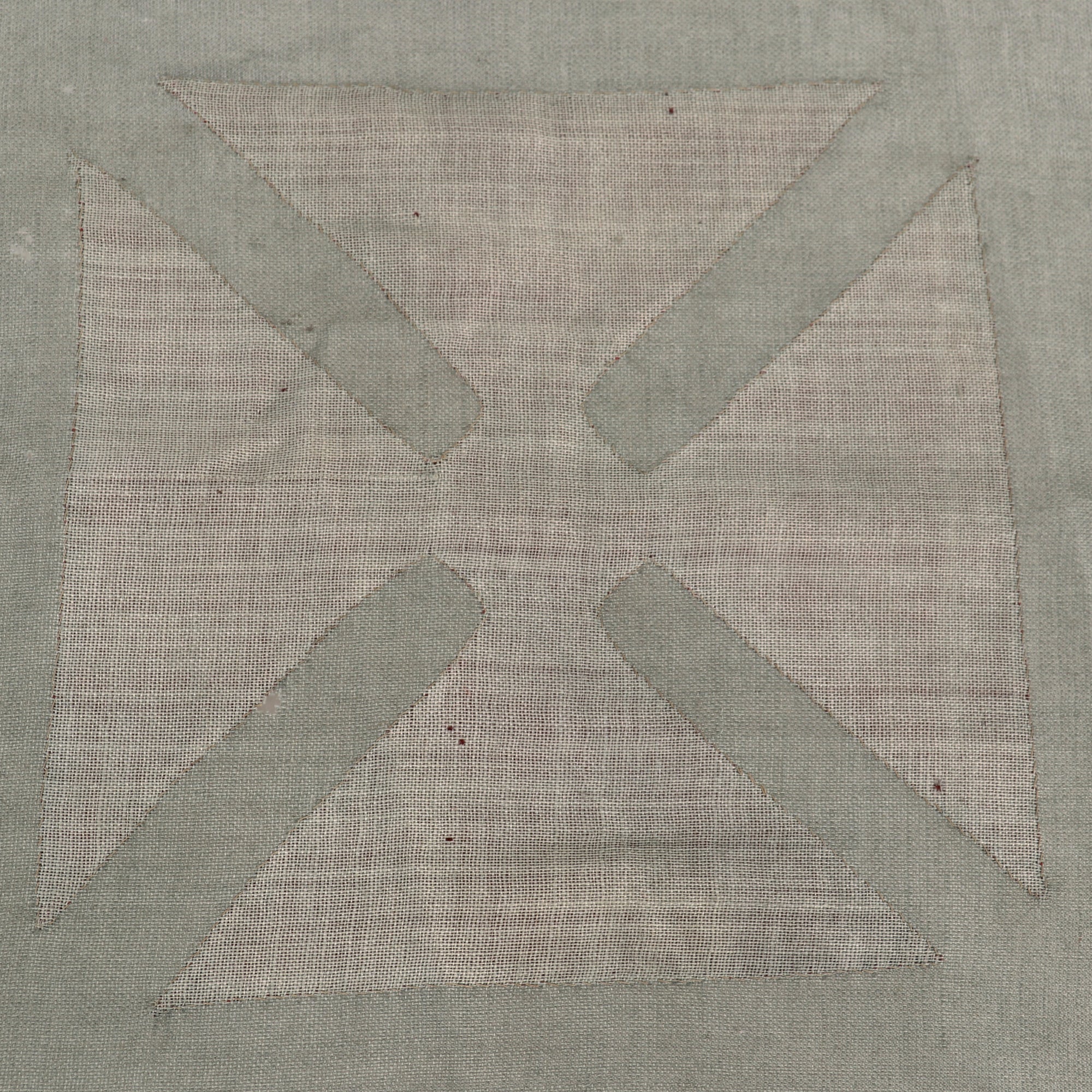 The guidon, which measures 19 x 38”, is of handmade construction, with the header stitching very evident of hand-stitching. The guidon was originally a heavy blue color, but has faded to an almost-white color. The Maltese Cross in the center is also hand-stitched and is red, denoting the 1st Division of V Corps.