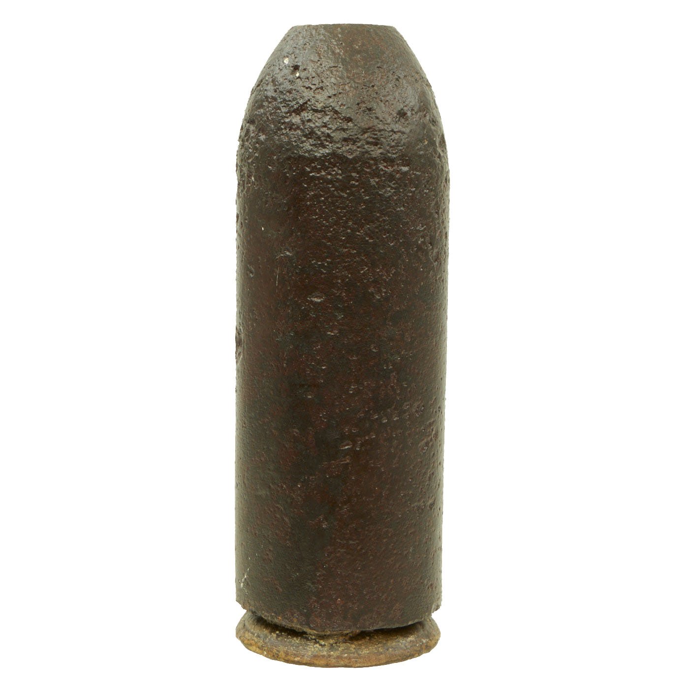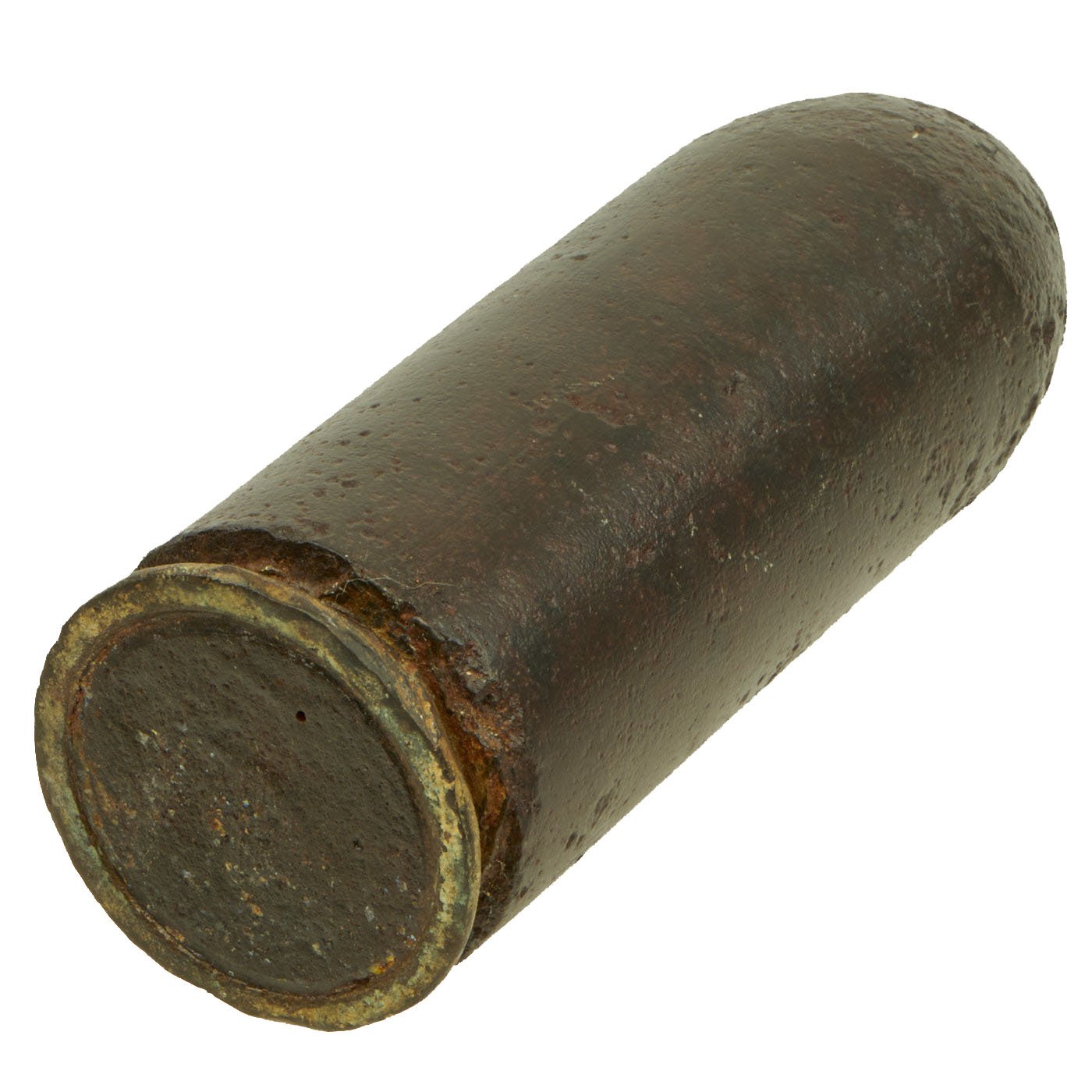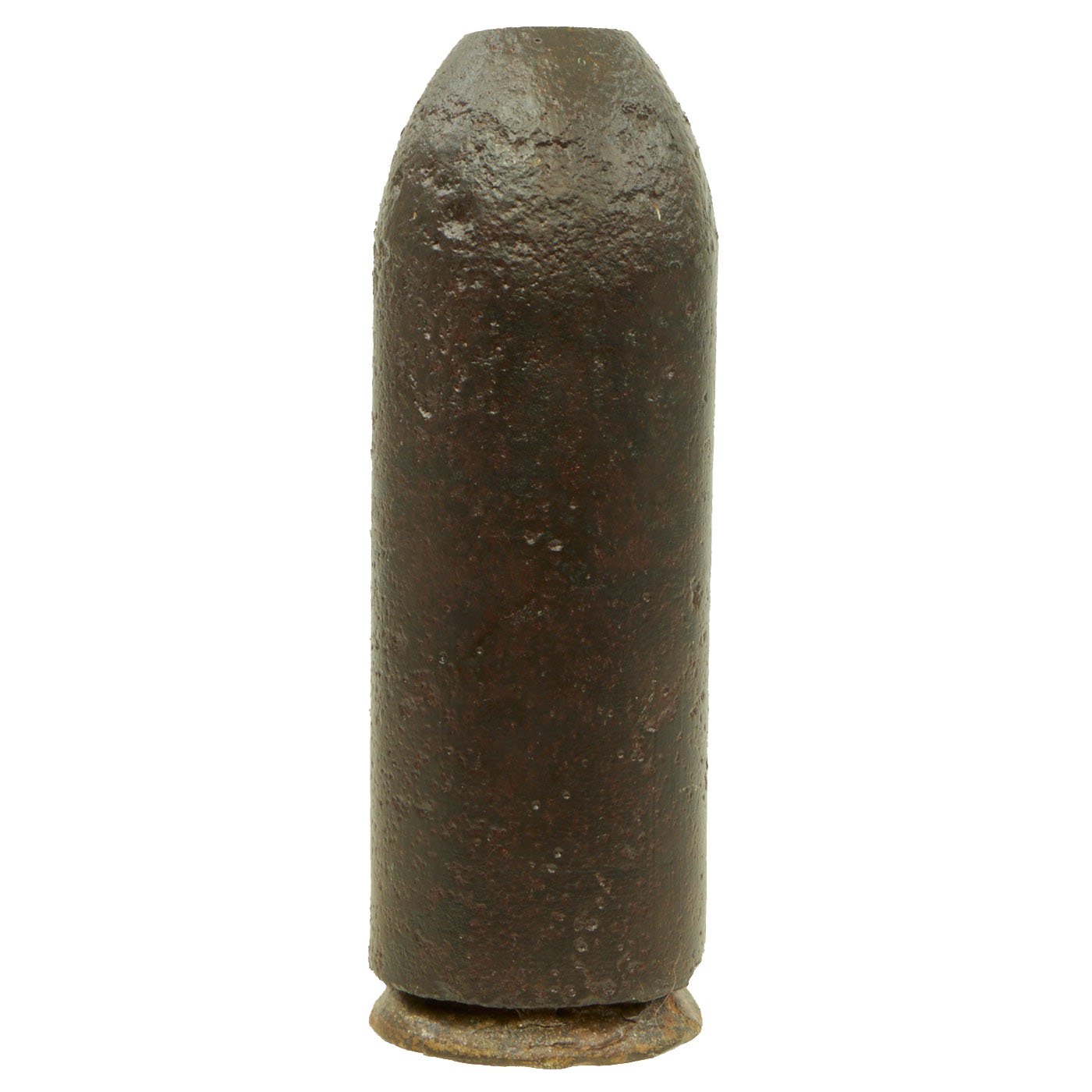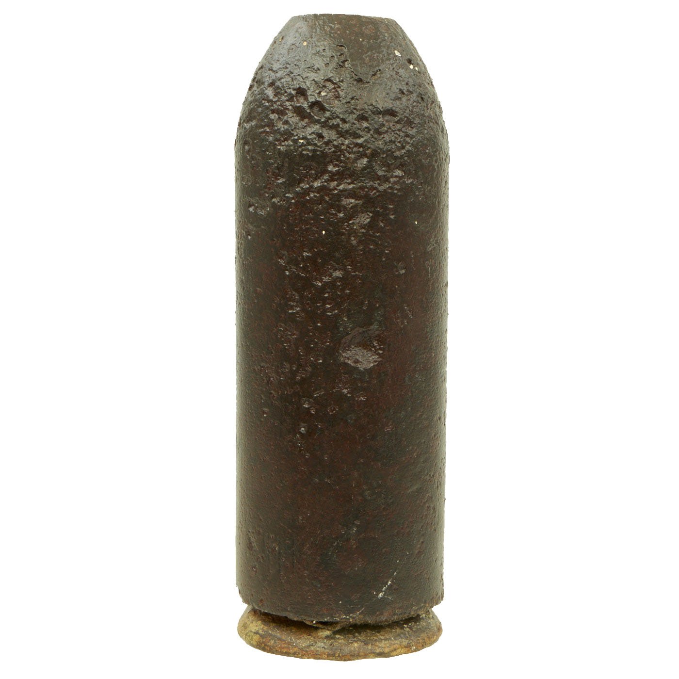 This design features case shot material, and a brass sabot that is cast onto the exterior of the iron shell, with some "teeth" that are intended to keep the sabot from rotating off of the shell. Unfortunately this was not entirely successful, and most of these projectiles are found with the sabot having been thrown off when fired.