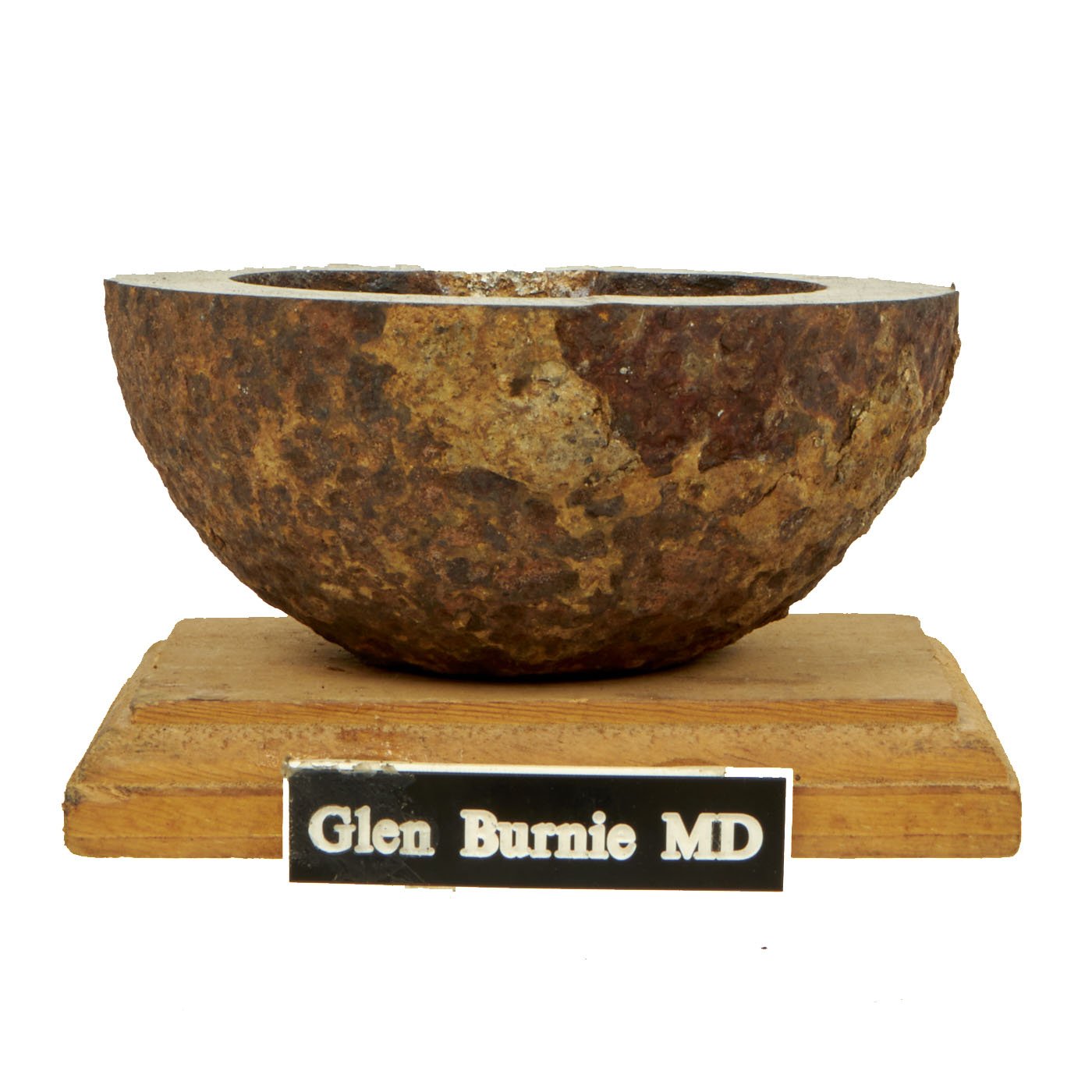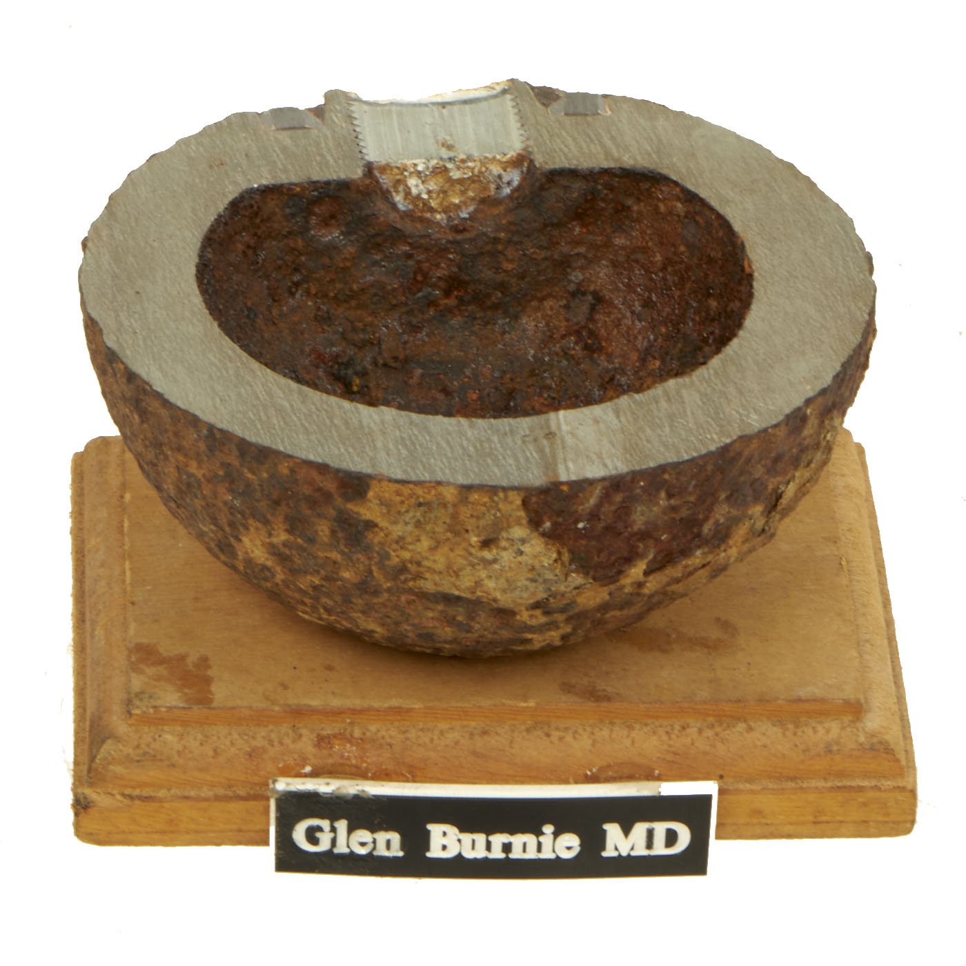 Original Item: Only One Available. Very well done cutaway display made from a cannonball recovered from Glen Burnie, Maryland. This is a U.S. Shell used with the twelve pound Napoleon Artillery Piece. The shell is fitted with a Wright Fuze, which is still present.The Sectioned Shell comes with a display base with a tag indicating it was recovered from Glen Burnie, Maryland.