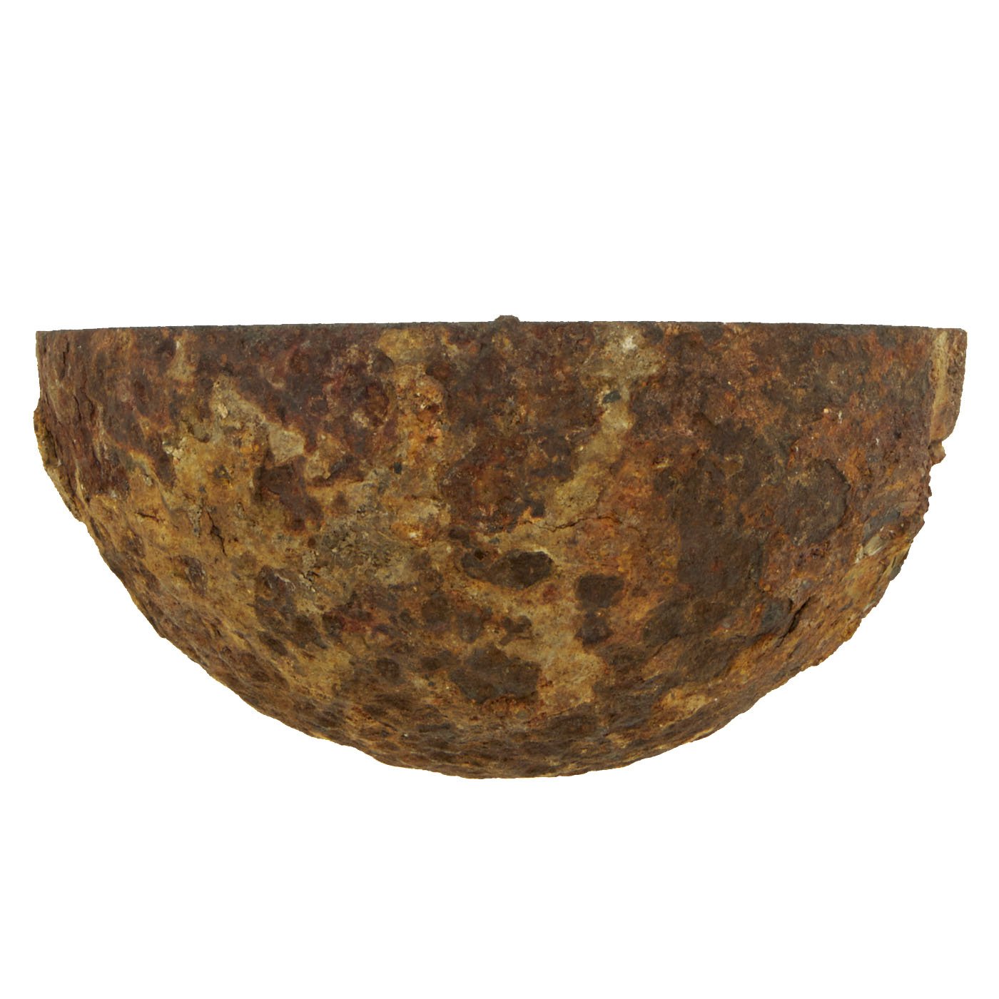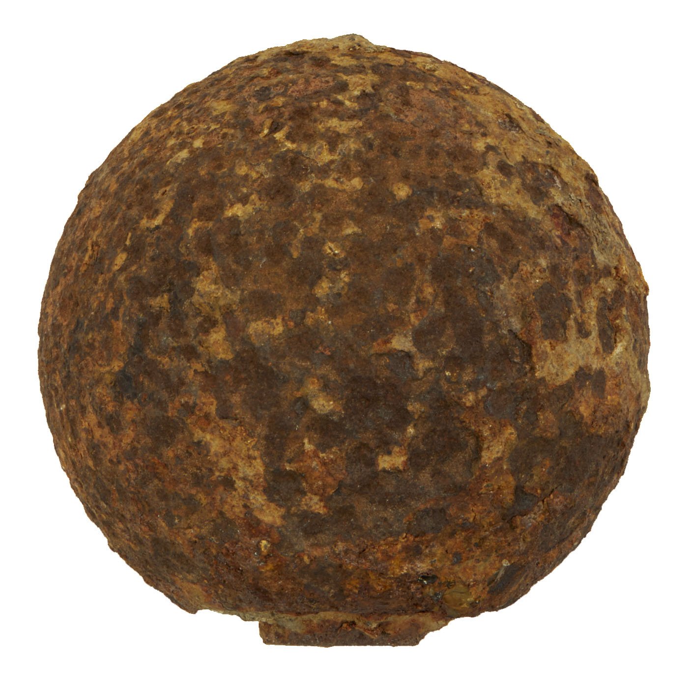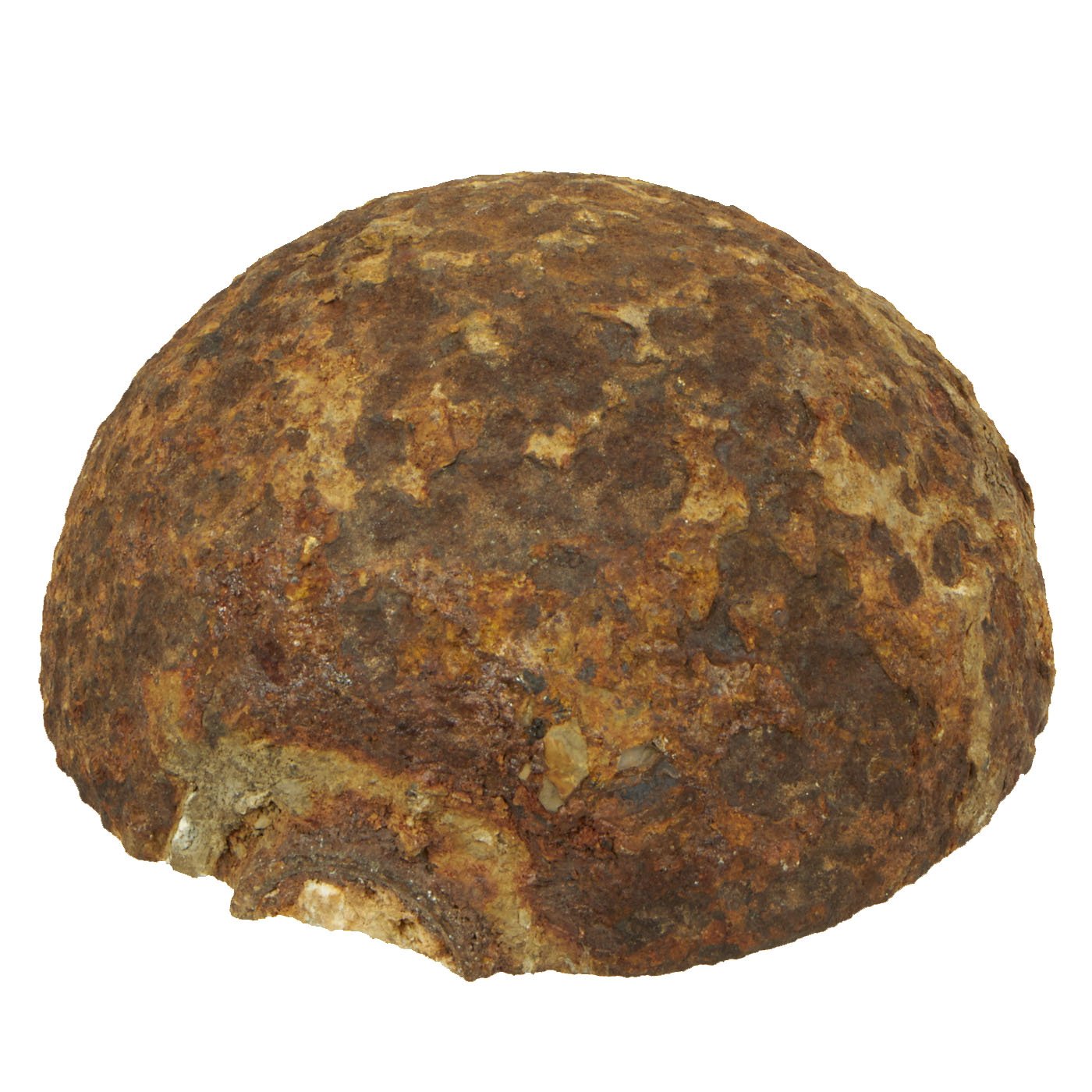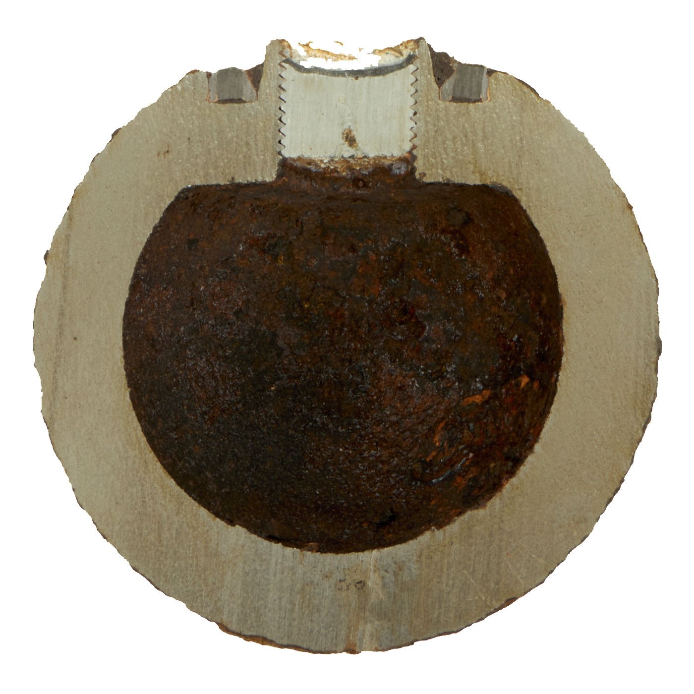 This item was excavated so the iron surface is pitted. Lead/zinc fuse band shows ground action on exterior, so no numbers remain visible. However, the embedded powder train within the band remains evident in the cross-section. The hole that lead to the inner charge from the fuse is also visible on this specimen