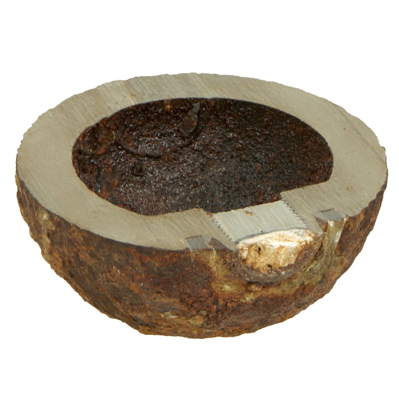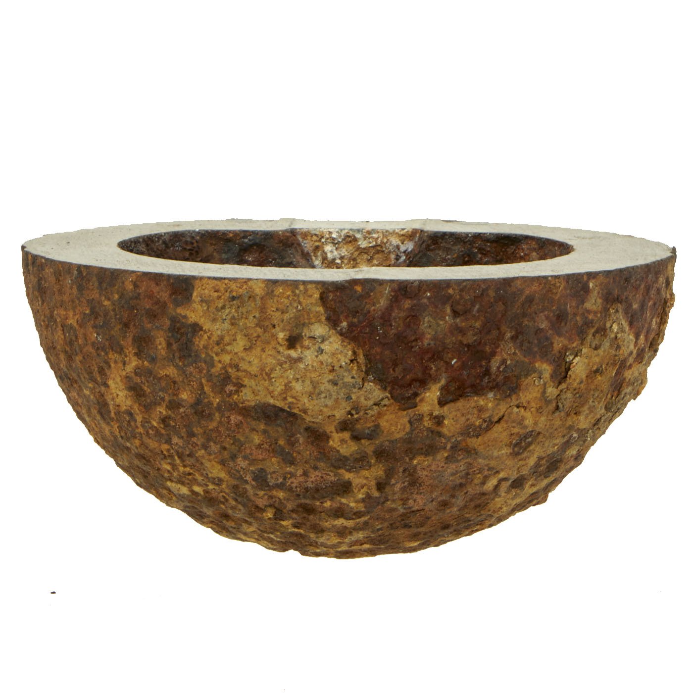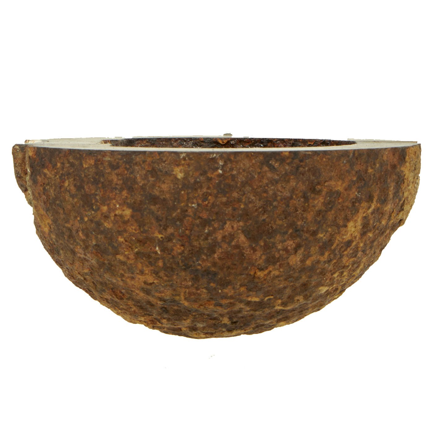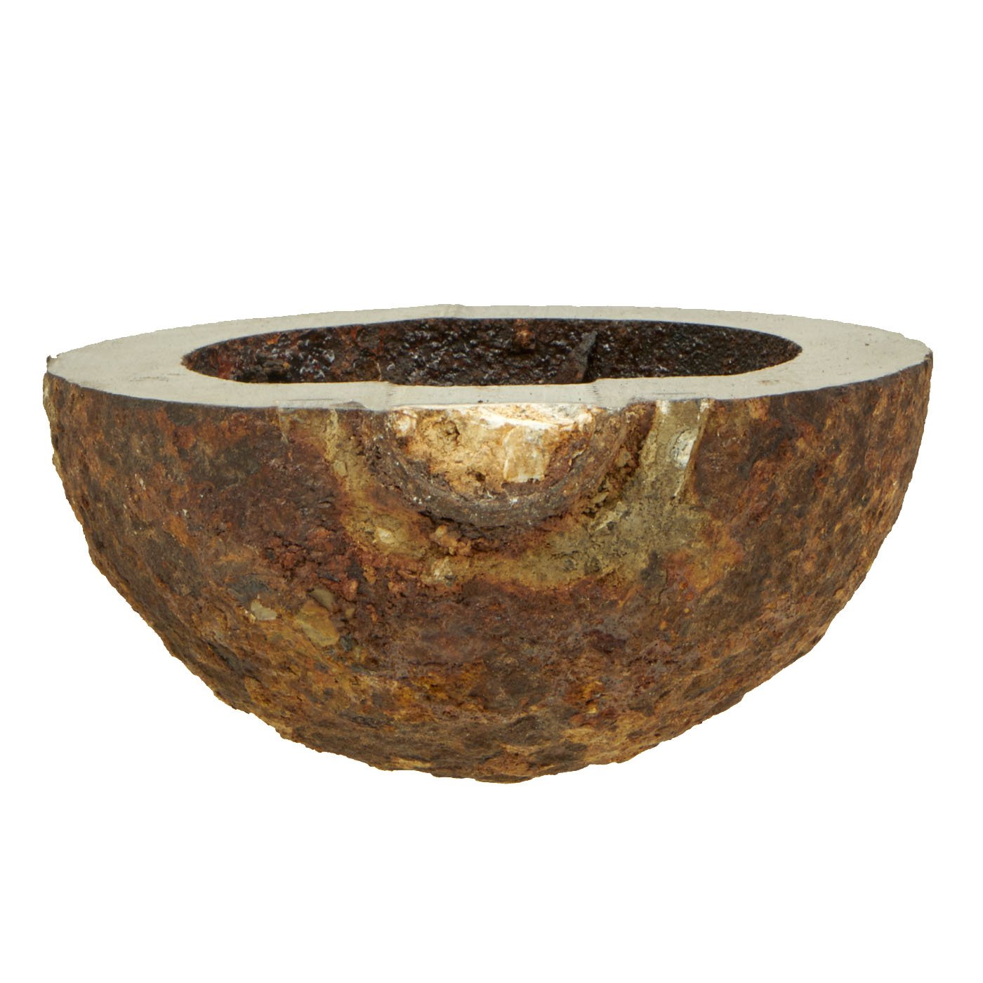 This item was excavated so the iron surface is pitted. Lead/zinc fuse band shows ground action on exterior, so no numbers remain visible. However, the embedded powder train within the band remains evident in the cross-section. The hole that lead to the inner charge from the fuse is also visible on this specimen