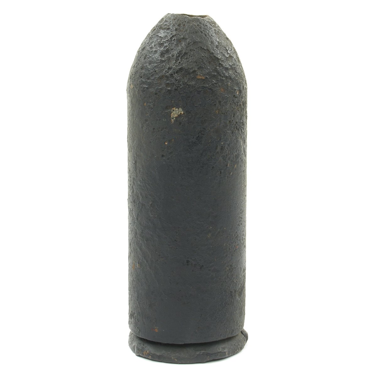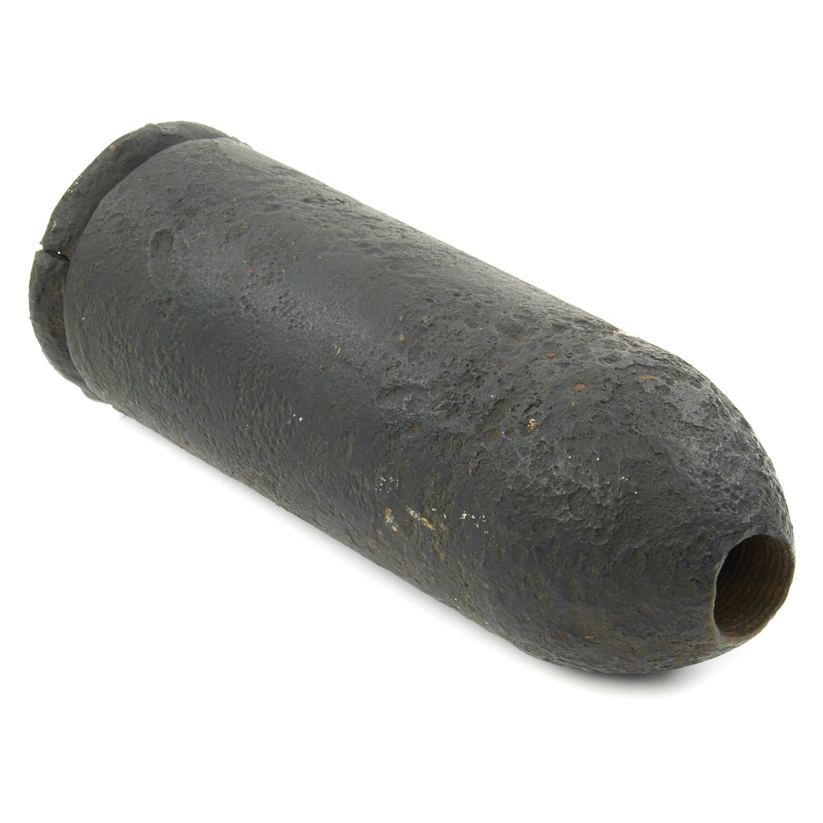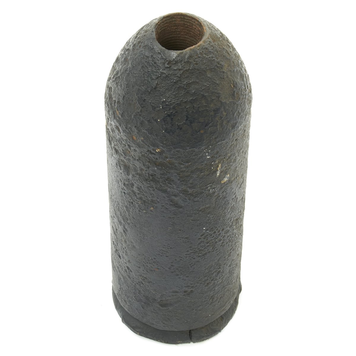 Original Item: Only One Available. This is an example of a long-pattern 20-pounder (3.67-inch caliber) Federal Read-Parrott projectile. The long-pattern Parrott projectiles did not contain any case-shot material. A large number of this style projectile were fired during the 1864 Atlanta Campaign. This pattern is also found with a wrought iron ring sabot, such as this example, and therefore, is considered a Read-Parrott projectile pattern. The wrought iron sabot was cast first and suspended in a mold around which the iron body was poured, thus embedding the sabot during this casting process. This was unlike the later production brass Parrott sabots which were cast directly onto the body. Parrott patented an improvement upon Read's sabot design; therefore, the name Read-Parrott is assign to all Federal and Confederate projectiles with this iron sabot style and body design. A nearly identical example can be found on the Civil War Artillery website this link.