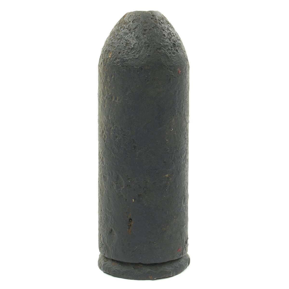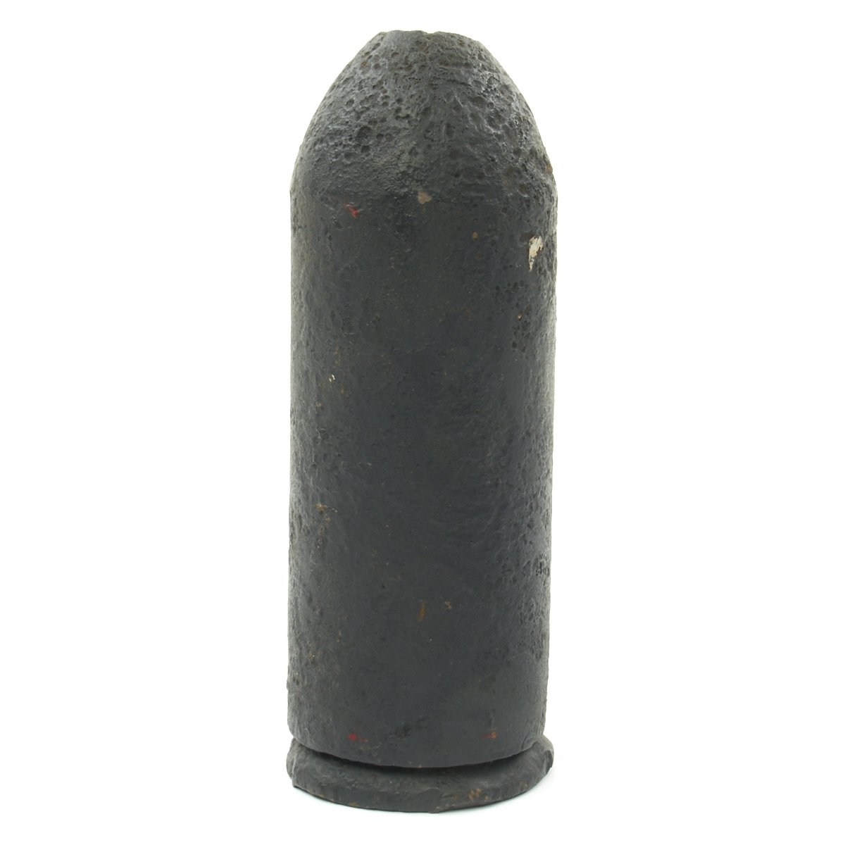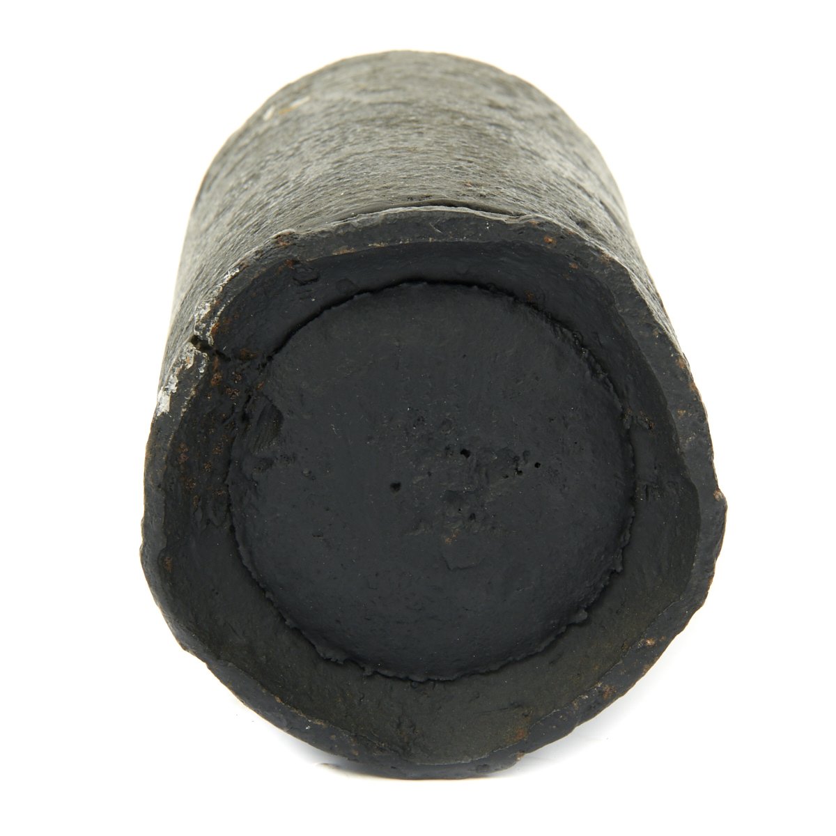 Original Item: Only One Available. This is an example of a long-pattern 20-pounder (3.67-inch caliber) Federal Read-Parrott projectile. The long-pattern Parrott projectiles did not contain any case-shot material. A large number of this style projectile were fired during the 1864 Atlanta Campaign. This pattern is also found with a wrought iron ring sabot, such as this example, and therefore, is considered a Read-Parrott projectile pattern. The wrought iron sabot was cast first and suspended in a mold around which the iron body was poured, thus embedding the sabot during this casting process. This was unlike the later production brass Parrott sabots which were cast directly onto the body. Parrott patented an improvement upon Read's sabot design; therefore, the name Read-Parrott is assign to all Federal and Confederate projectiles with this iron sabot style and body design. A nearly identical example can be found on the Civil War Artillery website this link.
