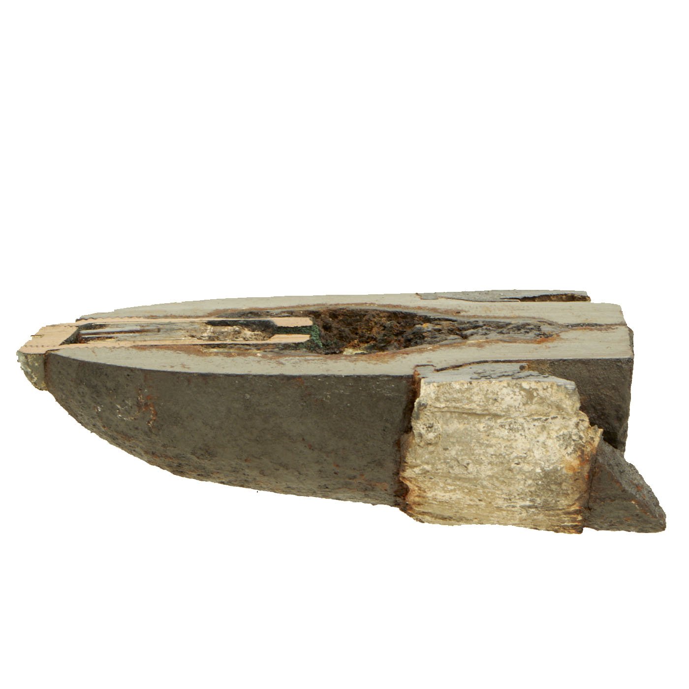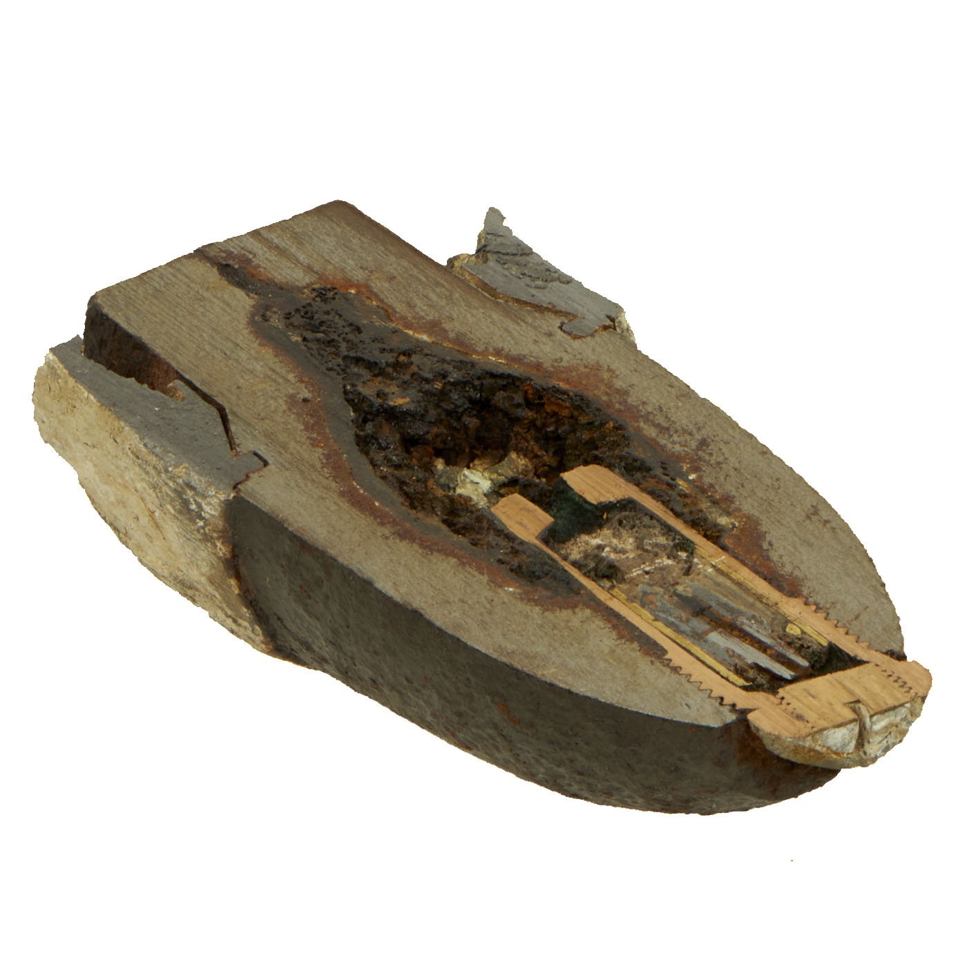 This shell has remnants of original black powder, which has now been rendered inert. The fuses are plainly visible in the cross section.