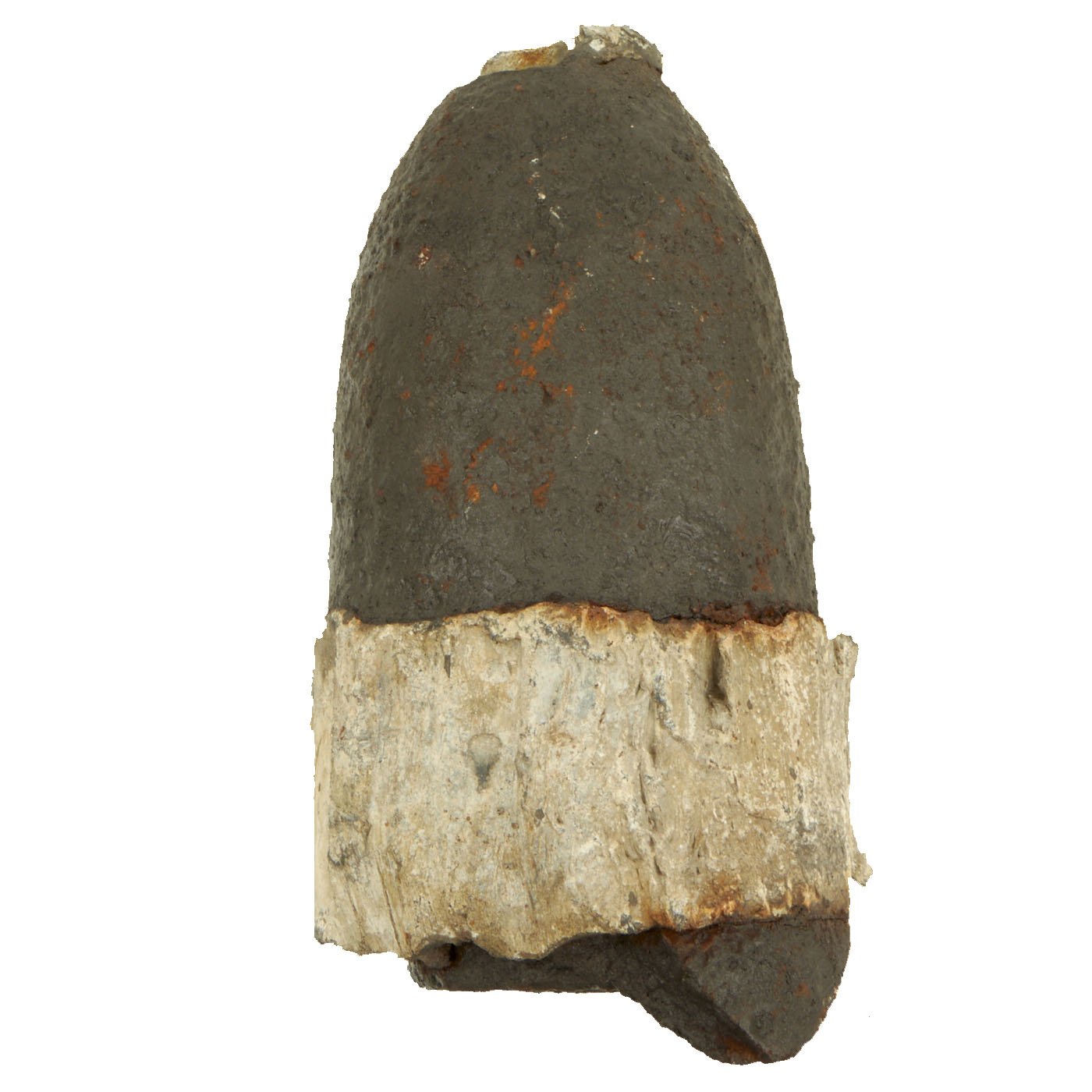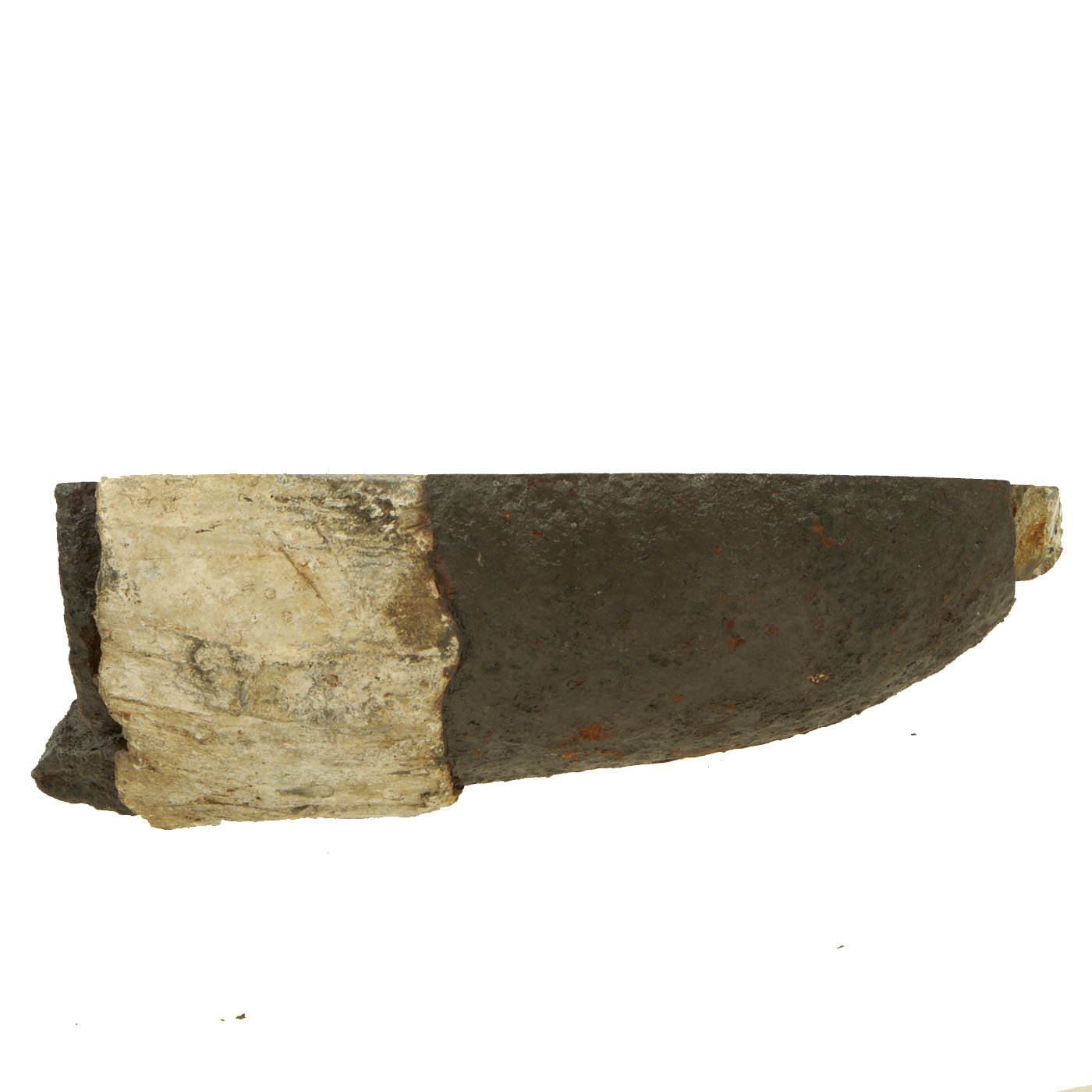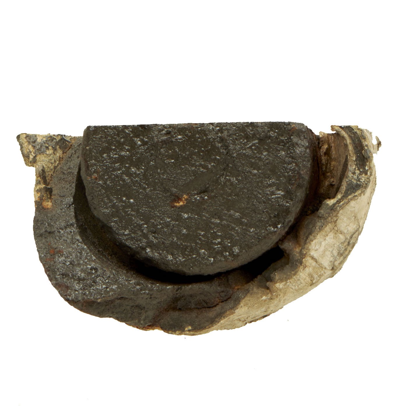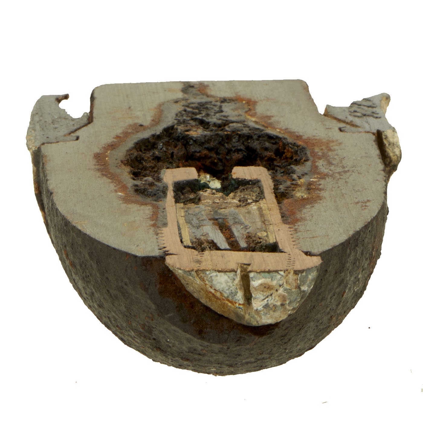 This item was excavated so the iron surface is pitted. Lead/zinc fuse band shows ground action on exterior, so no numbers remain visible. However, the embedded powder train within the band remains evident in the cross-section. The hole that lead to the inner charge from the fuse is also visible on this specimen.