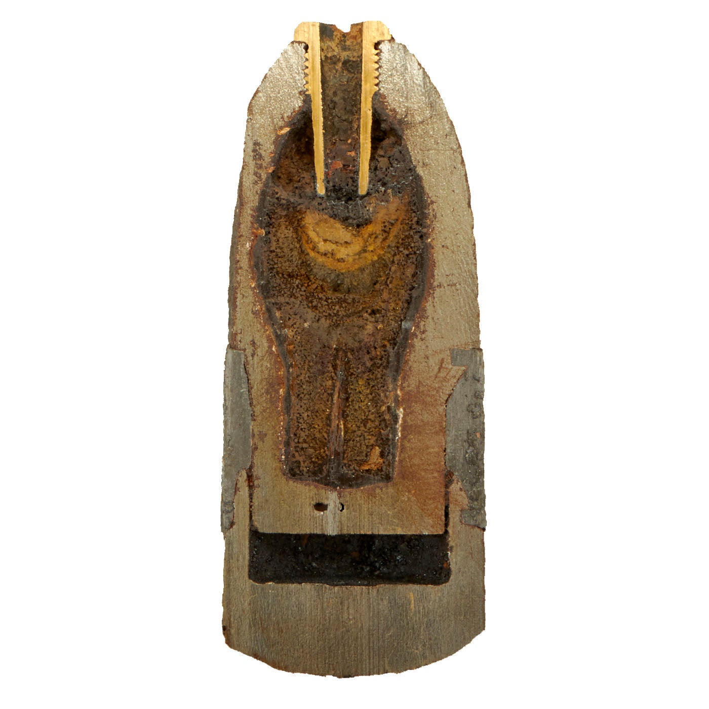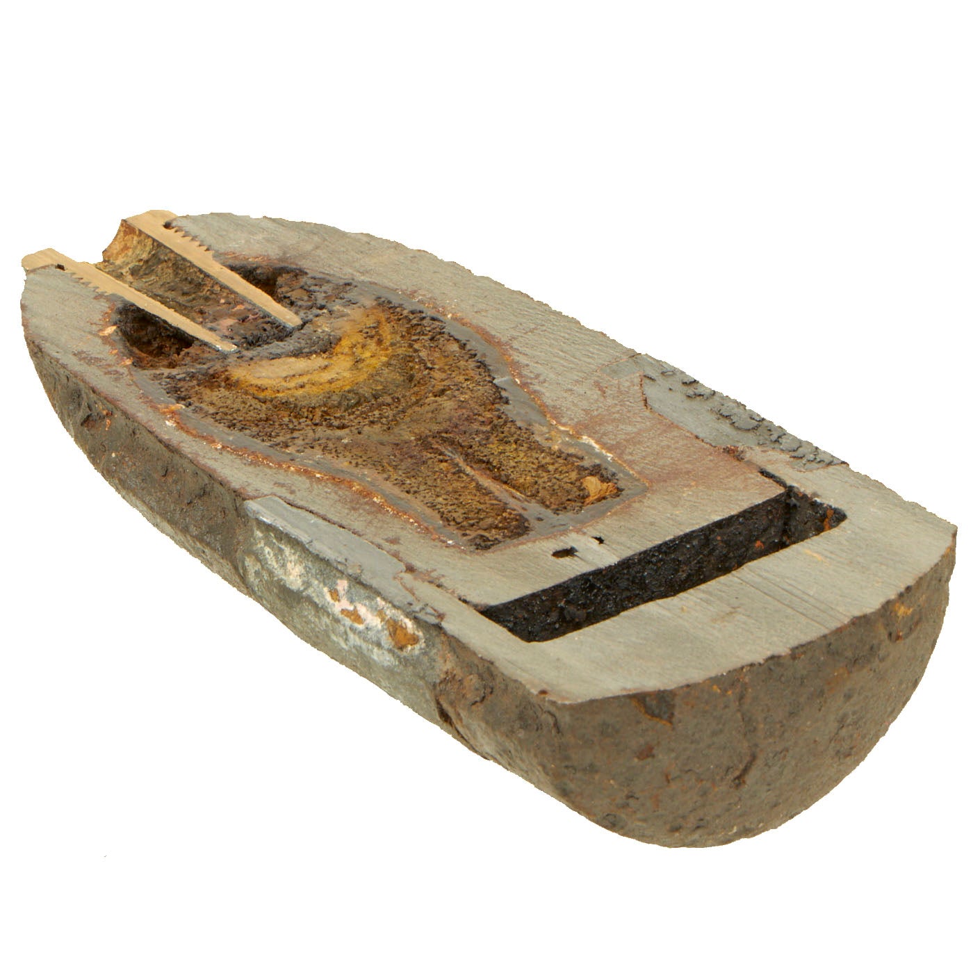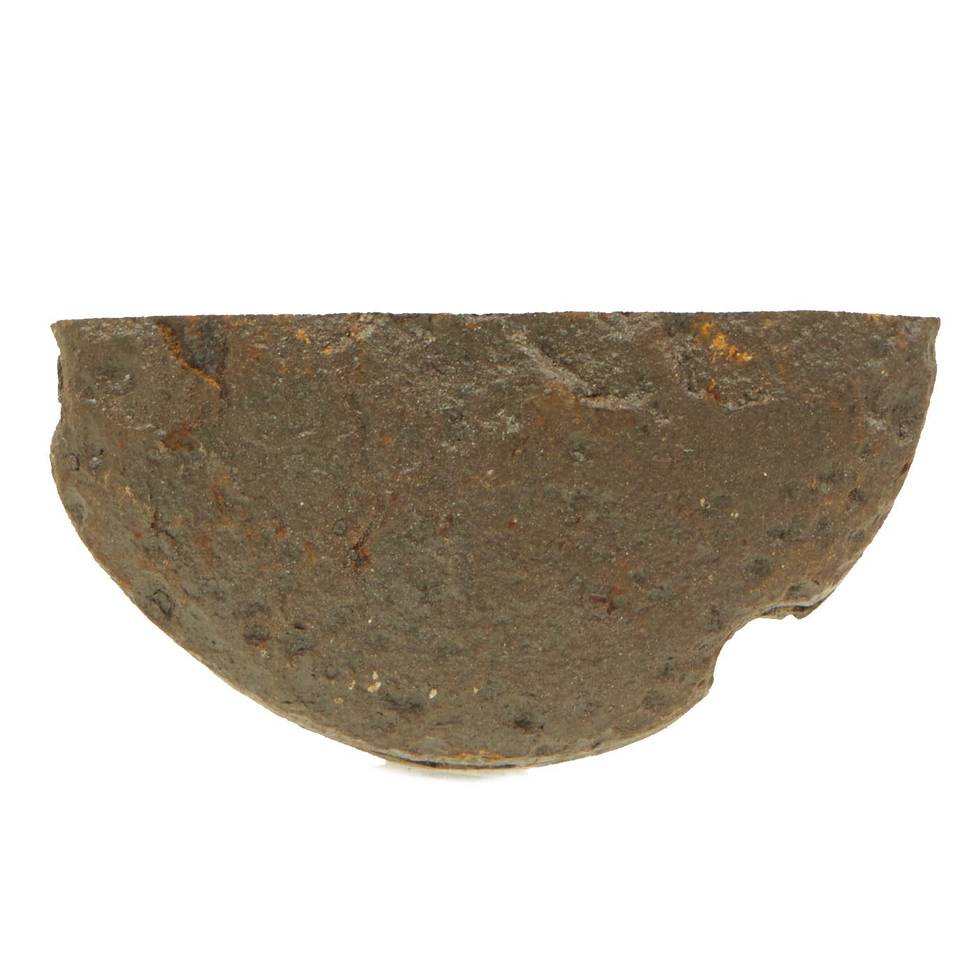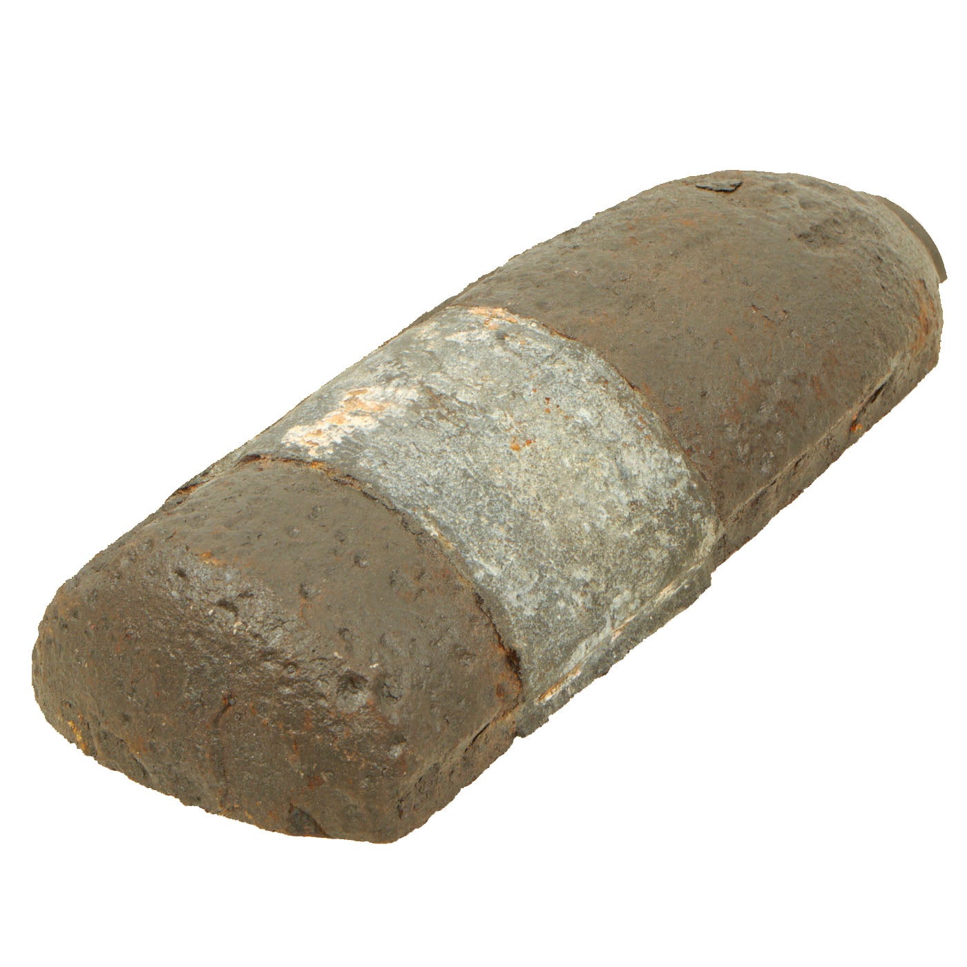 This item was excavated so the iron surface is pitted. Lead/zinc fuse band shows ground action on exterior, so no numbers remain visible. However, the embedded powder train within the band remains evident in the cross-section. The hole that leads to the inner charge from the fuse is also visible on this specimen.
