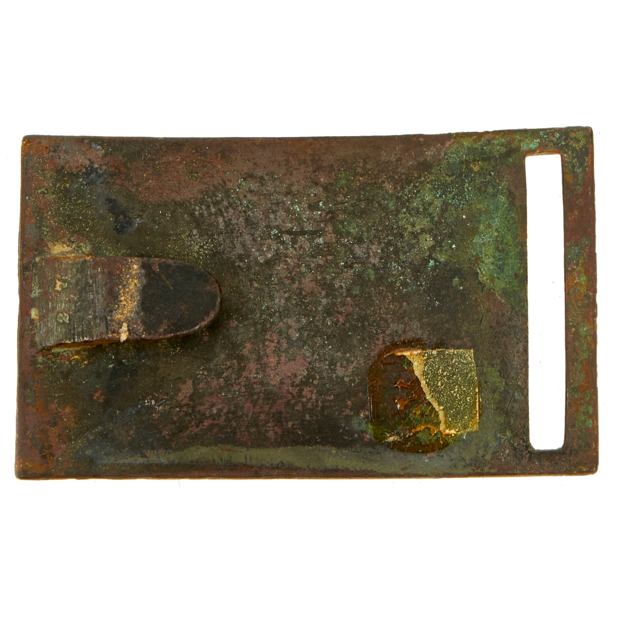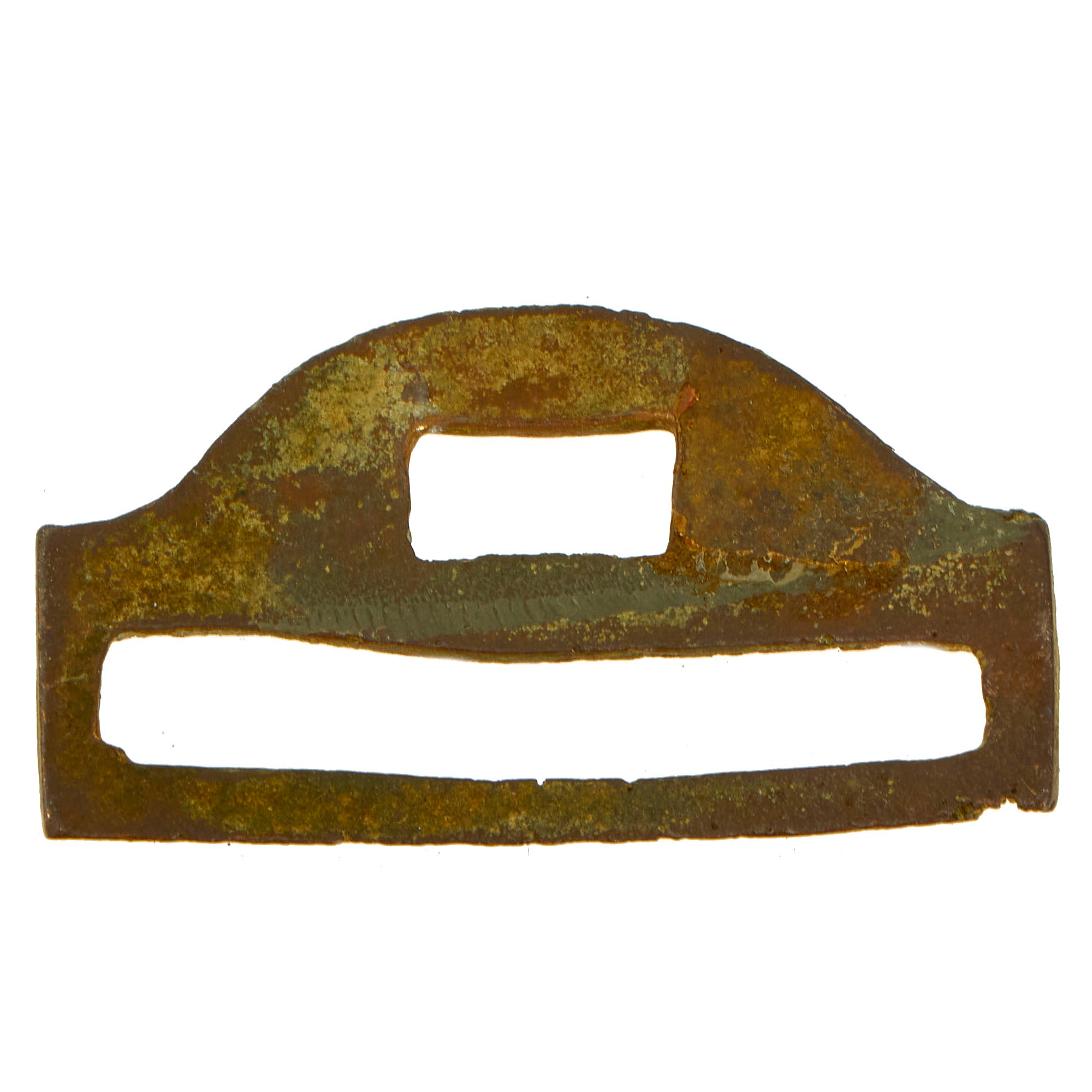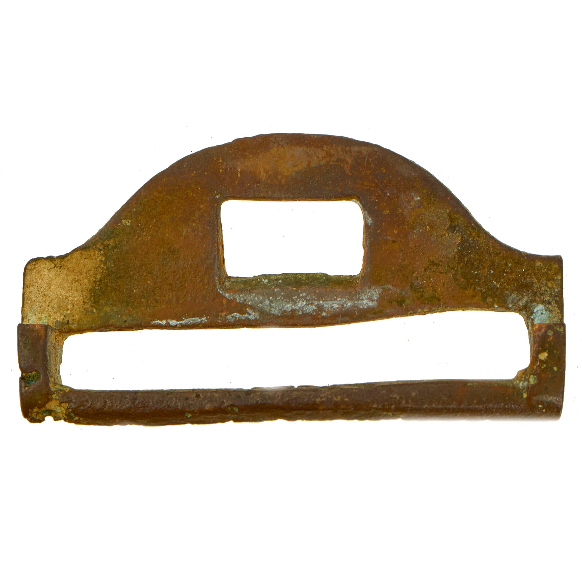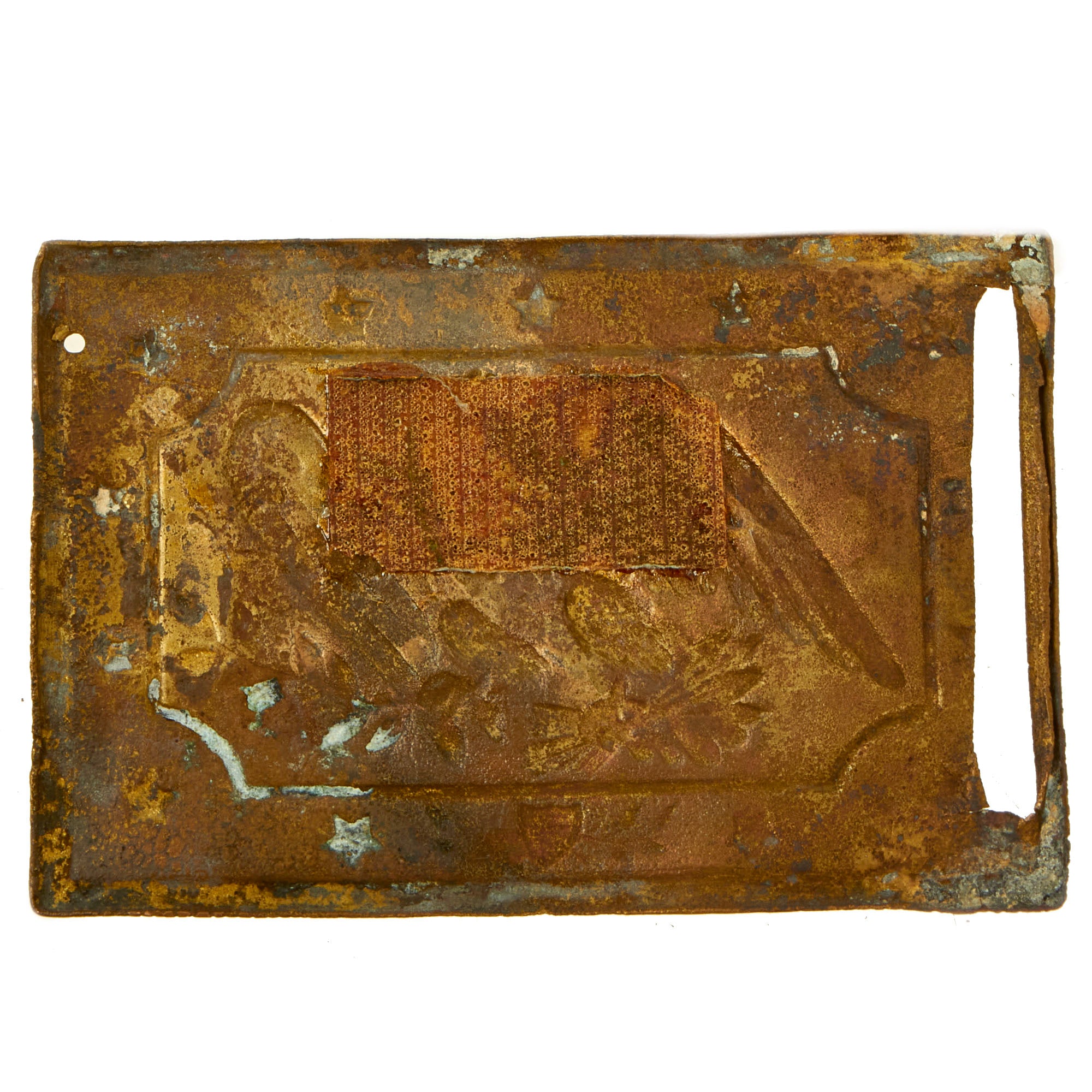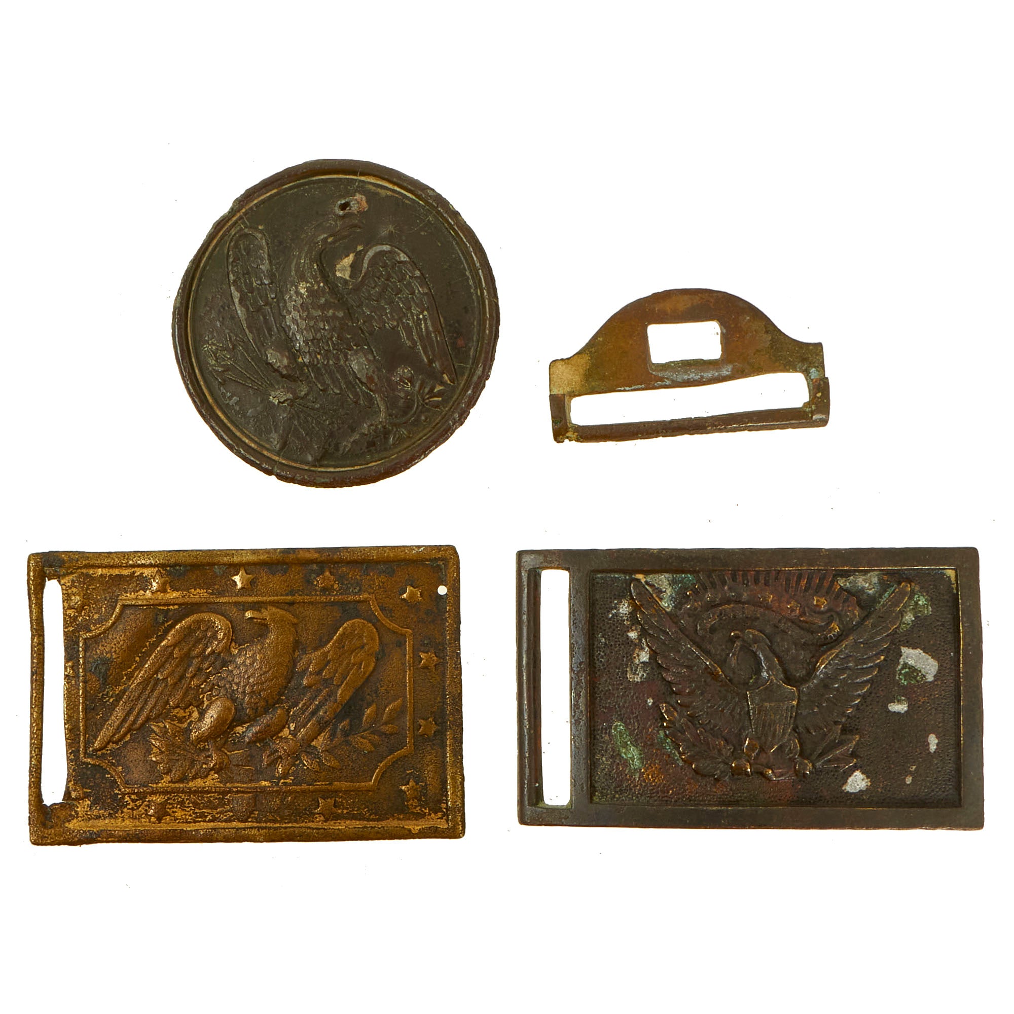 - M1851 Belt Buckle With Keeper: The regulation 1851 pattern, brass, eagle waist belt plate is the rectangular, concave, detailed plate that measures approximately 83 mm long x 53 mm high, the cast brass plate has an integral tongue on the reverse and the one-piece, nickel-silver wreath terminating beneath the eagle’s wings is unfortunately missing. The plate face has an even patina and exhibits well-defined edges. All the brass hardware retains a nice, aged patina.
