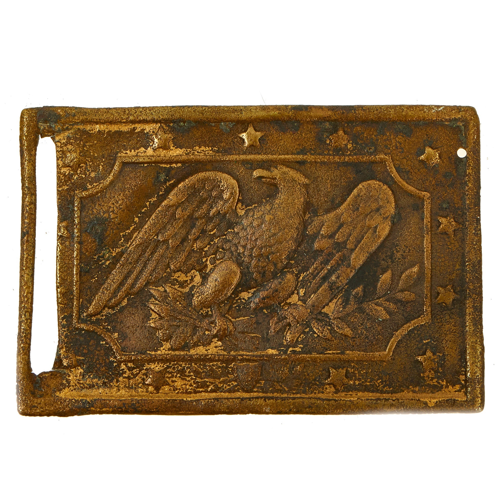- Modified Militia Belt Buckle: Militia rectangle panel plate, eagle facing right with relaxed wings surrounded by 13 stars This stock militia panel plate was available for purchase by the militia units, in the 1840's or 1850s. Most lost in the field were used by southerners, although they were originally supplied to units in both the north and the south.
