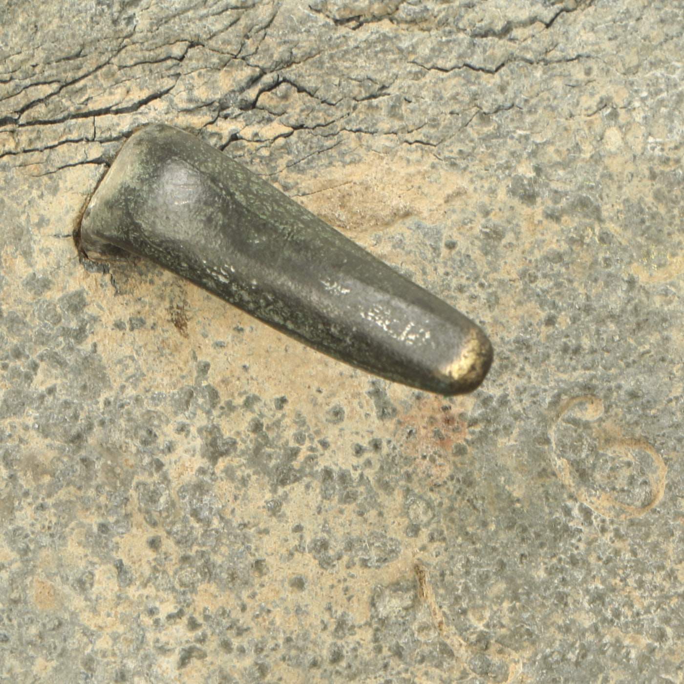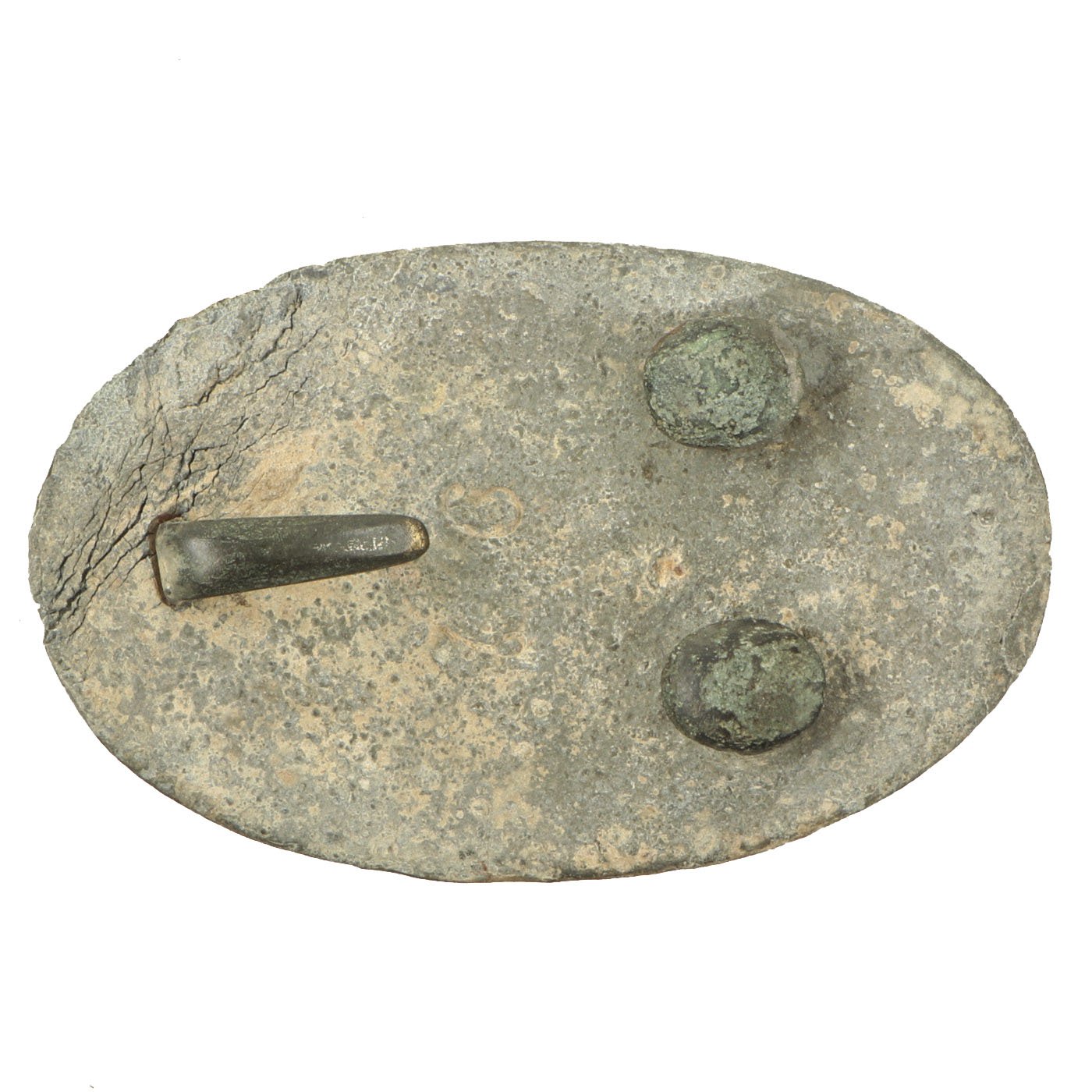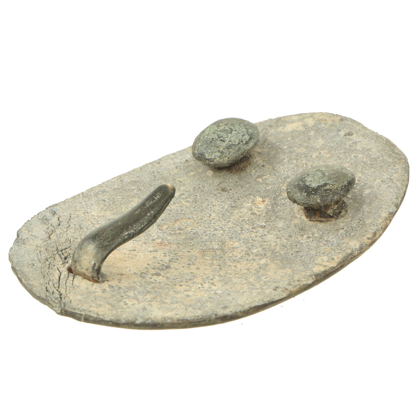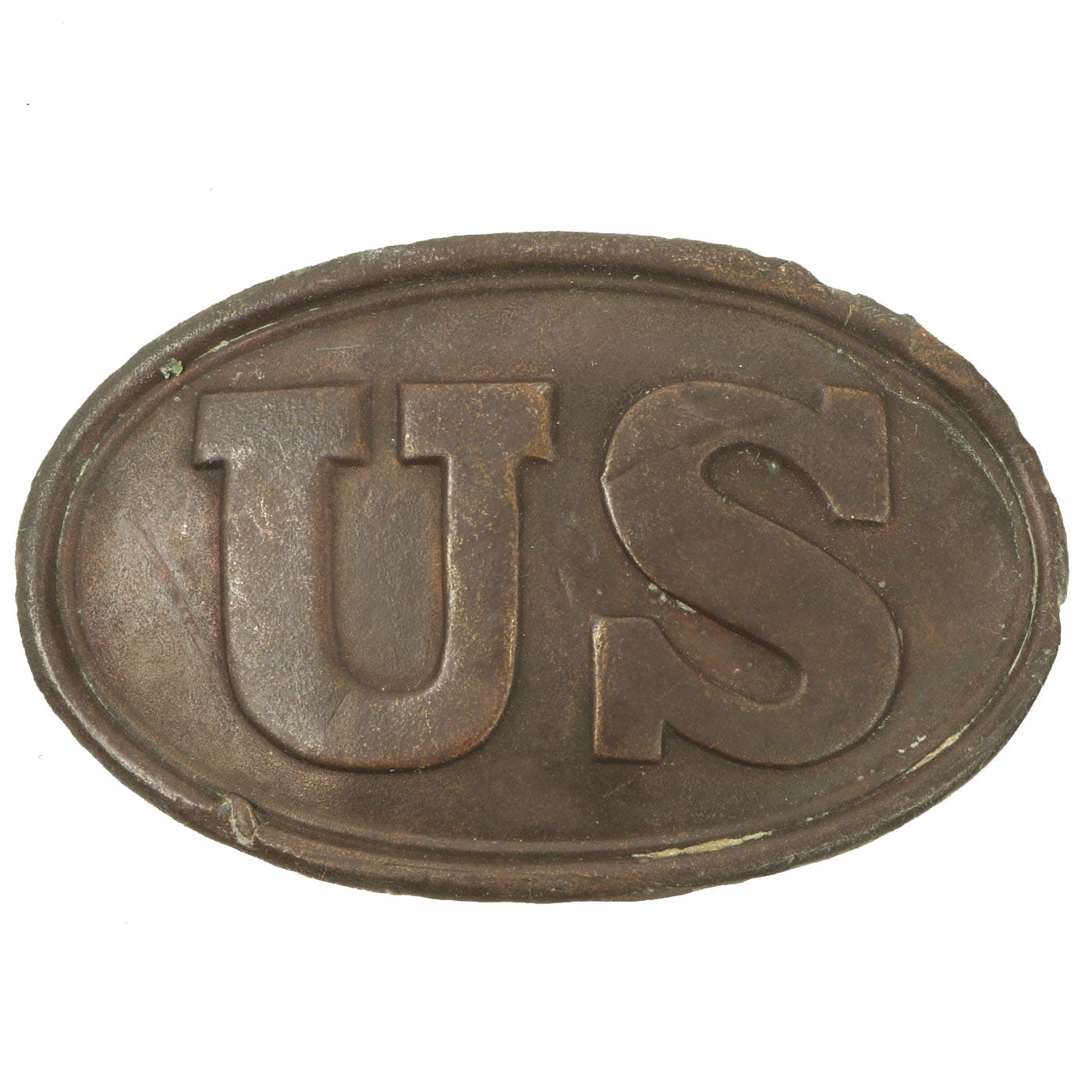 Original Item: Only One Available. This federal infantry waist belt plate is the early regulation 1839 pattern oval US belt buckle and has a smooth brown patina with "puppy paw" style attachment studs on the reverse. The plate measures measures approximately 3.5” x 2.25”. The condition is near excellent and was not excavated (not dug up). This die-stuck specimen has the large raised letters "US" on the face and exhibits a wonderful dark bronze patina overall. The backside of the plate, complete with its brass puppy paw hooks all intact, is lead filled and still in strong condition with just a hint of surface erosion to the lead. There are however some cracks from bending near the edges. It has been stamped with the number 7 6 into the lead. The face of the convex plate is edged with double borders, with some light denting in areas. One of the nicer examples of a early 1839 pattern we have encountered.