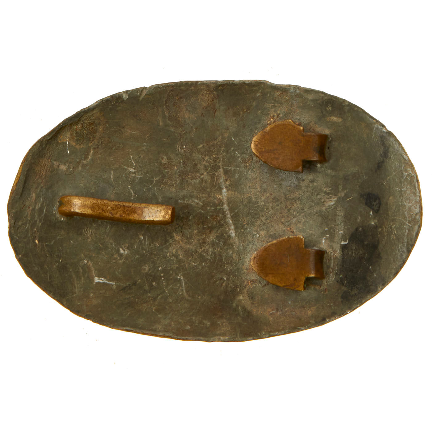The condition is very good and was not excavated (not dug up). This die-stuck specimen has the large raised letters "US" on the face and exhibits a wonderful dark bronze patina overall. The backside of the plate, complete with its brass hooks all intact, is lead filled and still in strong condition with some corrosion to the lead. The face of the convex plate is edged with double borders, with some light denting in areas around the edge. One of the nicer examples of an early 1839 pattern we have encountered.