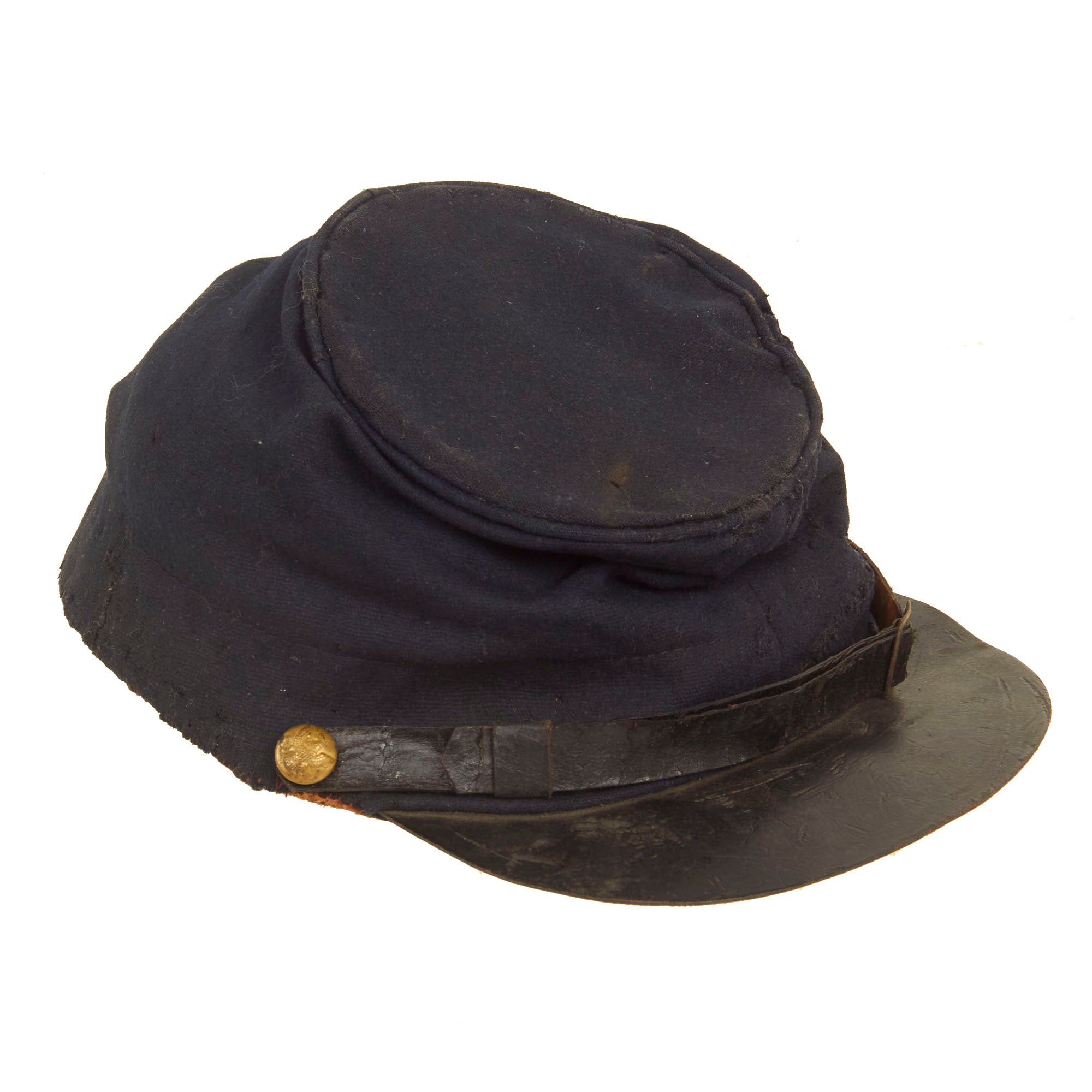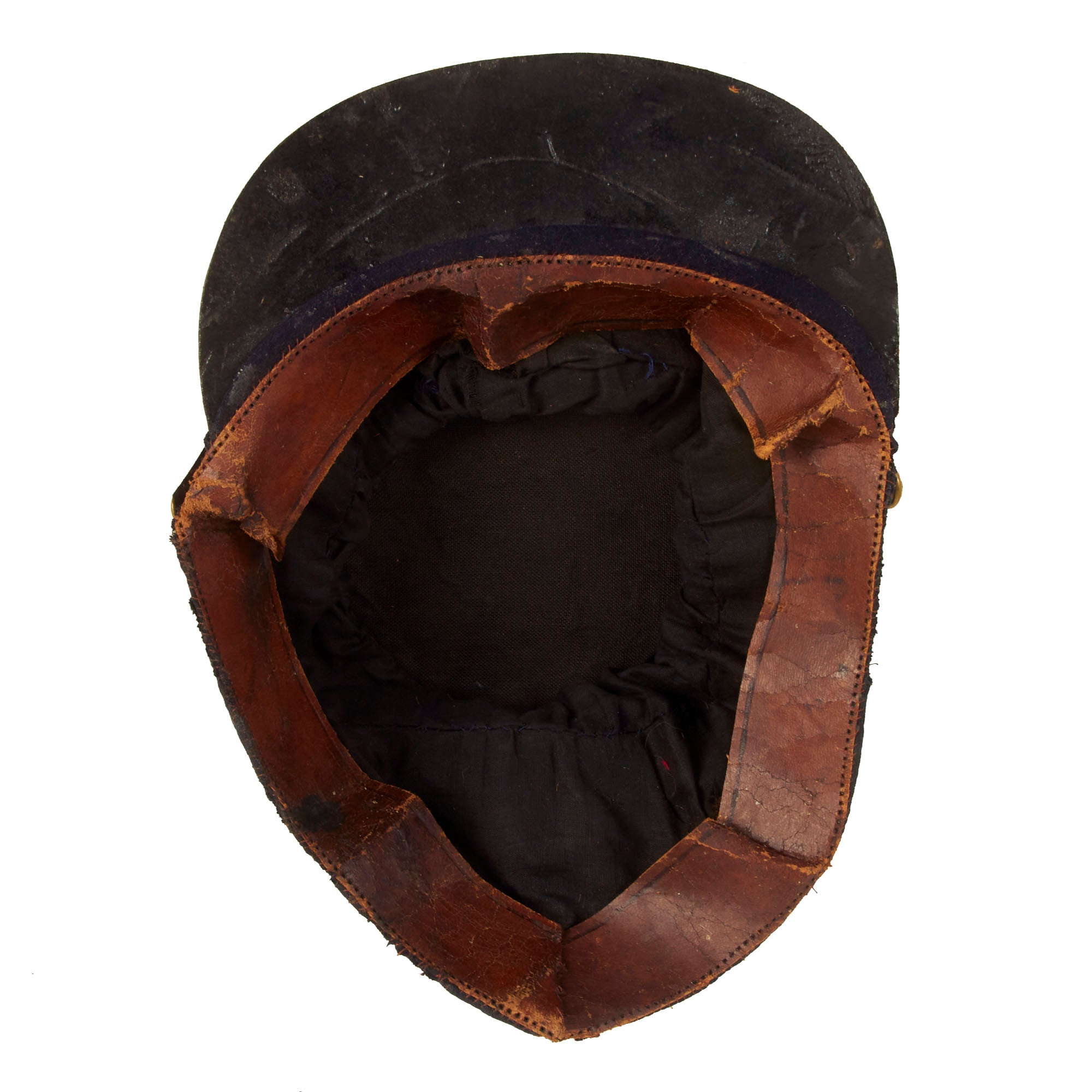 Original Item: Only One Available. This is a rare example of a Civil War Union enlisted Federal Issue Regulation 1858 Pattern Forage Cap that features fabric of very fine blue wool broadcloth. The crown stands nearly 3 ¼” high at the front, 5” at the rear seam and the top is 5 ¼” in diameter, stiffened with a pasteboard beneath the lining. The body of the cap meets a band of wool seamed only at the rear and stiffened with leather. The cap's interior is lined with lovely brown cotton and is still mostly intact but does have fraying. The leather sweatband is 1 5/8" wide and is presented with cracks but is still somewhat solid. The flat visor is original to the hat, and composed of tarred leather and is still mostly attached. The leather chinstrap is secured on the side with two Federal Eagle buttons.