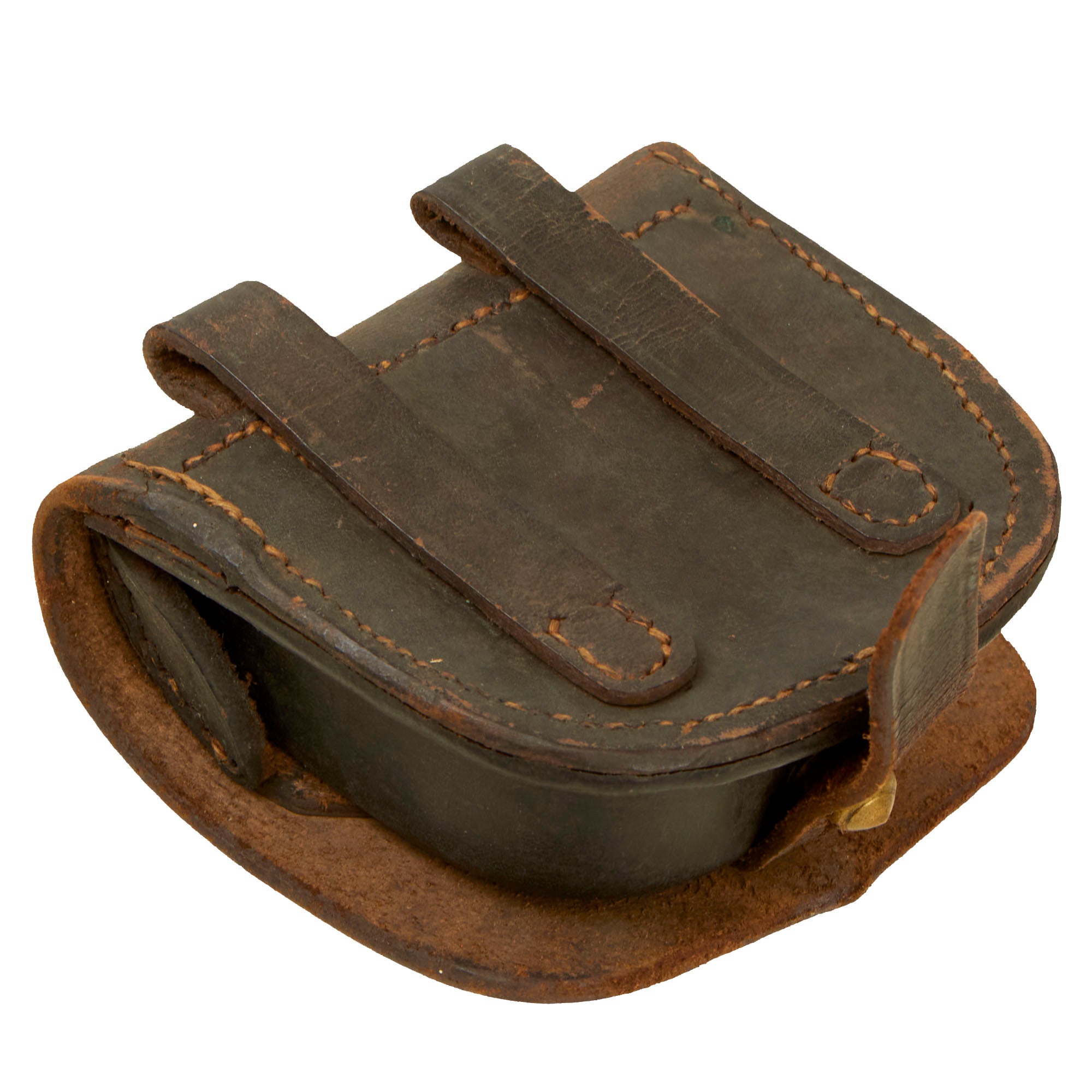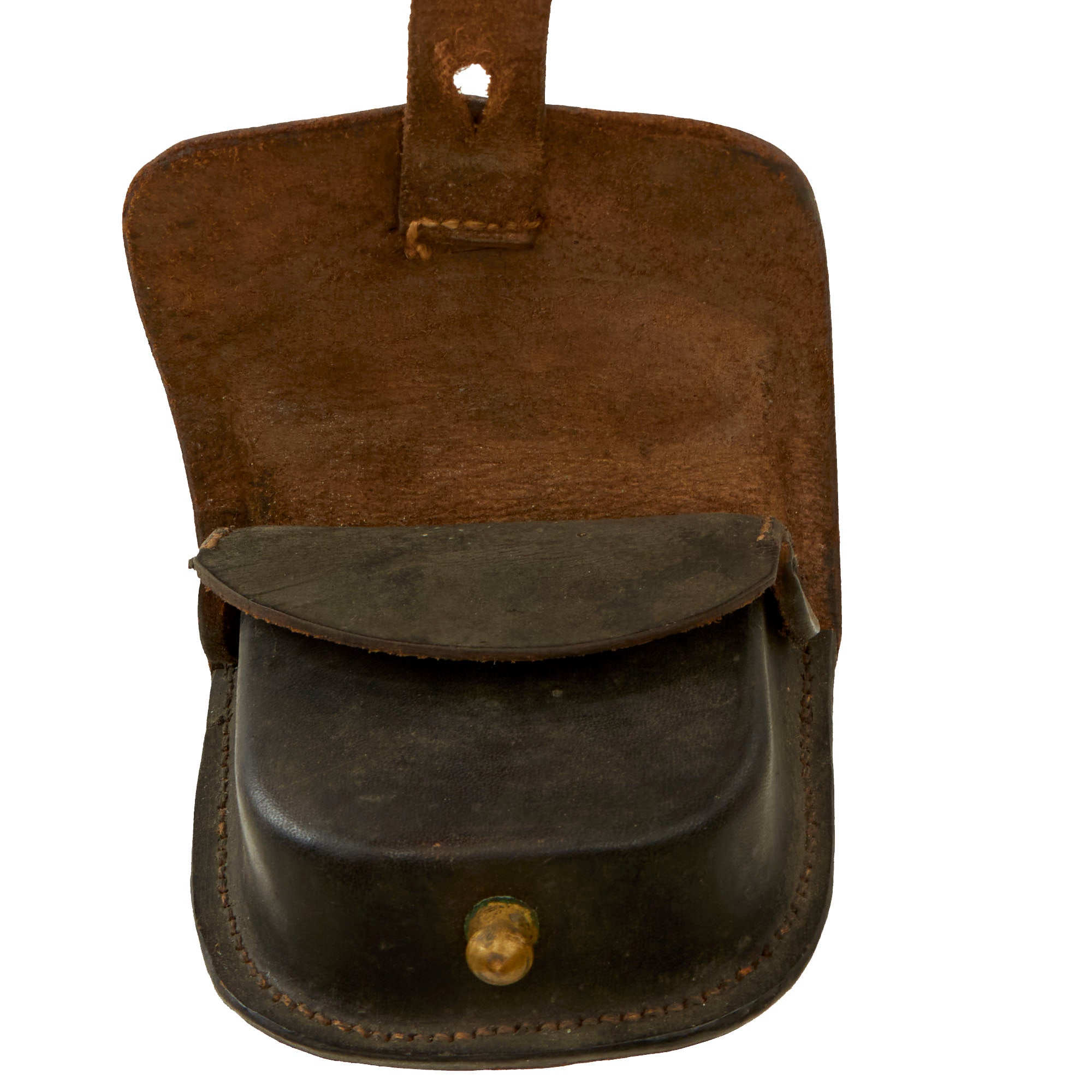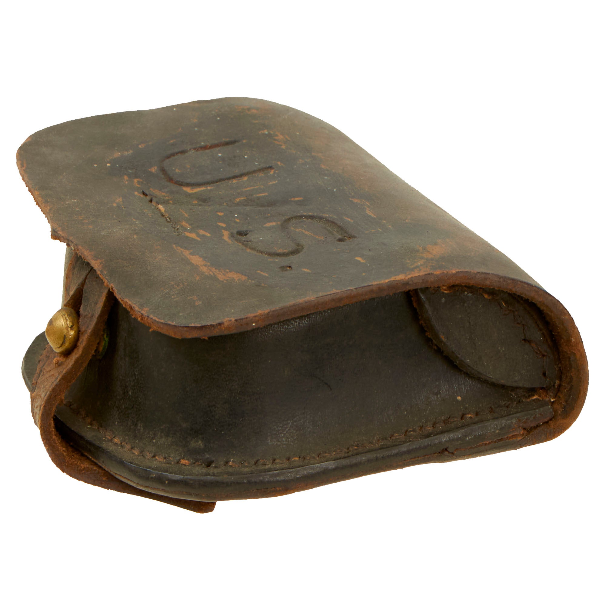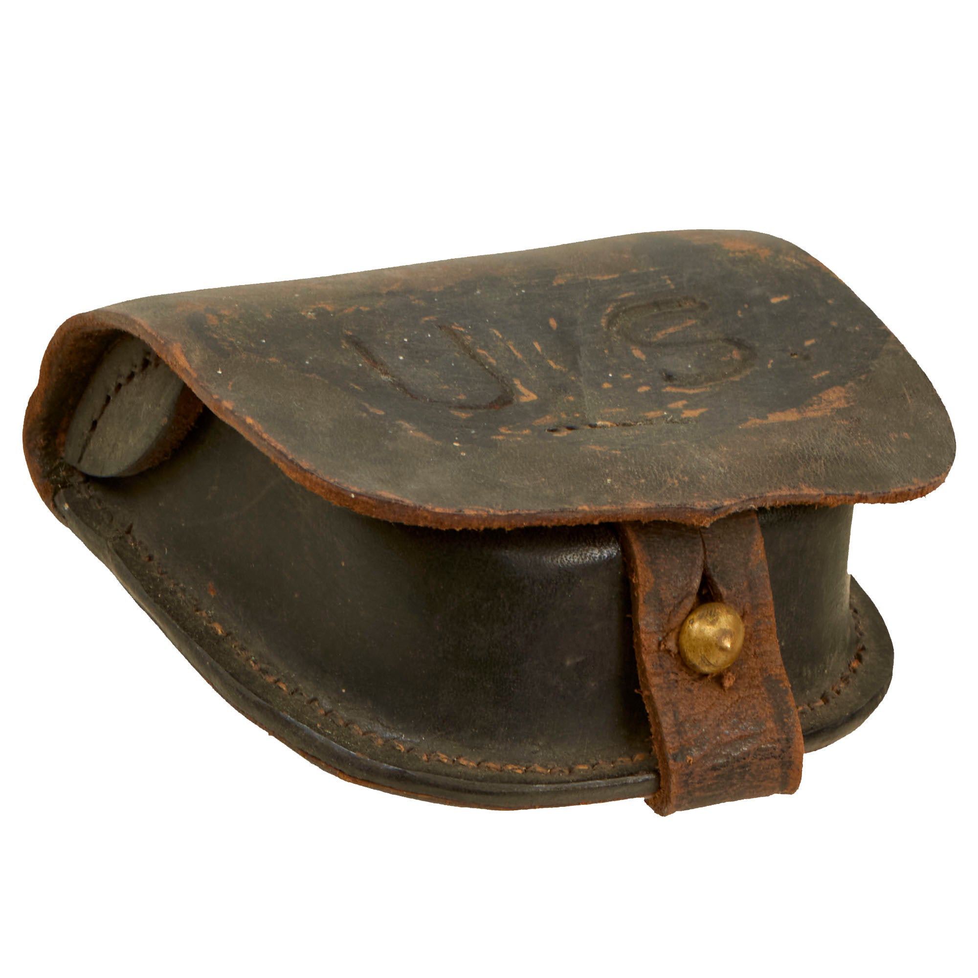 Original Item: Only One Available. This leather percussion cap box is a fine, complete example of a Federal pattern accoutrement carried by US Infantrymen during the Civil War. The brown leather specimen is in very strong condition. Cap box construction exhibits seam stitching that is strong and tight, with riveted ends to the belt loops. The brown leather outer flap is supple and exhibits a surface with moderate cracking overall, with the stitching being very weak.