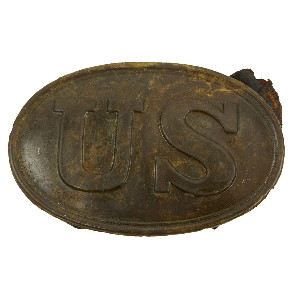 Original Item: Only One Available. This is a very nice Federal 1839 Pattern Brass Belt Plate Buckle, made from the standard lead-filled cast brass. It had a lovely patina on the front side, and has later wartime pattern brass "arrowhead" style attachment studs on the reverse. The plate measures measures approximately 3 3/8” x 2 1/8”, and even has remnants of the original leather belt still attached around the attachment studs.