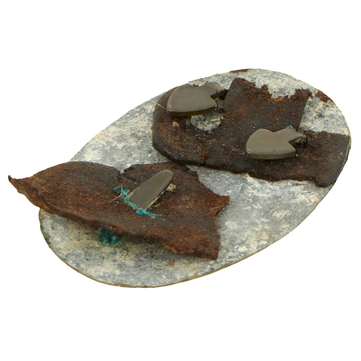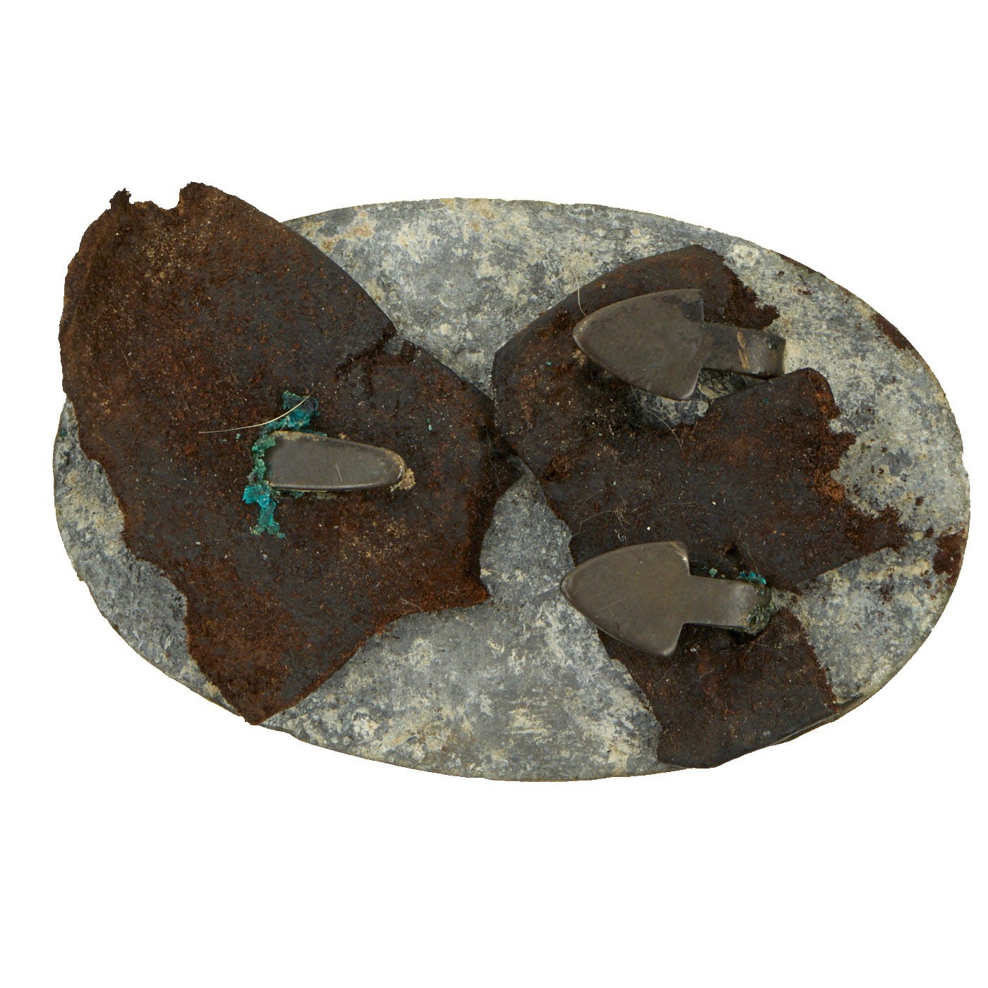The condition is very good and was not excavated (not dug up). This die-stuck specimen has the large raised letters "US" on the face and exhibits a wonderful dark bronze patina overall. The backside of the plate, complete with its brass hooks all intact, is lead filled and still in strong condition with some corrosion to the lead. The face of the convex plate is edged with double borders, with some light denting in areas around the edge. One of the nicer examples of a early 1839 pattern we have encountered.