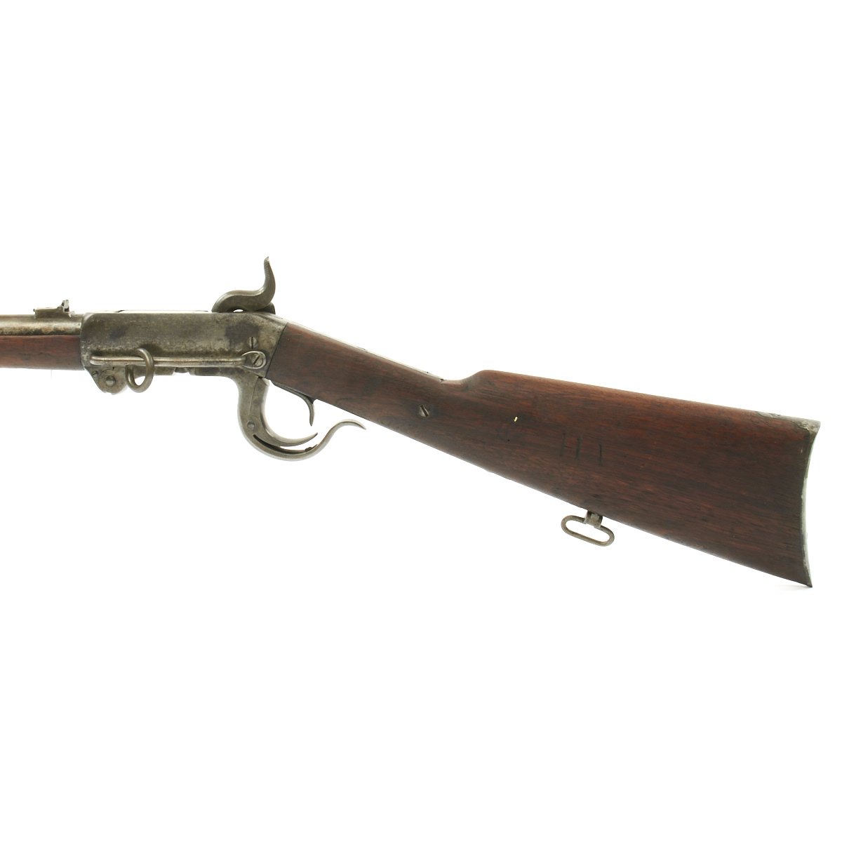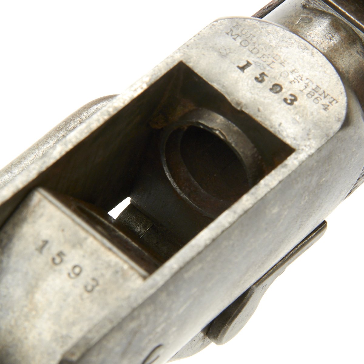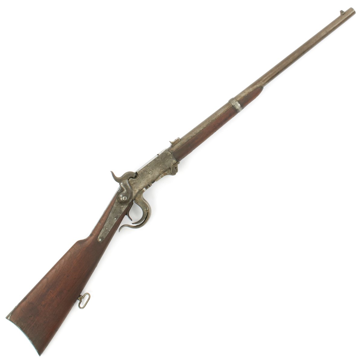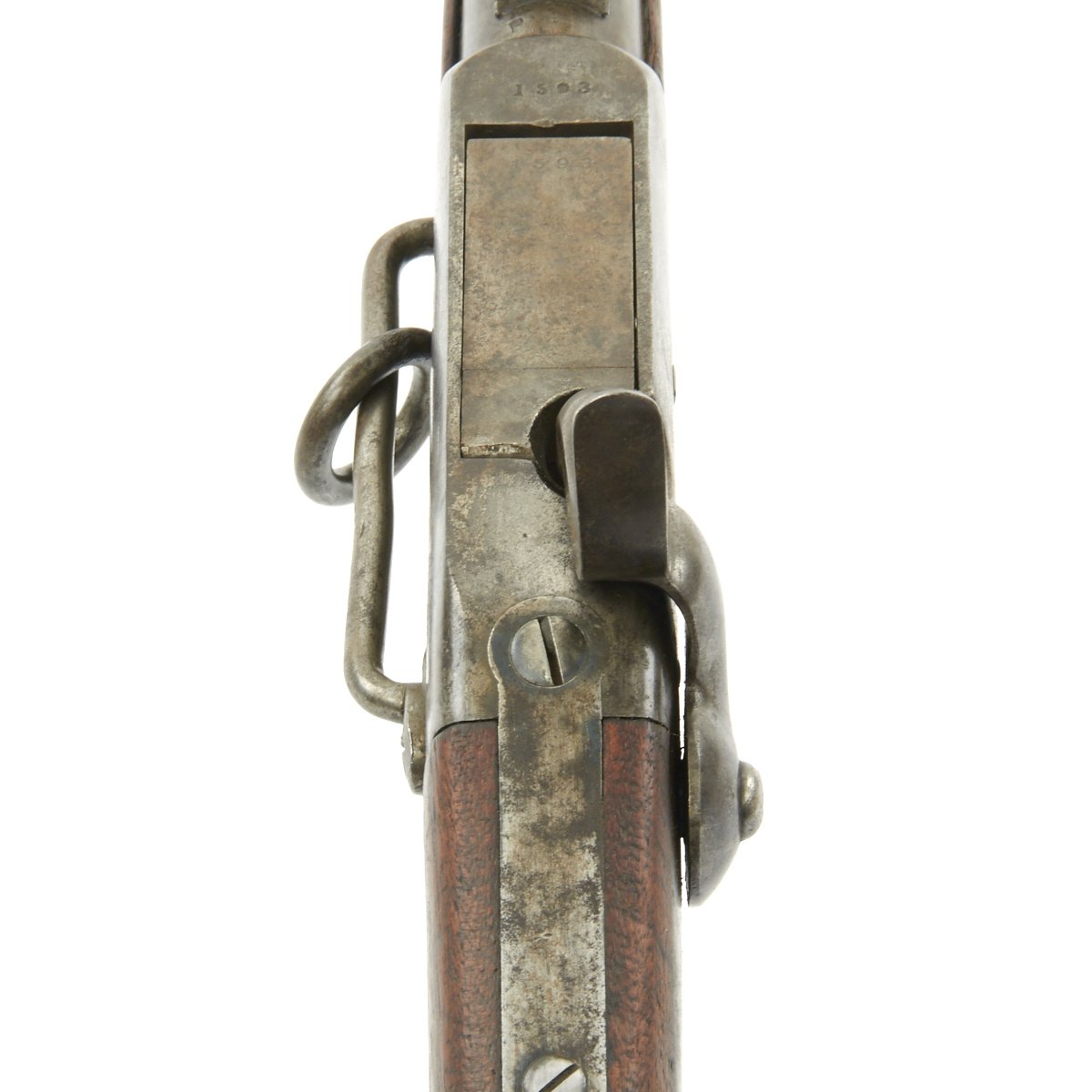 Original Item: Only One Available. This Burnside Cavalry "Saddle-Ring" Carbine in .54 caliber is offered in very good collectible condition. It is marked on the frame and breech block with serial number 1593, which is quite low in the production. This example, known as the "Fifth Model" or model of 1864, is in very nice shape and retains some of the original blue on the barrel, with a clean wood stock and comes complete with saddle ring. The top of the frame is marked: