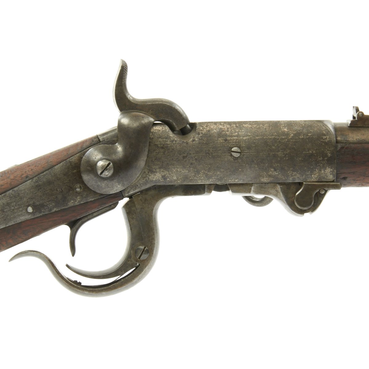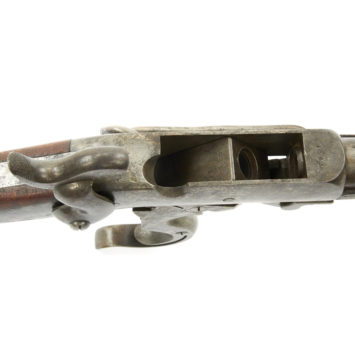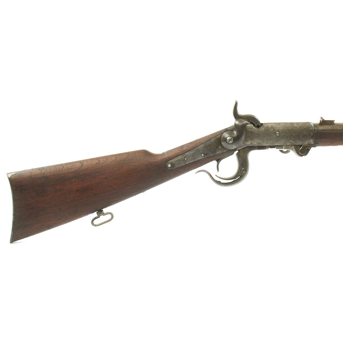 Original Item: Only One Available. This Burnside Cavalry "Saddle-Ring" Carbine in .54 caliber is offered in very good collectible condition. It is marked on the frame and breech block with serial number 1593, which is quite low in the production. This example, known as the "Fifth Model" or model of 1864, is in very nice shape and retains some of the original blue on the barrel, with a clean wood stock and comes complete with saddle ring. The top of the frame is marked: