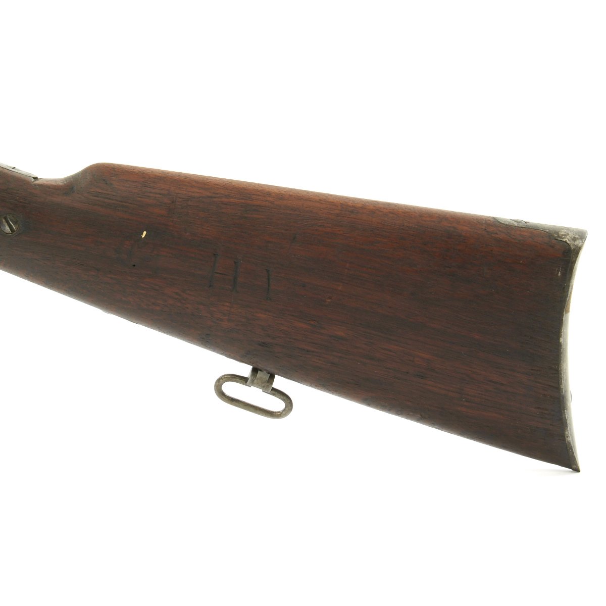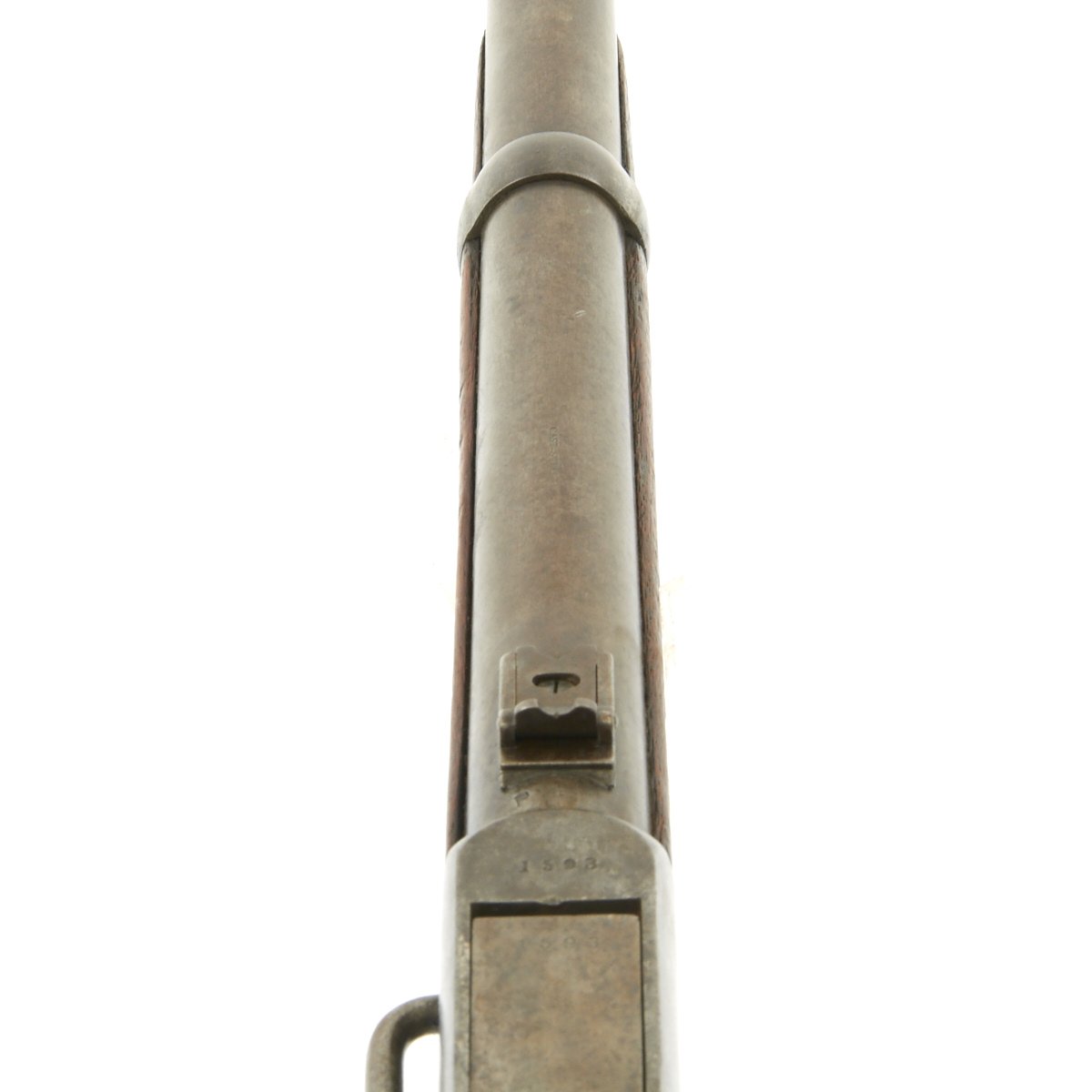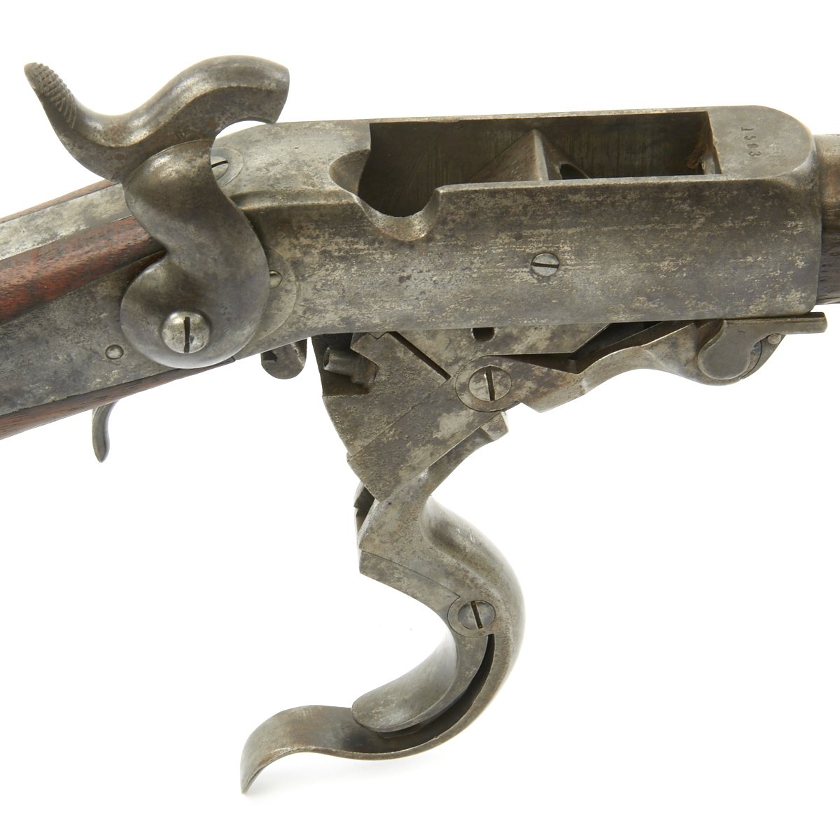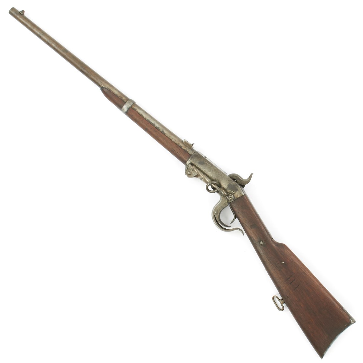 Original Item: Only One Available. This Burnside Cavalry "Saddle-Ring" Carbine in .54 caliber is offered in very good collectible condition. It is marked on the frame and breech block with serial number 1593, which is quite low in the production. This example, known as the "Fifth Model" or model of 1864, is in very nice shape and retains some of the original blue on the barrel, with a clean wood stock and comes complete with saddle ring. The top of the frame is marked: