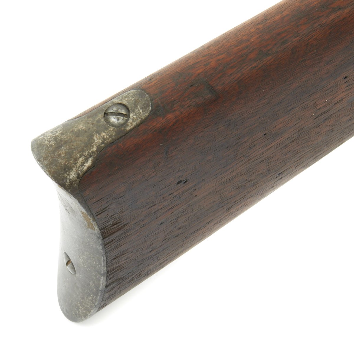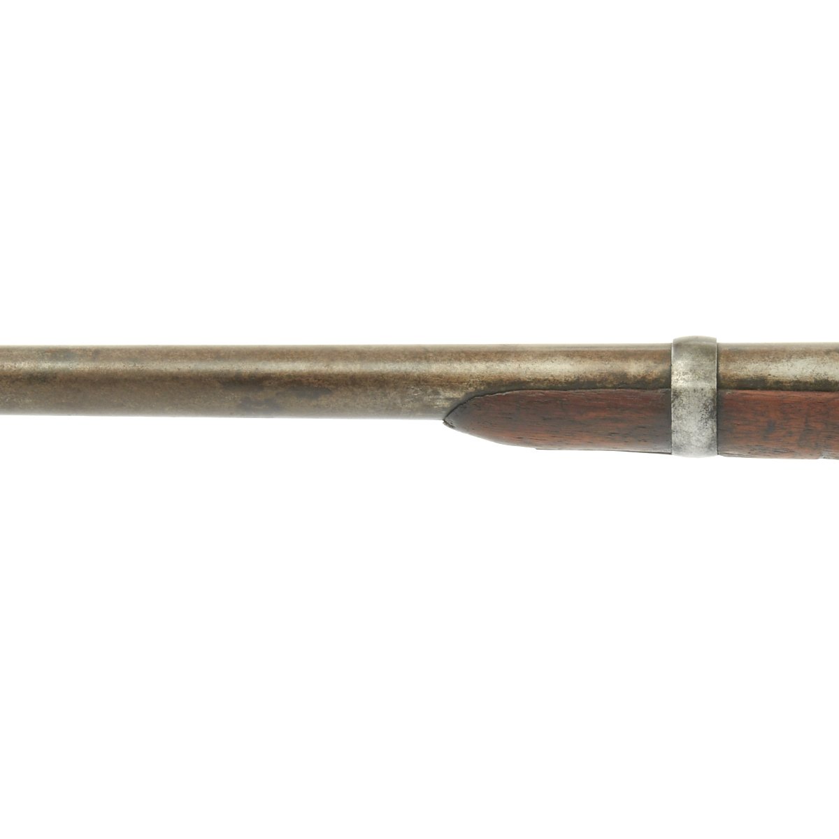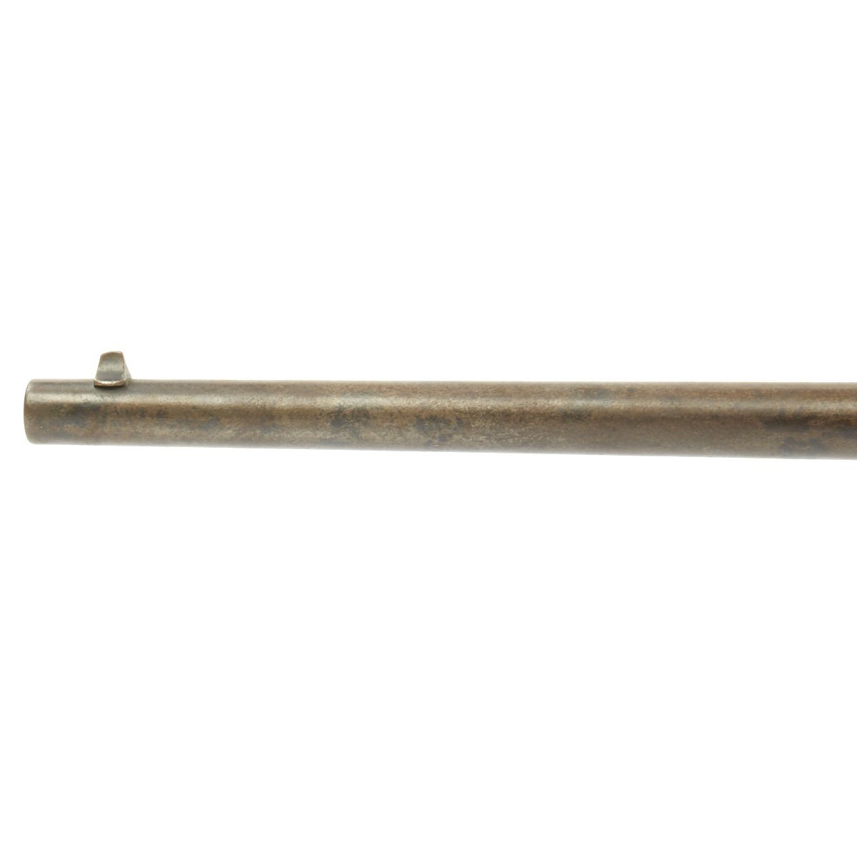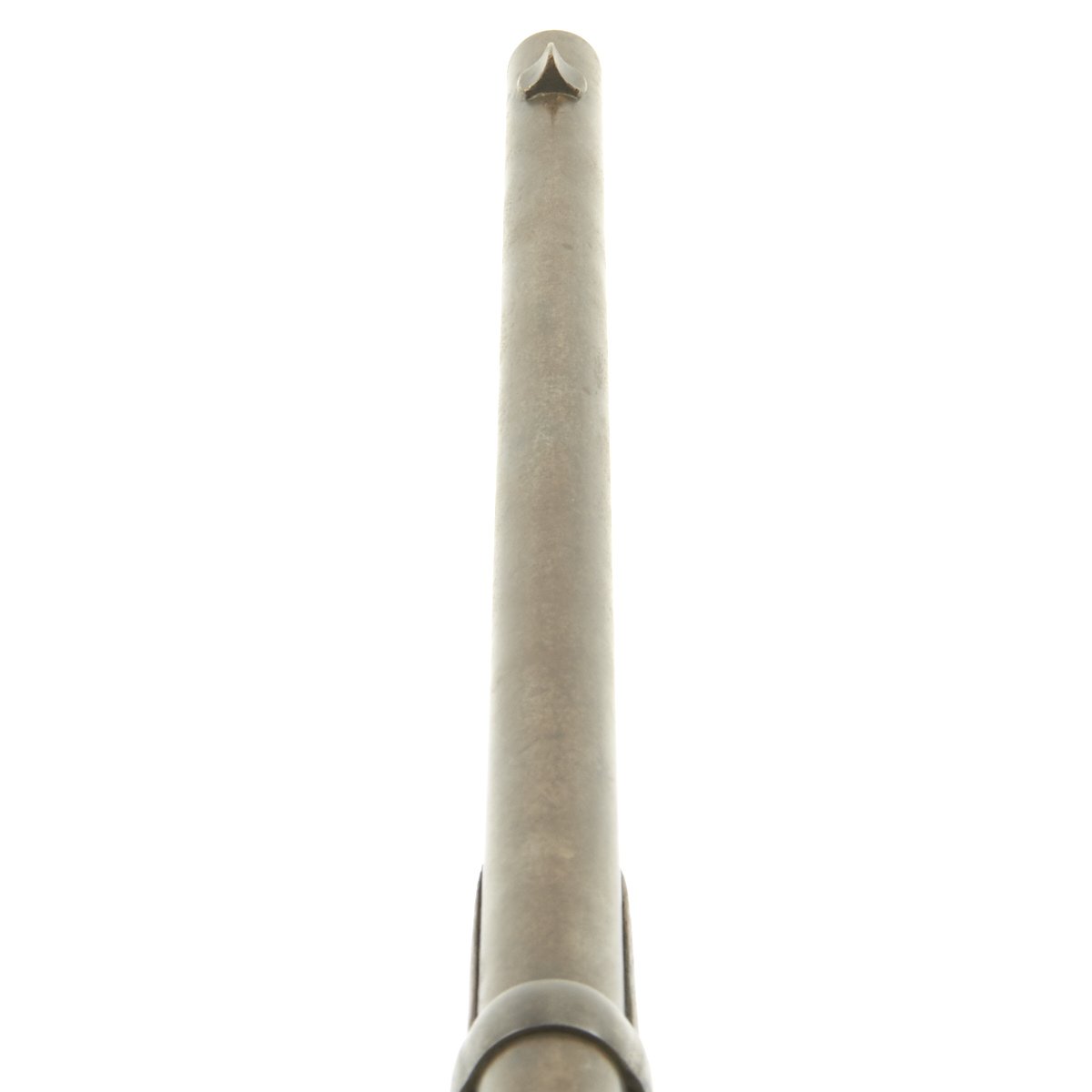 Additionally, it is marked CAST STEEL 186[2] on the barrel in front of the sight. Overall metalwork condition is good, though repeated cleaning has removed most of the finish on the action, and there is evidence of light pitting. The finish on the barrel is quite good on the exterior. The 5 groove rifled bore is very good with strong lands and grooves, though there definitely is some oxidation and powder fouling.