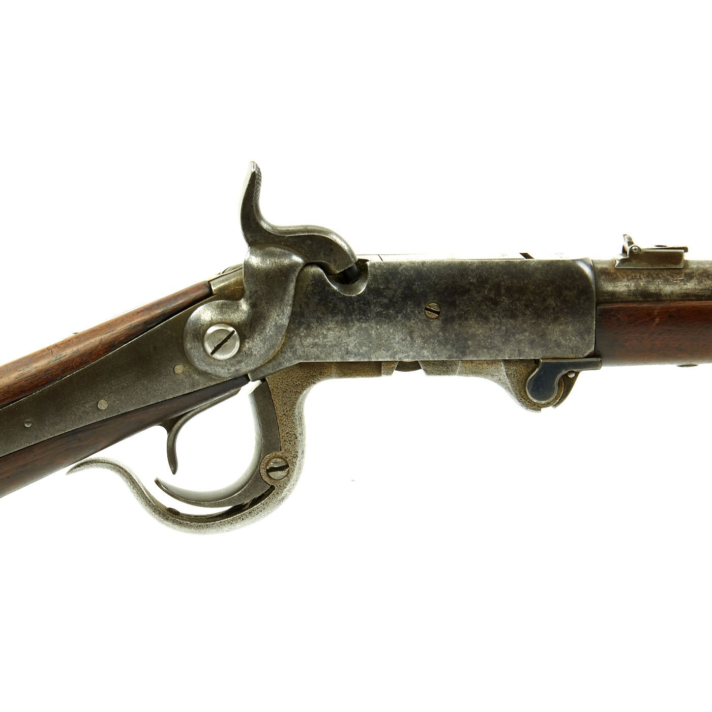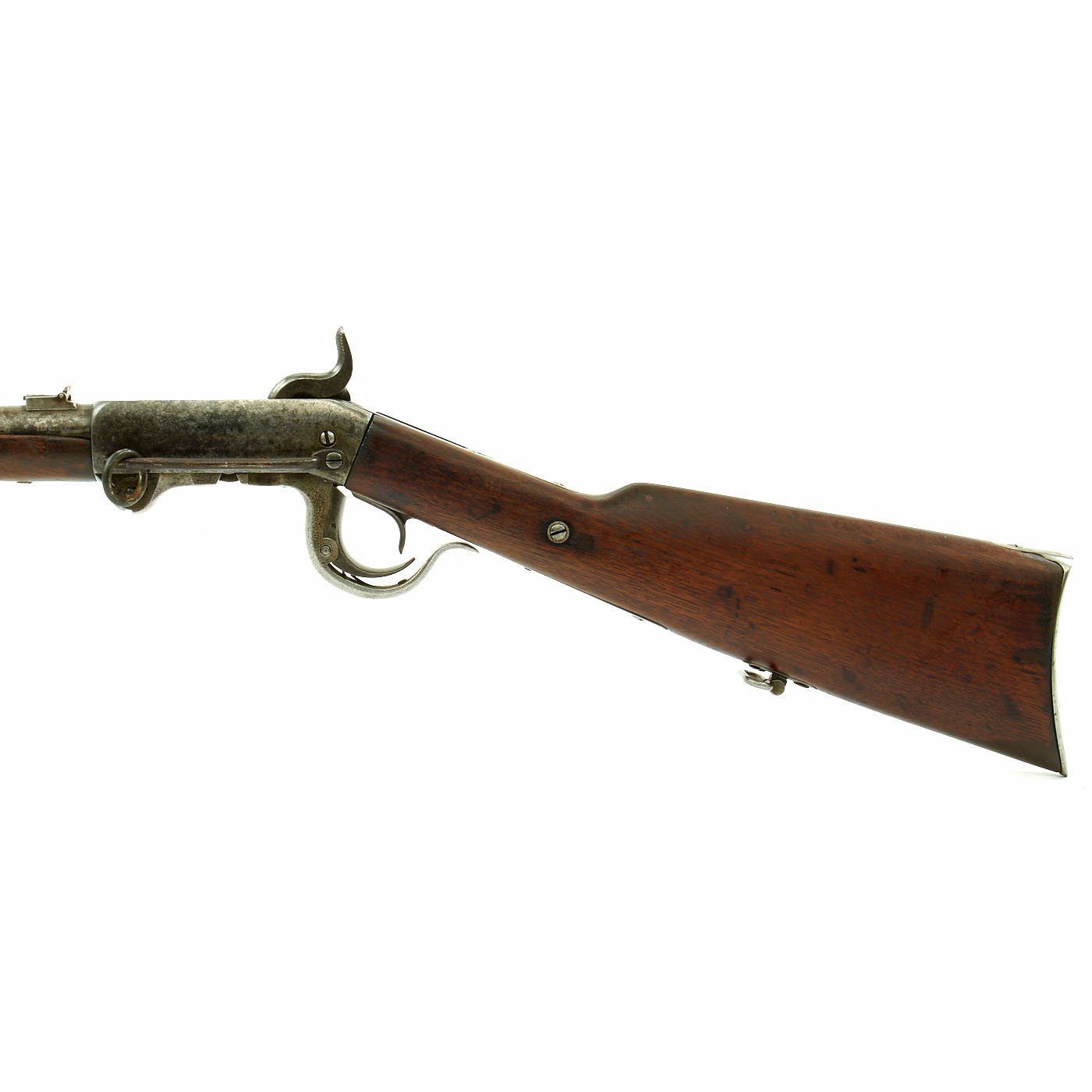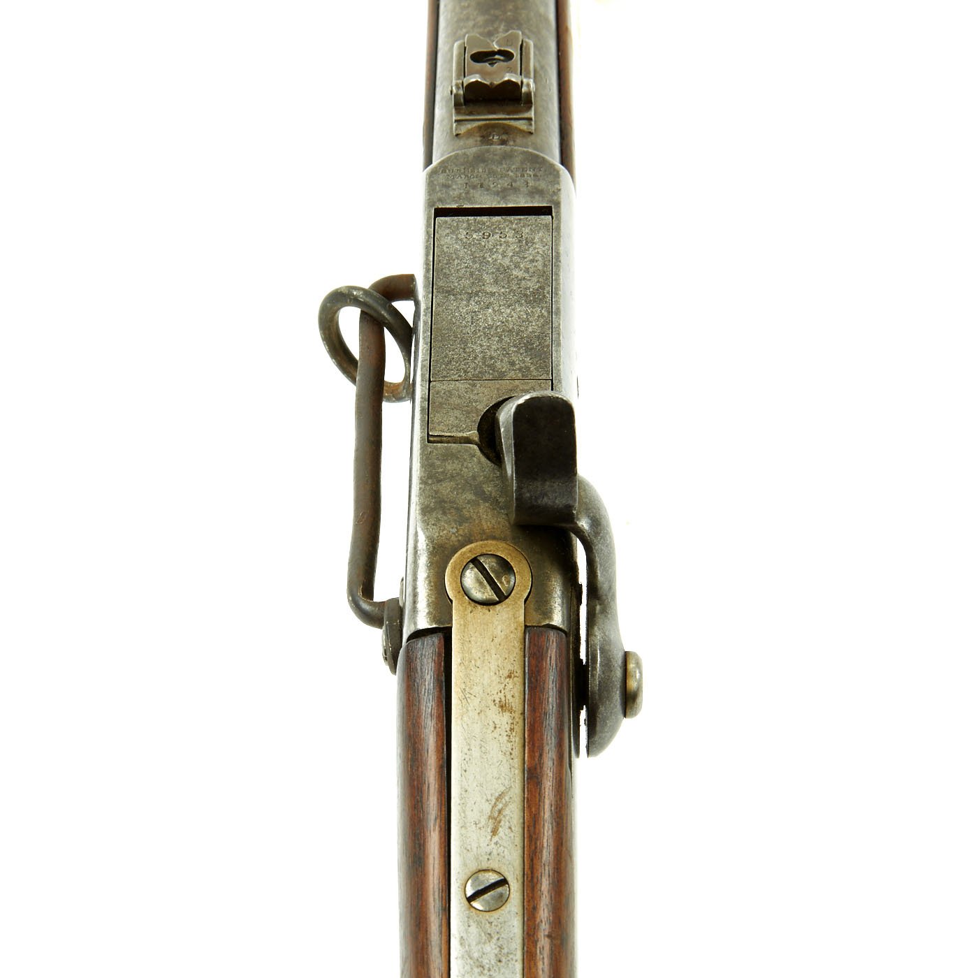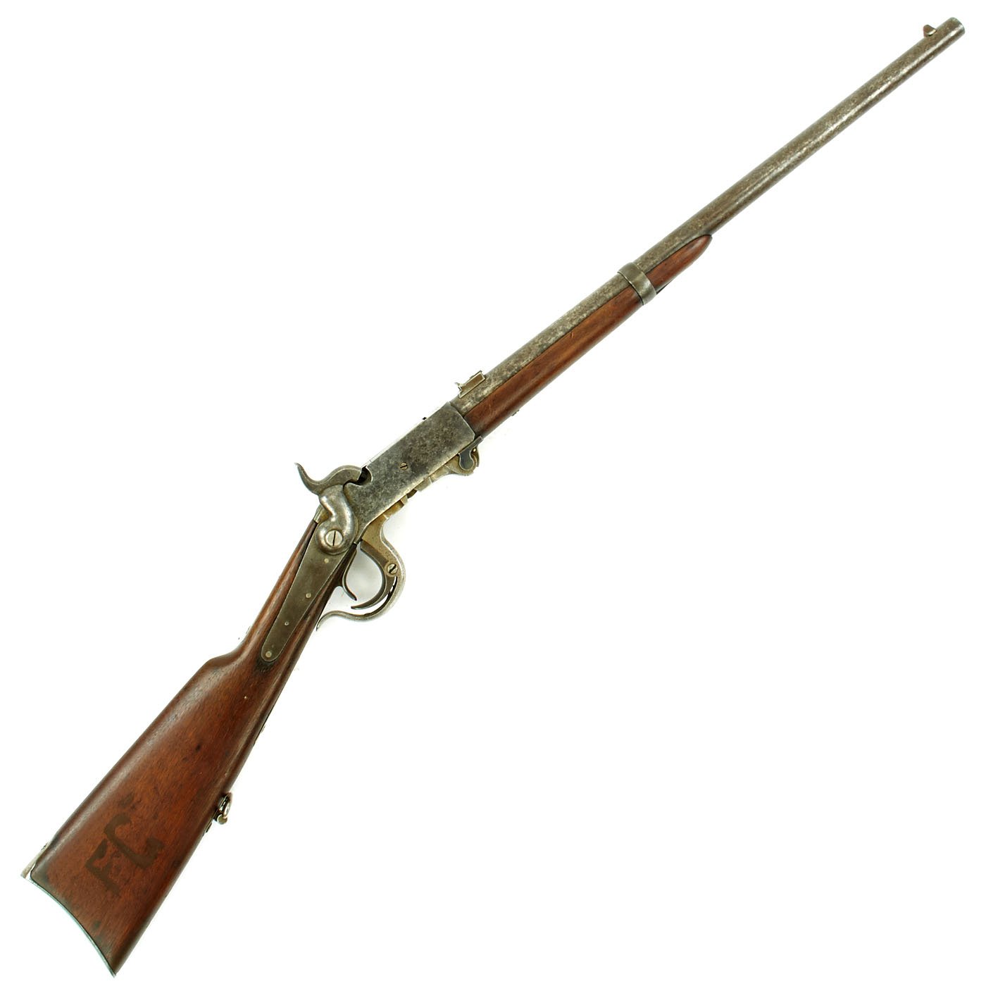 Original Item: Only One Available. This Burnside Cavalry "Saddle-Ring" Carbine in .54 caliber is offered in very good collectible condition. It is marked on the frame and under the barrel with serial number 17243, which is about mid way through production. The breech block is marked with serial 5953, so it was swapped at arsenal. This example, known as the "Fifth Model" or model of 1864, is in good service used condition, with nice wood stocks and an intact saddle ring. The top of the frame is clearly marked: