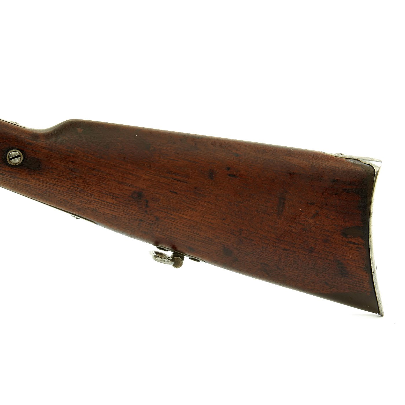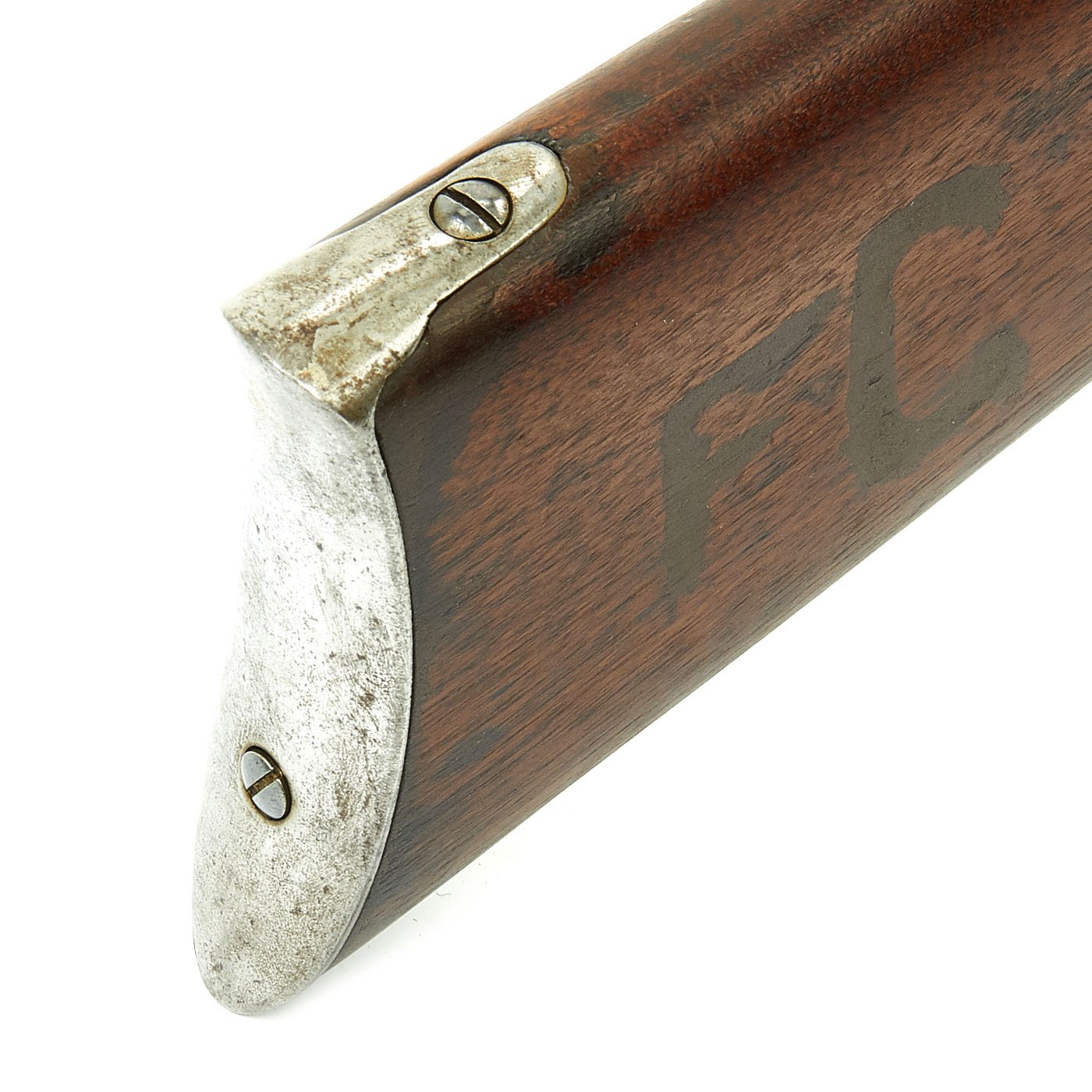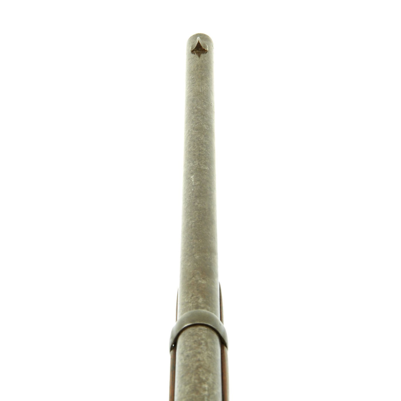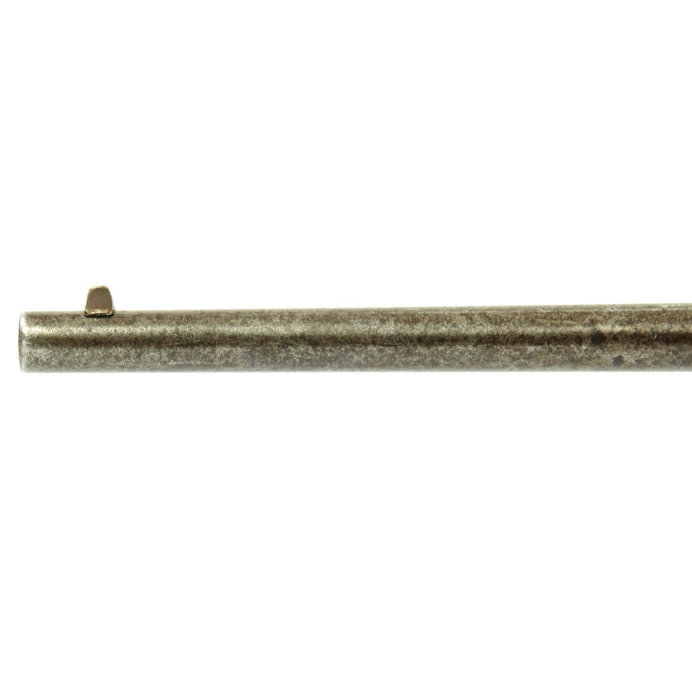 Additionally, it is marked CAST STEEL 1862. on the barrel in front of the sight. Overall metalwork condition is good, though repeated cleaning has removed most of the finish on the action, and there is evidence of light pitting in many areas, as shown in the pictures. It has a lovely worn gray patina. The bore, on the other hand, looks like it was rarely used. It has clear lands and grooves, with a bright finish, and just a bit of darkening in the grooves.