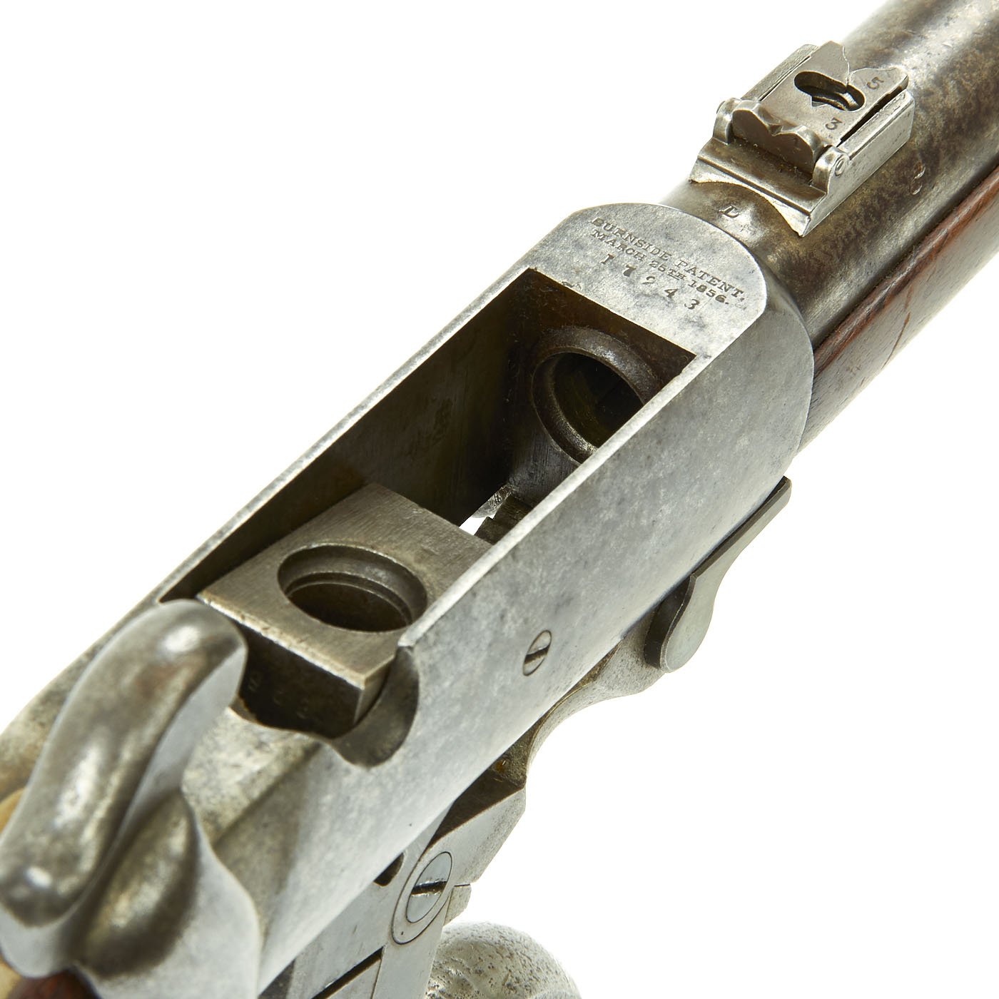 Burnside’s invention employed a rotating block, released by a loading lever that was activated by a hinged, clamping catch. It chambered a unique .54-cal. cone-shaped brass cartridge with a thick, rounded belt (there were also some earlier, coiled cases, sans belt) at its mouth and a small hole in the base that allowed ignition from a separate percussion cap. The round was loaded, base down, into the chamber. Next, the lever was closed and the block locked in place with the belt halfway between the chamber and barrel, providing an excellent seal.