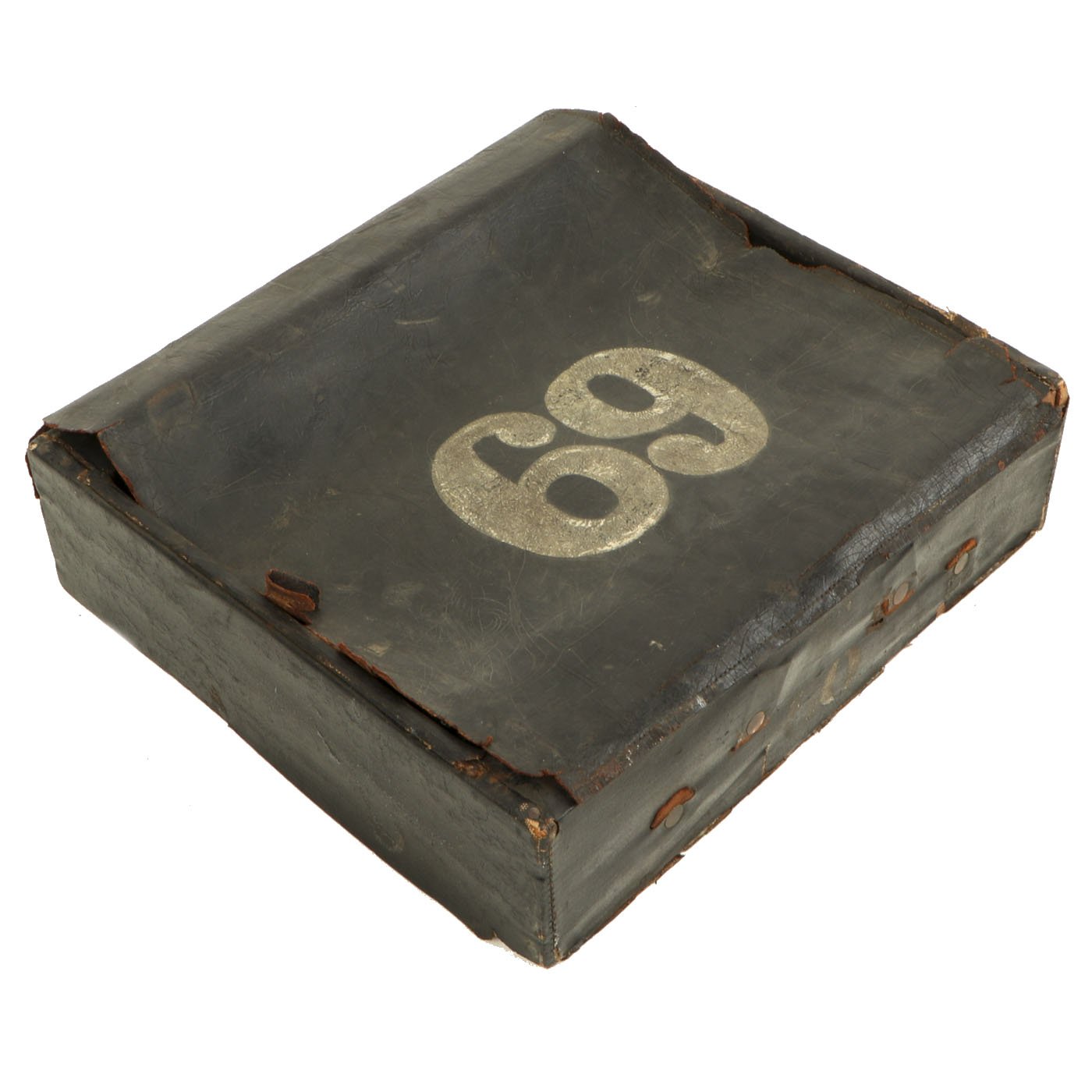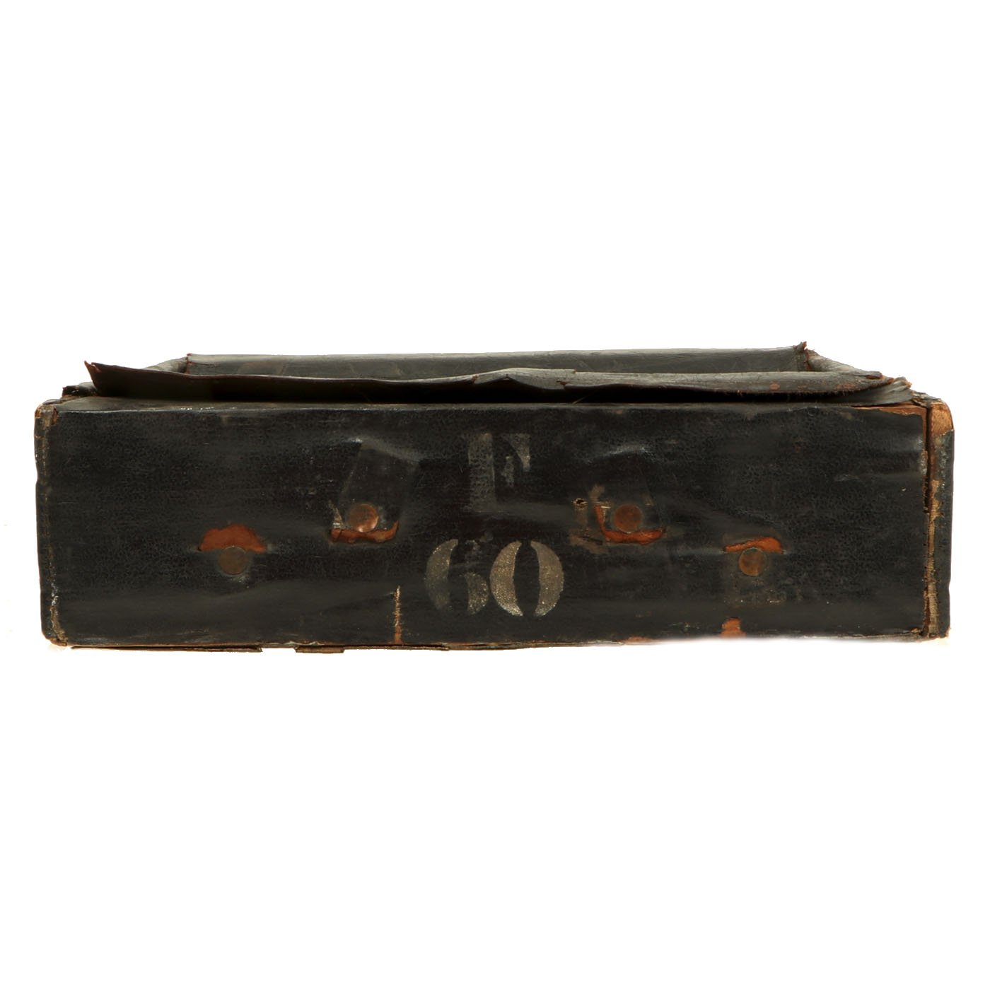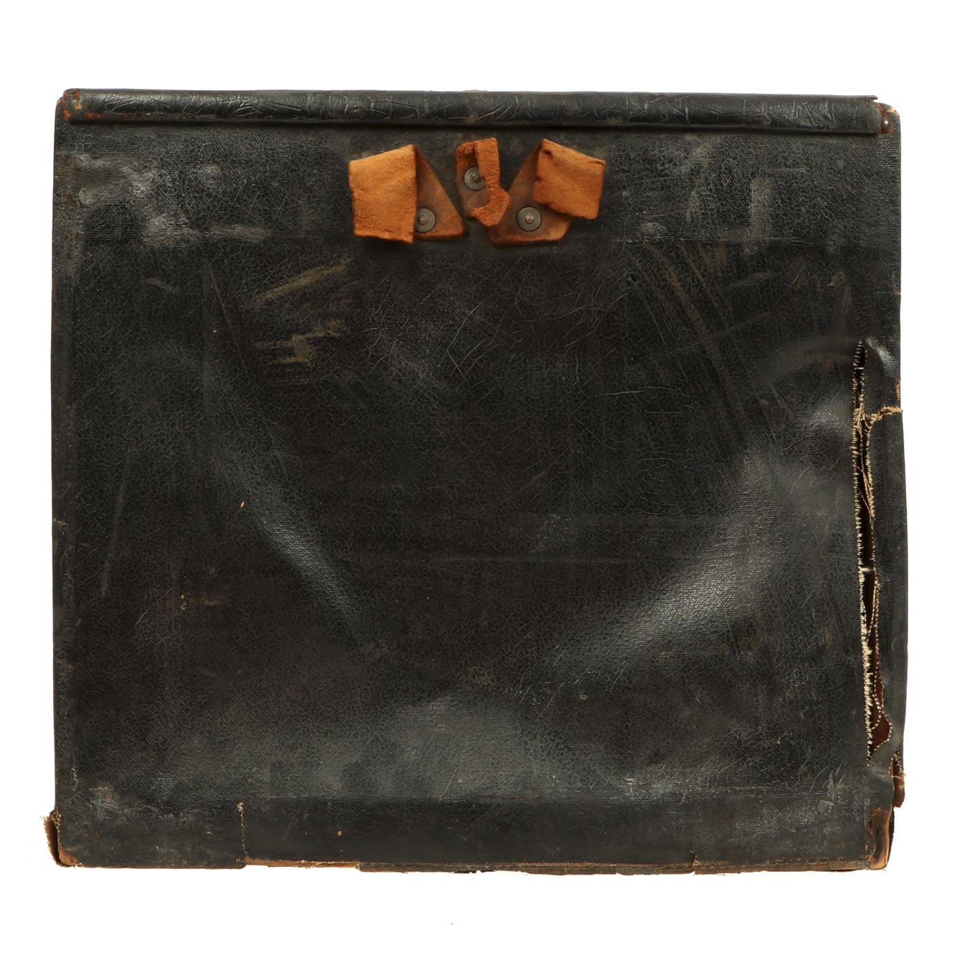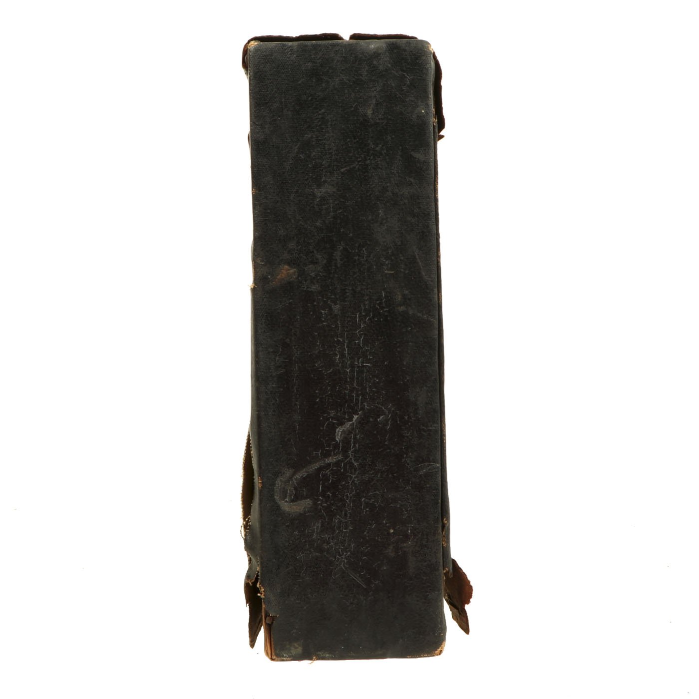 The knapsack is constructed of a painted linen fabric laid over and attached to an inner wooden box frame. The front flap is composed of leather that has been applied with an enamel-patented paint and then is lined with a fine linen cloth on the inner face. Beneath the flap, covering the opening of the box area are two painted fabric flaps with cloth tape ties (three remaining of the original four) The leather outer flap originally had a binded edging running down both sides and across the bottom, but unfortunately is now missing. The three Blanket straps originally located on the top of the pack are missing as well. On the bottom side, the shoulder strap “Roller Buckle” and Brass “J” type hook are also missing. The reverse side of the pack has no straps remaining. Overall condition is somewhat fragile and the painted surfaces are cracked and crazed. The pack’s measurements are as follows: 13-3/4” in height x 15” width and 4” in depth.