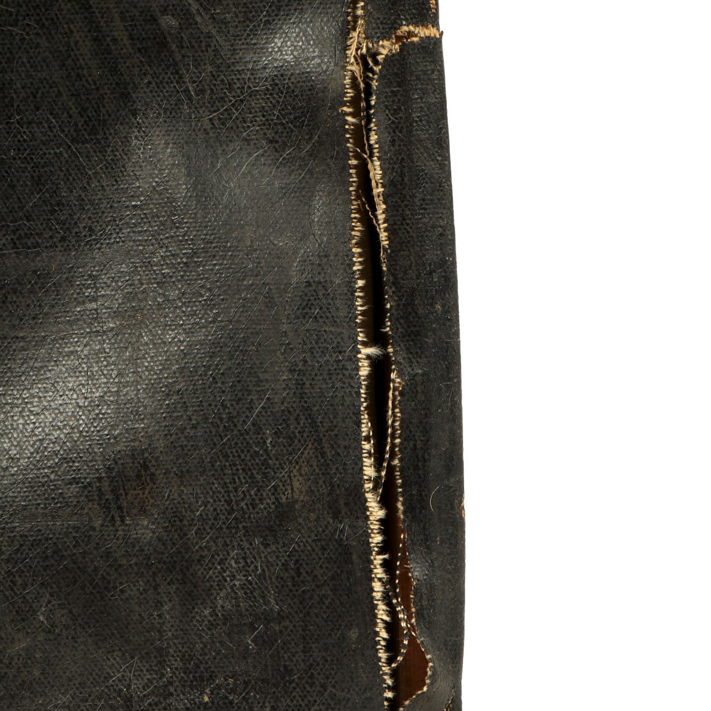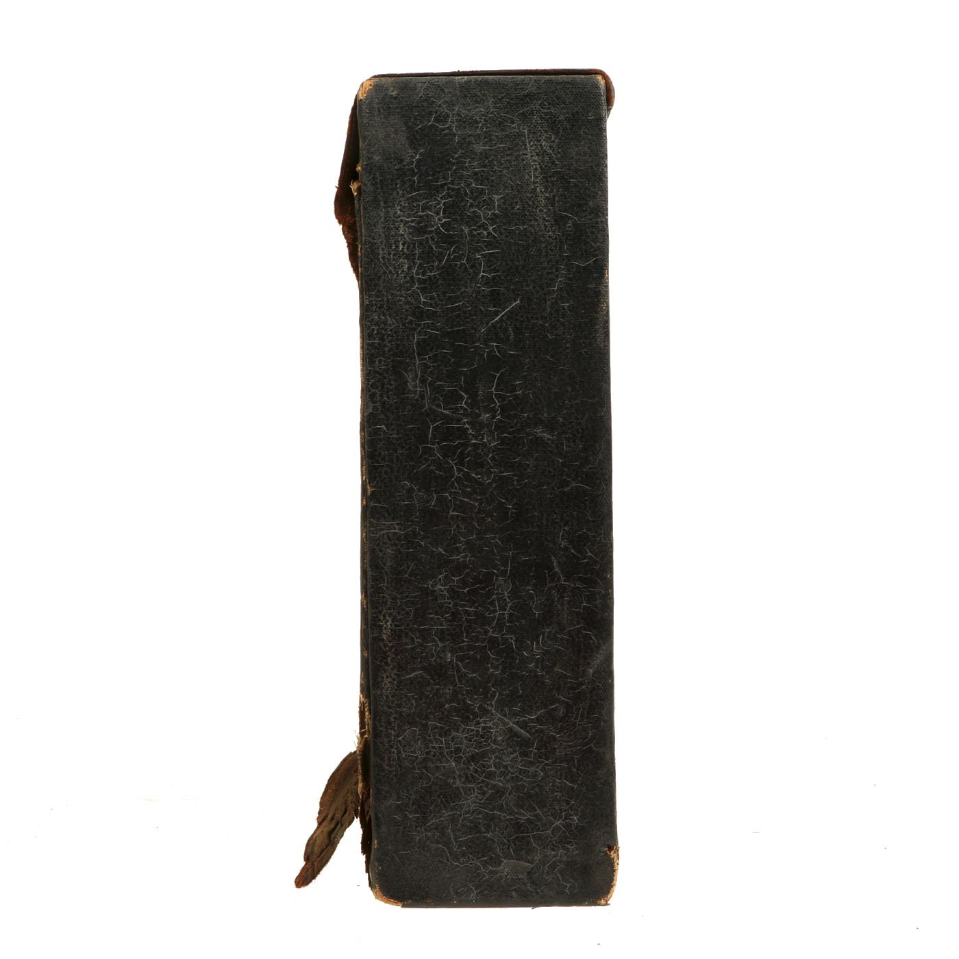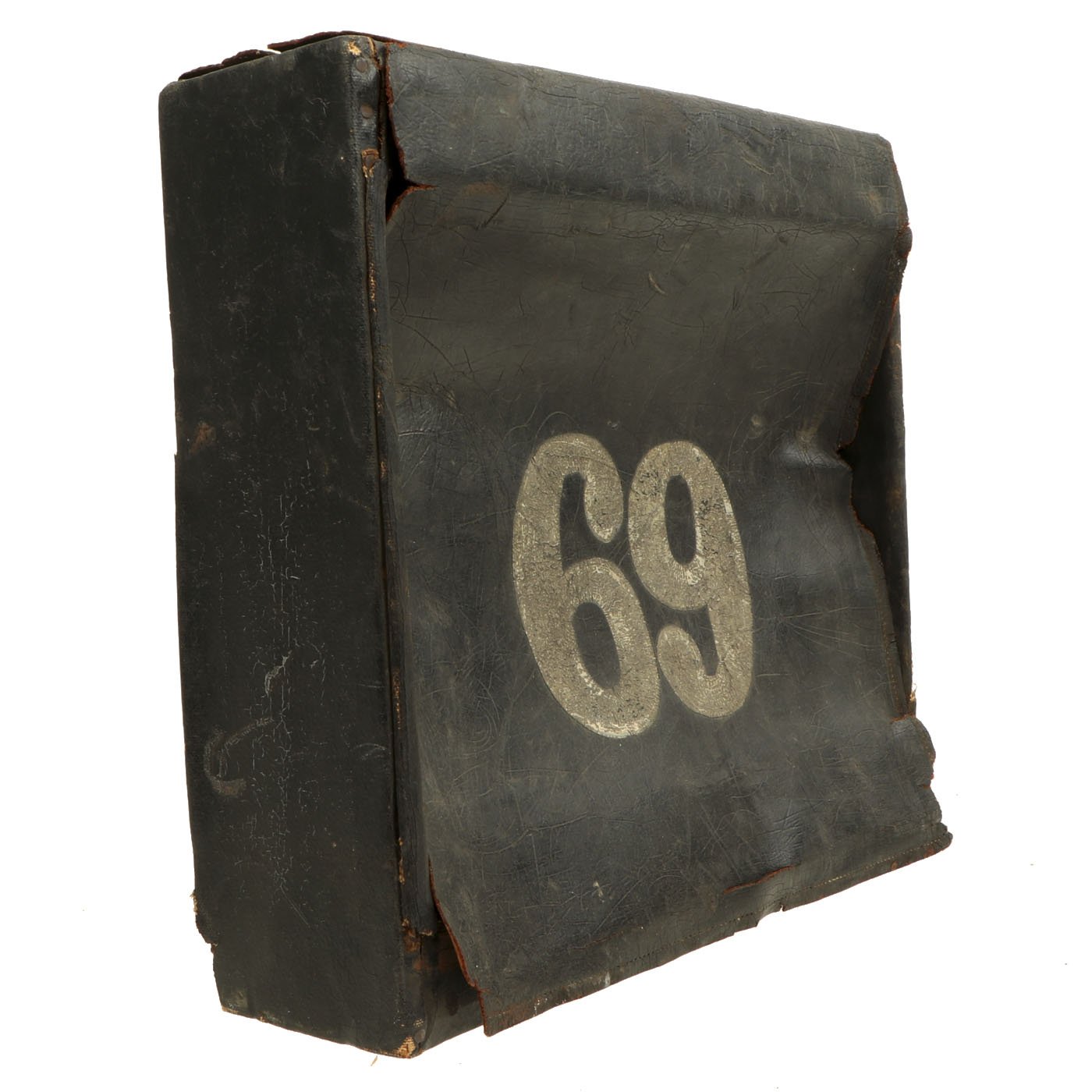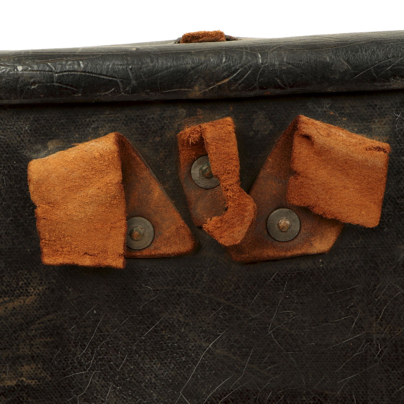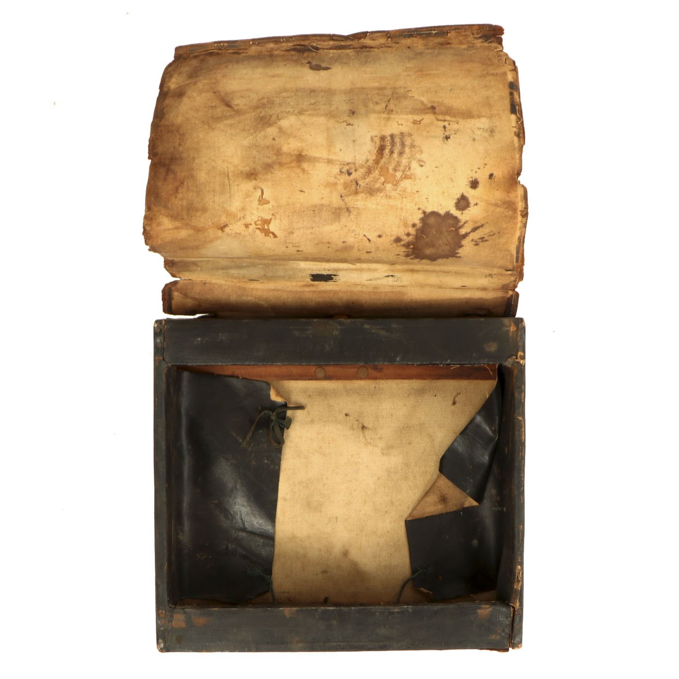 The knapsack is constructed of a painted linen fabric laid over and attached to an inner wooden box frame. The front flap is composed of leather that has been applied with an enamel-patented paint and then is lined with a fine linen cloth on the inner face. Beneath the flap, covering the opening of the box area are two painted fabric flaps with cloth tape ties (three remaining of the original four) The leather outer flap originally had a binded edging running down both sides and across the bottom, but unfortunately is now missing. The three Blanket straps originally located on the top of the pack are missing as well. On the bottom side, the shoulder strap “Roller Buckle” and Brass “J” type hook are also missing. The reverse side of the pack has no straps remaining. Overall condition is somewhat fragile and the painted surfaces are cracked and crazed. The pack’s measurements are as follows: 13-3/4” in height x 15” width and 4” in depth.