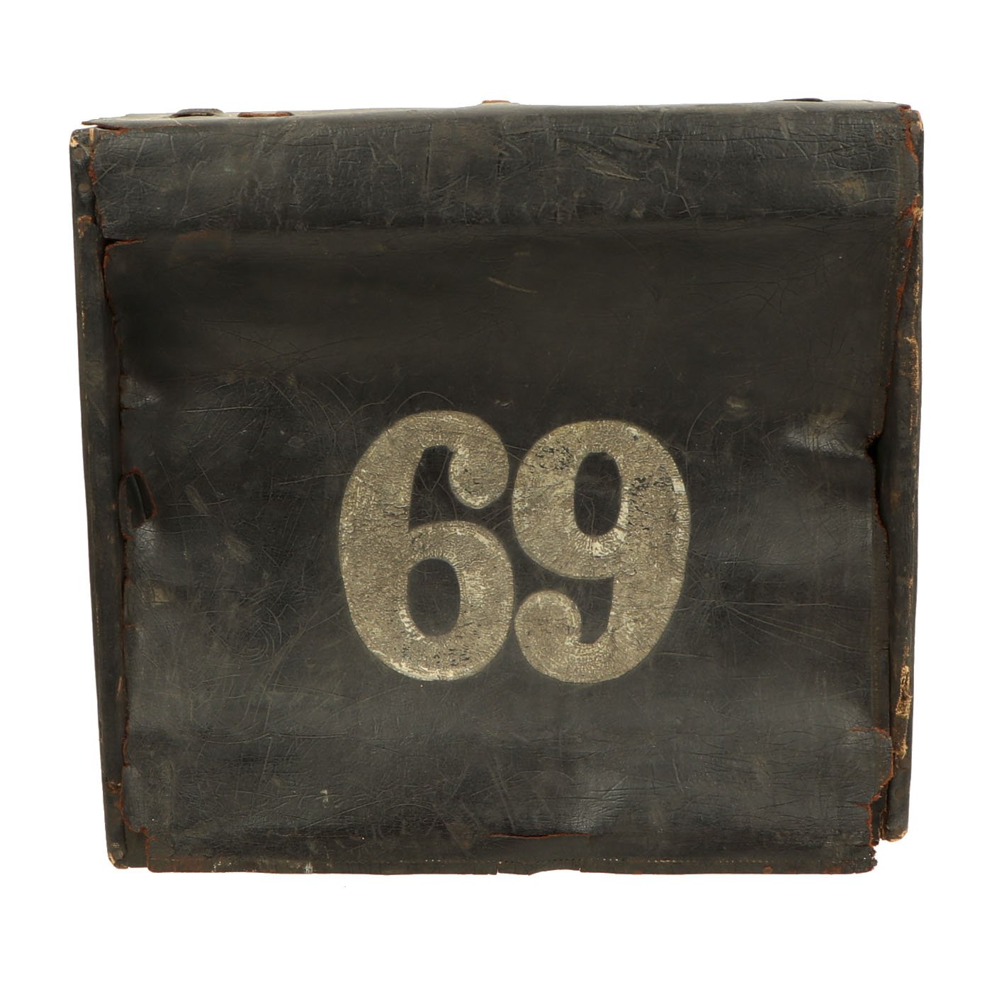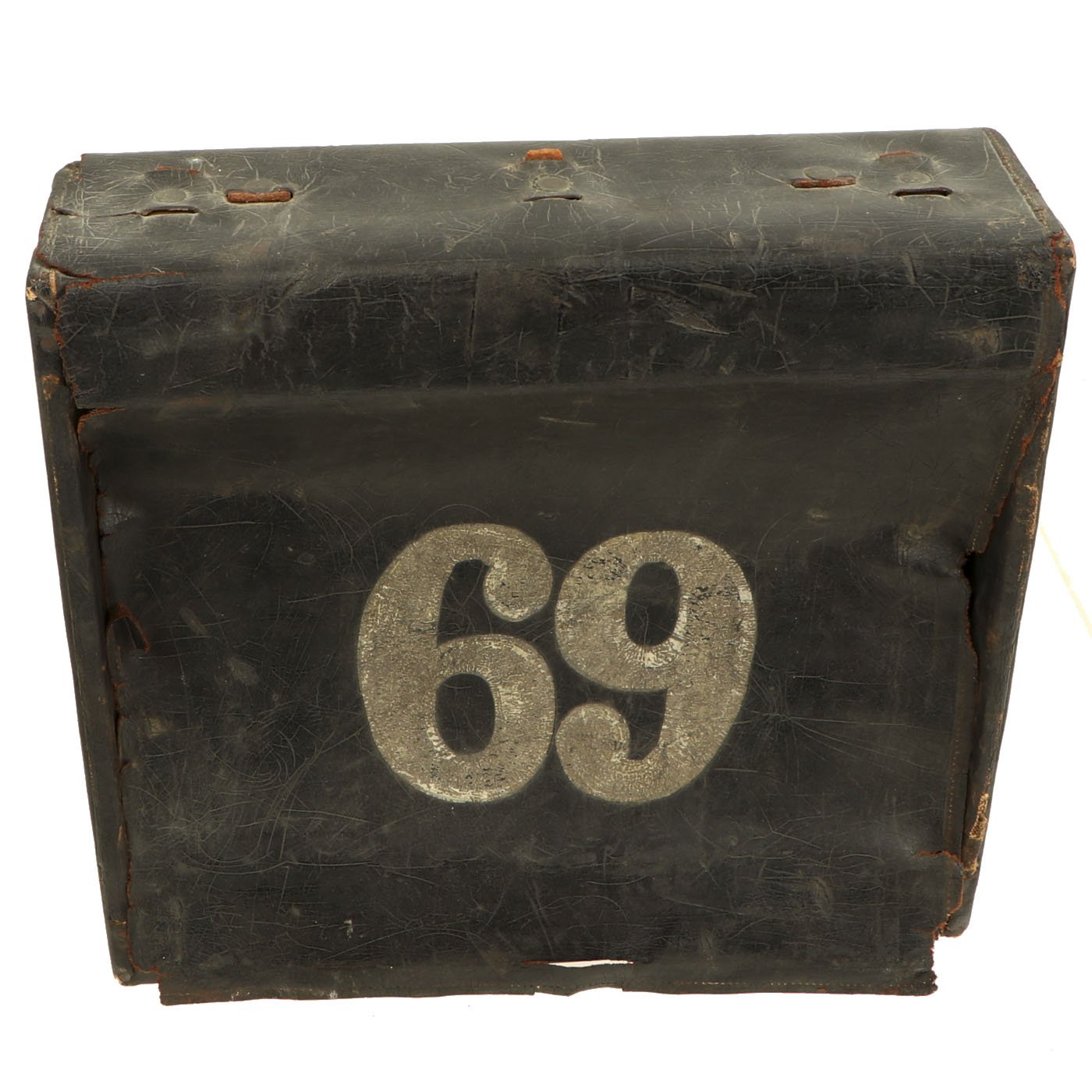 This example of a “Hardpack” type knapsack is paint-stenciled with the regimental number 69 (5”) located on the center outer flap and F over 60 on the bottom edge. This knapsack is attributed to the famous New York, “Irish-American” militia regiment raised in N.Y. city during the mid 1850’s.and went on to achieved world famous success throughout the American Civil War. The pack shown here is of a type commonly worn by other New York militia units from the 1850’s up through the early war period, then being replaced by the U.S. model 1853-1855 “Soft type”knapsack used by 90% of the Union army for the rest of the War.