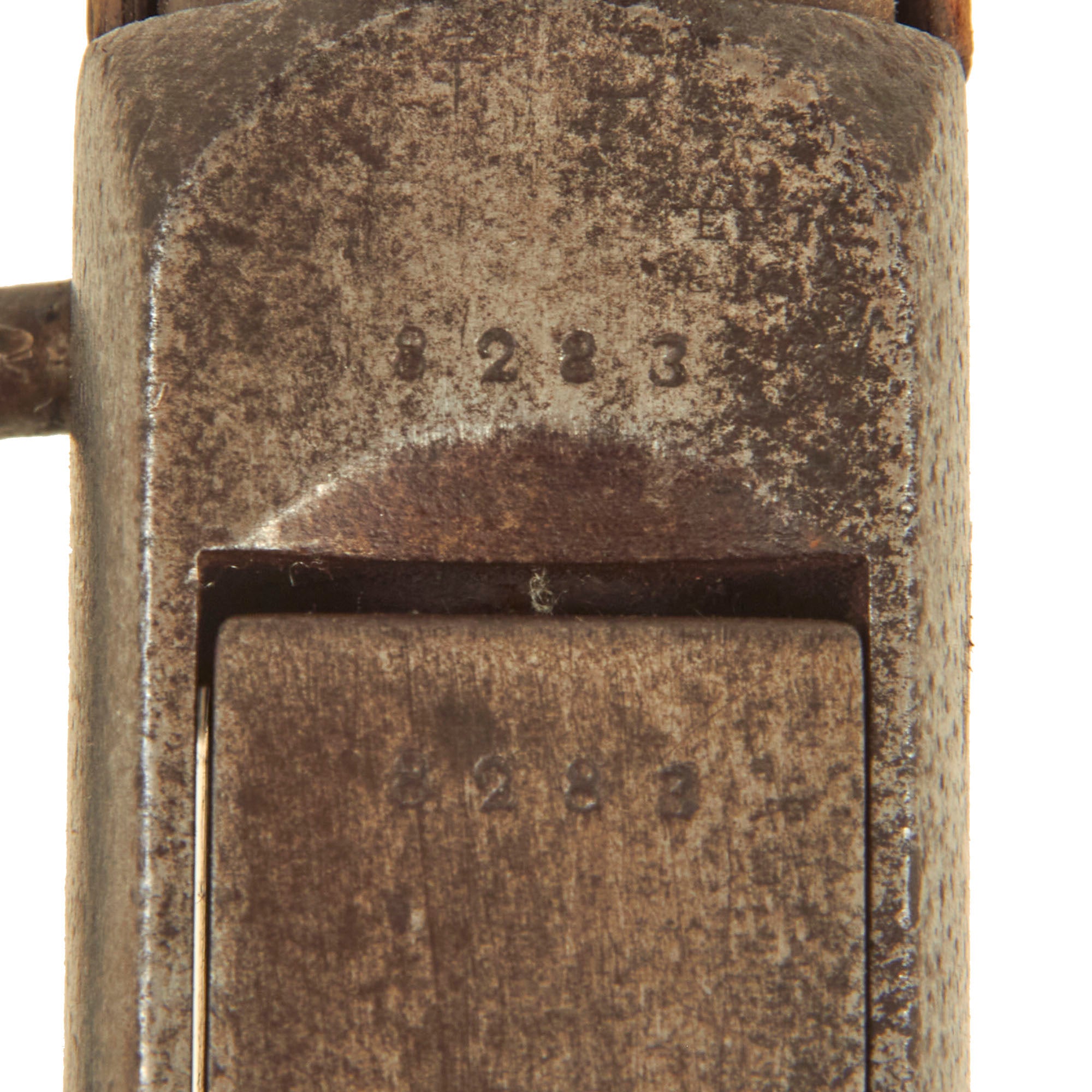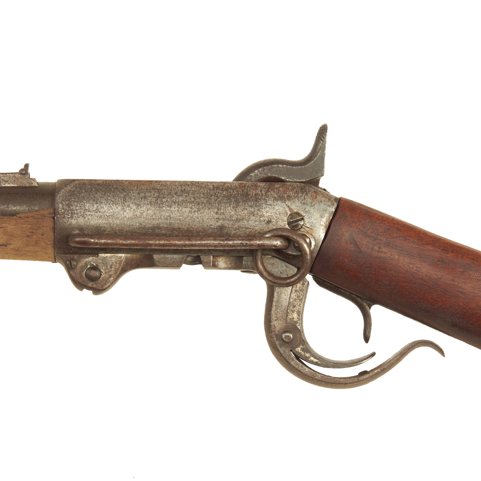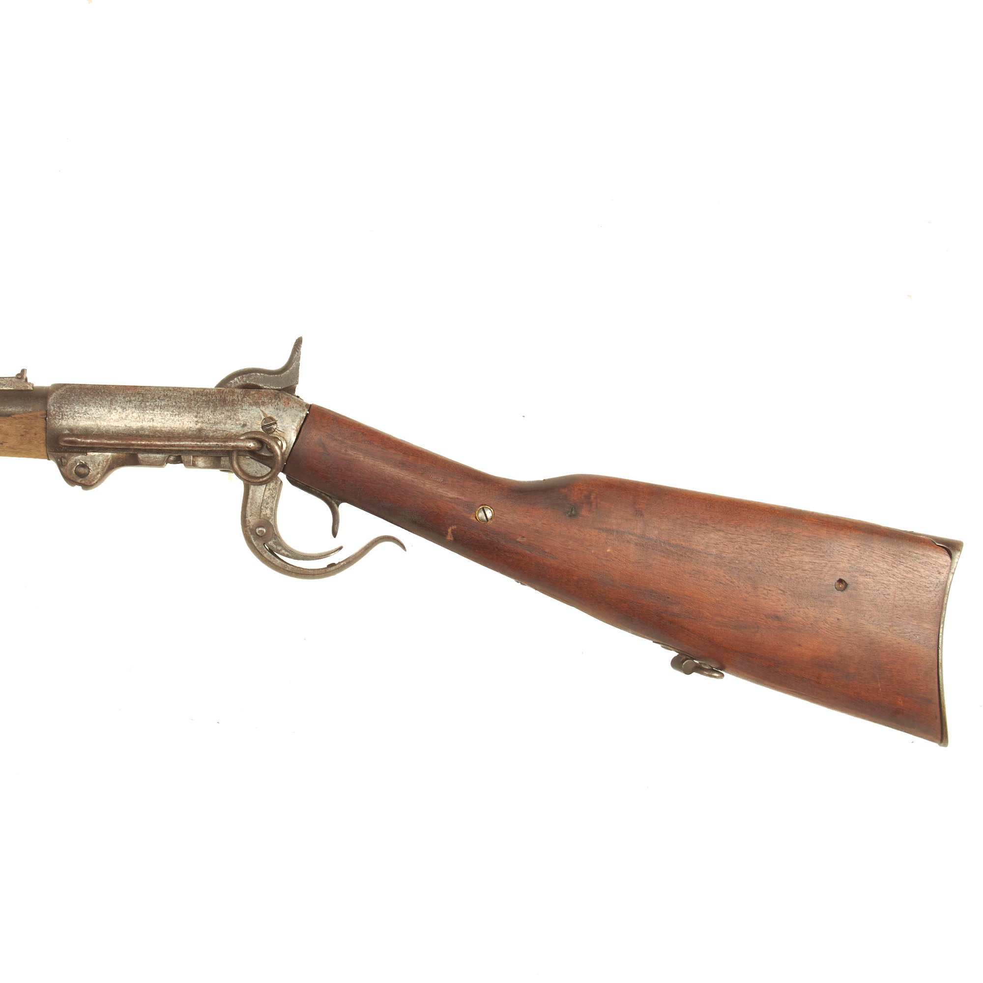 This Burnside Cavalry Carbine in .54 caliber is offered in "As found" condition, having only been given a light wipe down before photography. It is marked on the frame, breech block, loading lever, and on the underside of the barrel under the fore stock with serial number 8283, which is about a fourth of the way through of wartime production, probably made in late 1863. We checked the Springfield Research Services records, but were not able to find any possible shipments this may have been a part of.
