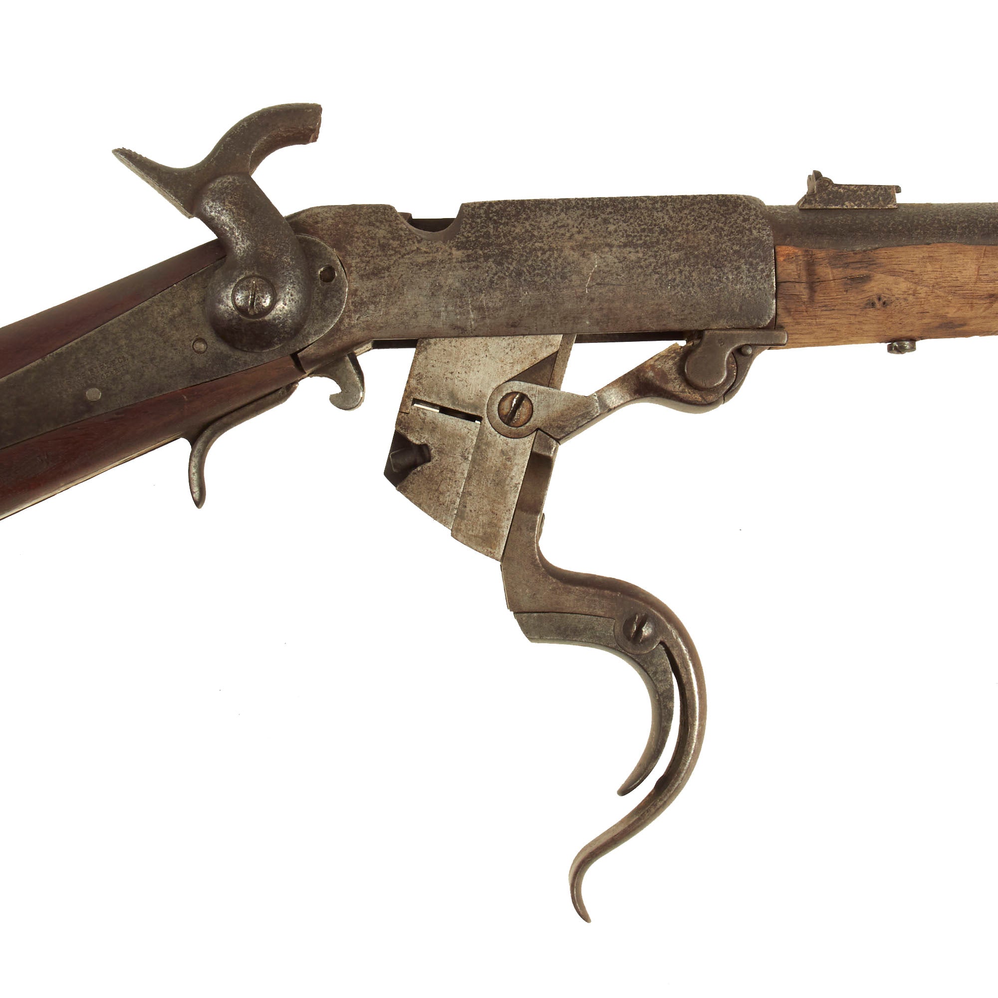 Burnside’s invention employed a rotating block, released by a loading lever that was activated by a hinged, clamping catch. It chambered a unique .54-cal. cone-shaped brass cartridge with a thick, rounded belt (there were also some earlier, coiled cases, sans belt) at its mouth and a small hole in the base that allowed ignition from a separate percussion cap. The round was loaded, base down, into the chamber. Next, the lever was closed and the block locked in place with the belt halfway between the chamber and barrel, providing an excellent seal.