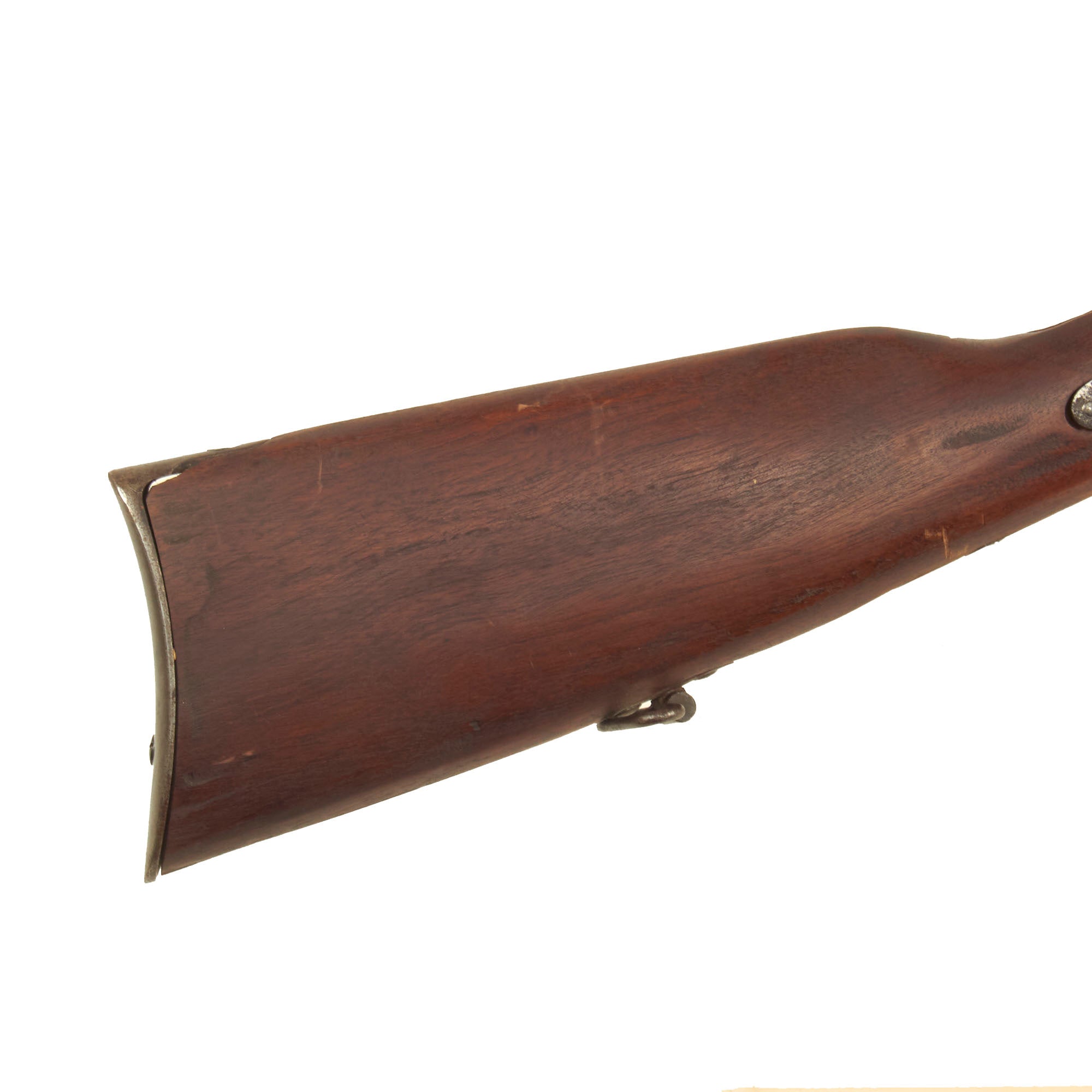 This example, known as the "Fourth Model" or model of 1863, definitely saw extensive use while in service. However it still retains the saddle ring bar with one ring, as well as the sling swivel on the bottom of the butt stock.