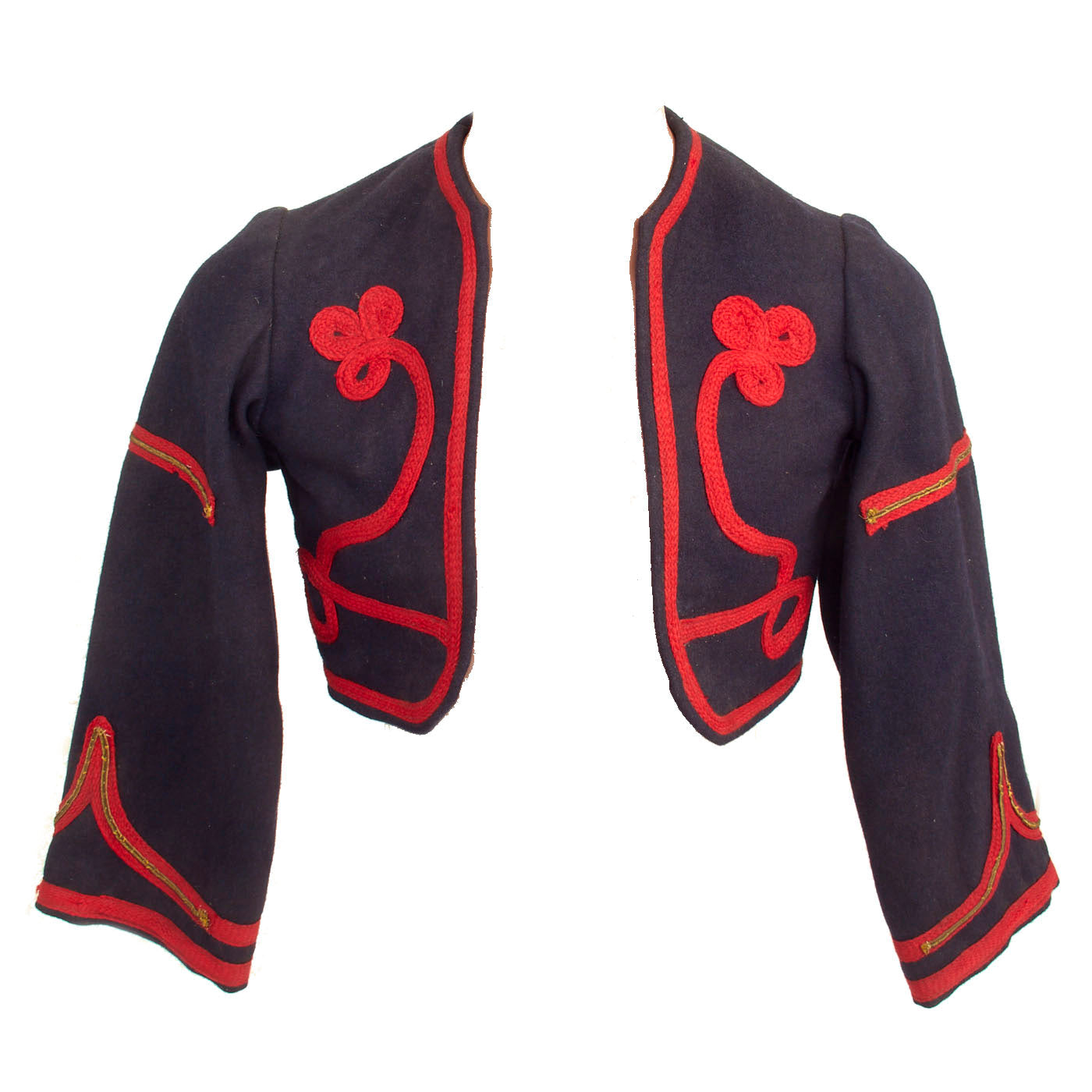 We'll let our photos speak for this colorful offering except to say that it is entirely original and of the period, remains in nice condition with no problems and exhibits just the amount of wear necessary to testify to actual period use. The jacket is of a wool of quality, weight, color and weave that experienced collectors look for. It retains its original cotton lining, all clearly of the period and stitching throughout is of the classic period combination of hand and early machine work.