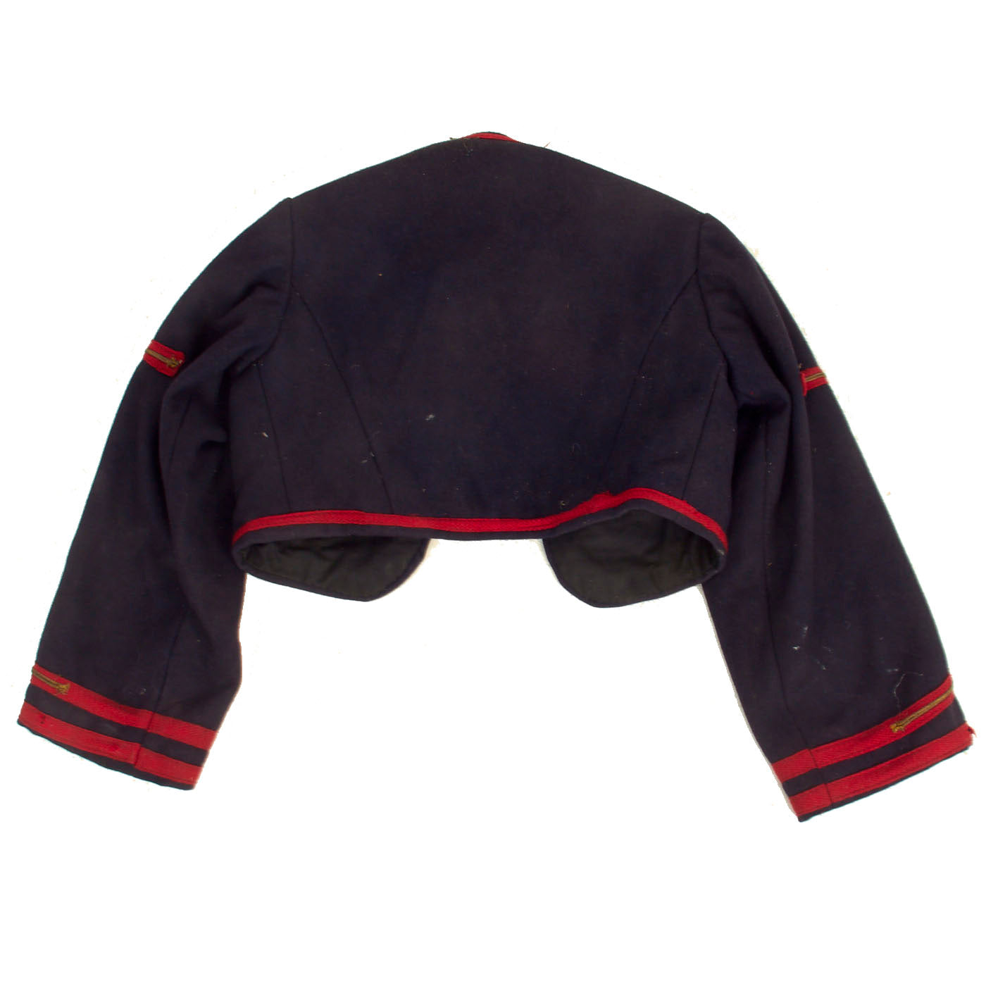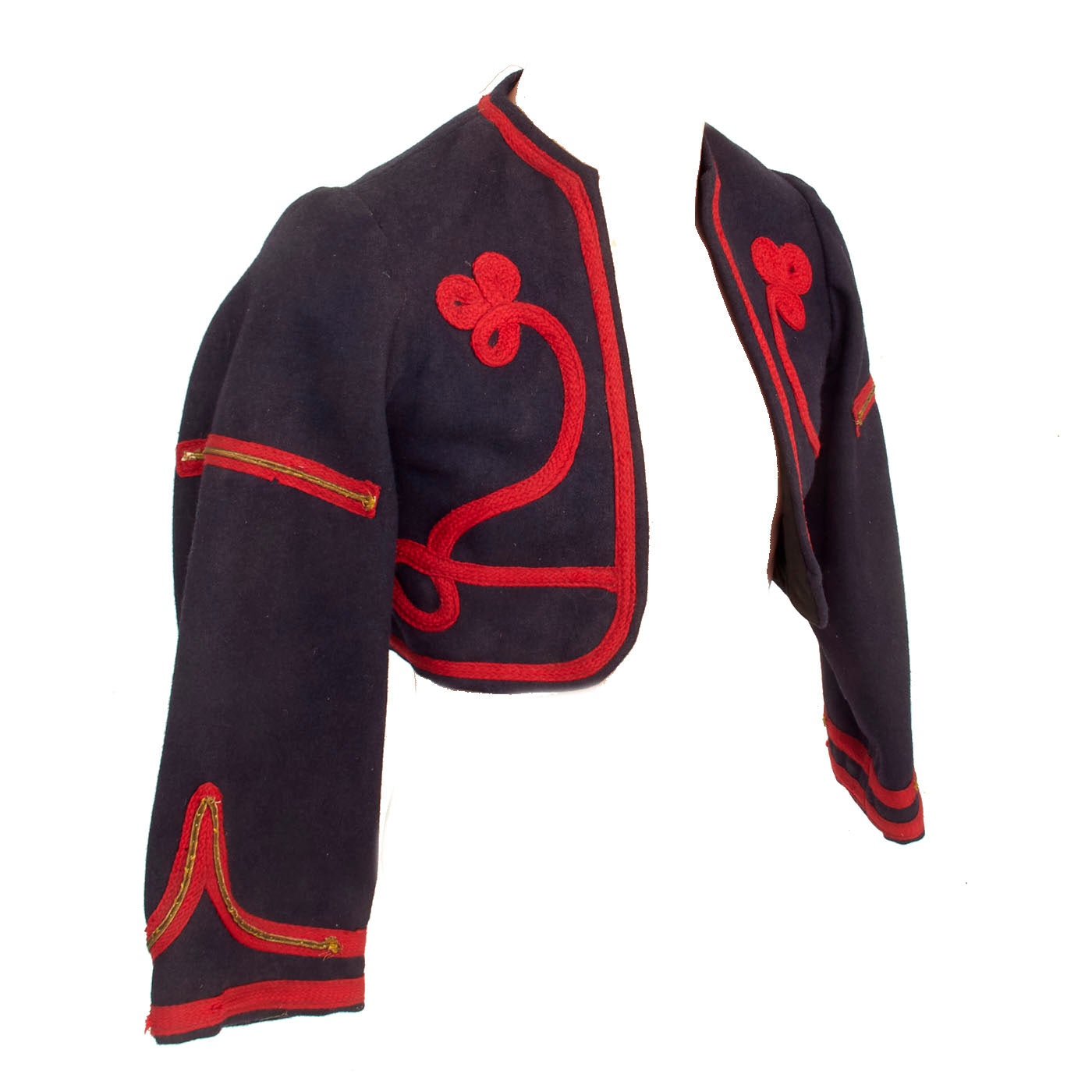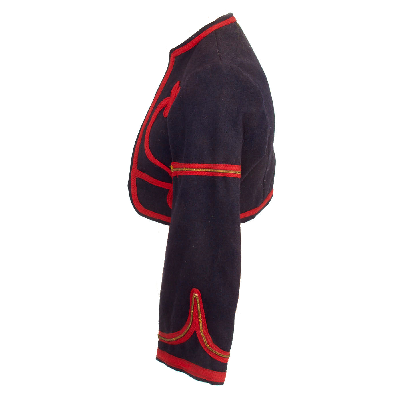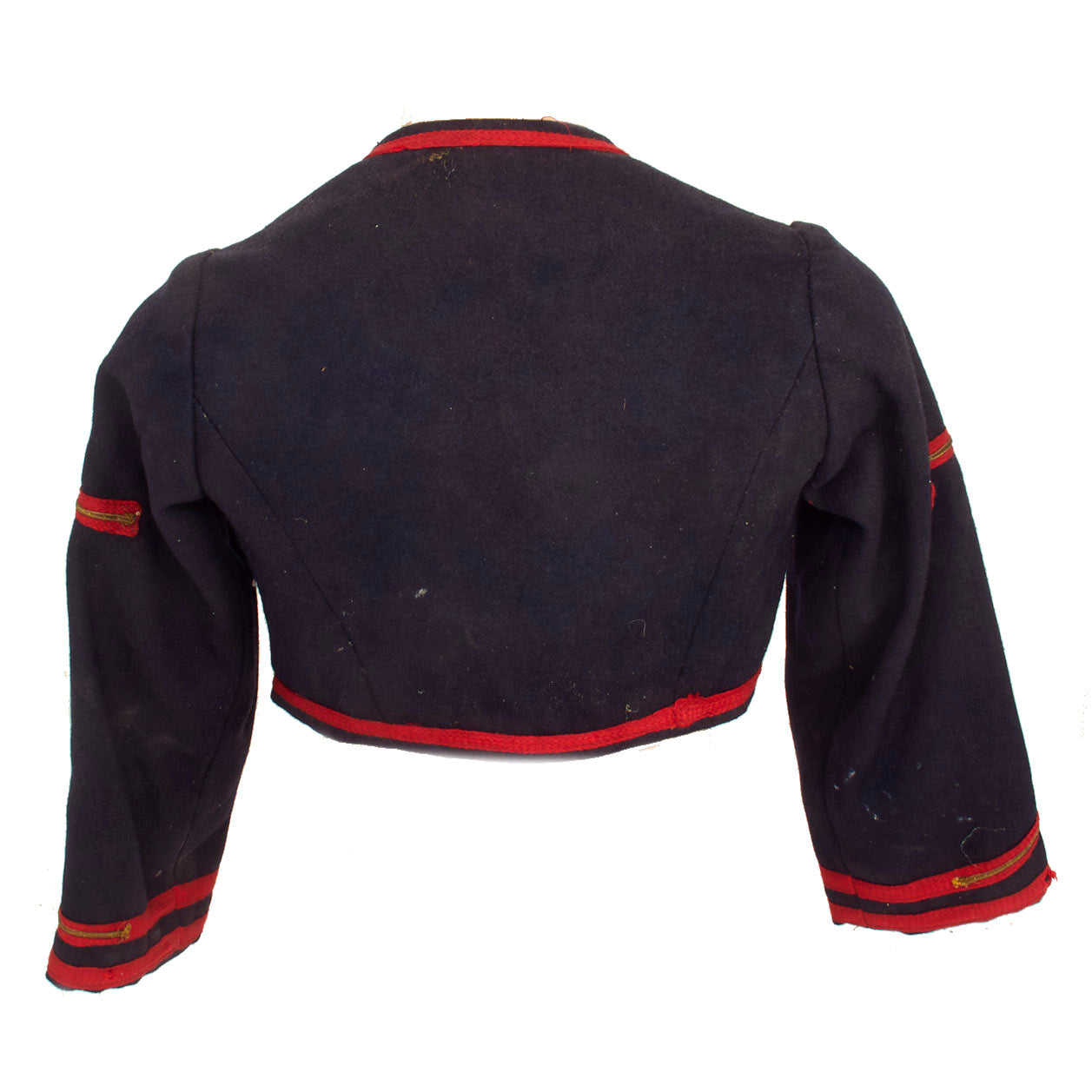 This specific jacket is not marked in the jacket lining, however, this is 100 percent correct and original. Large government stores of these French imports were offered at public auction where large quantities were acquired by big Eastern states (N.Y., Penn. & Mass.) buyers who found a ready market among wartime citizens and soldiers who viewed the flashy uniform gear as a mark of the elite. Though few period examples have survived to reach today's collector market, the commonly accepted misconception that use of the Zouave uniform was short-lived and restricted to the earlier portion of the war is just that, a misconception. Many units were supplied with the classic mark of the elite through the duration of the war. (see: Troiani French Import Uniforms North South TRADER'S CIVIL WAR - Vol. XXVI No. 2).