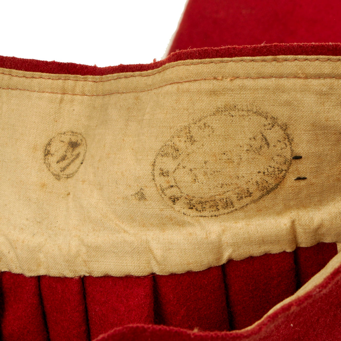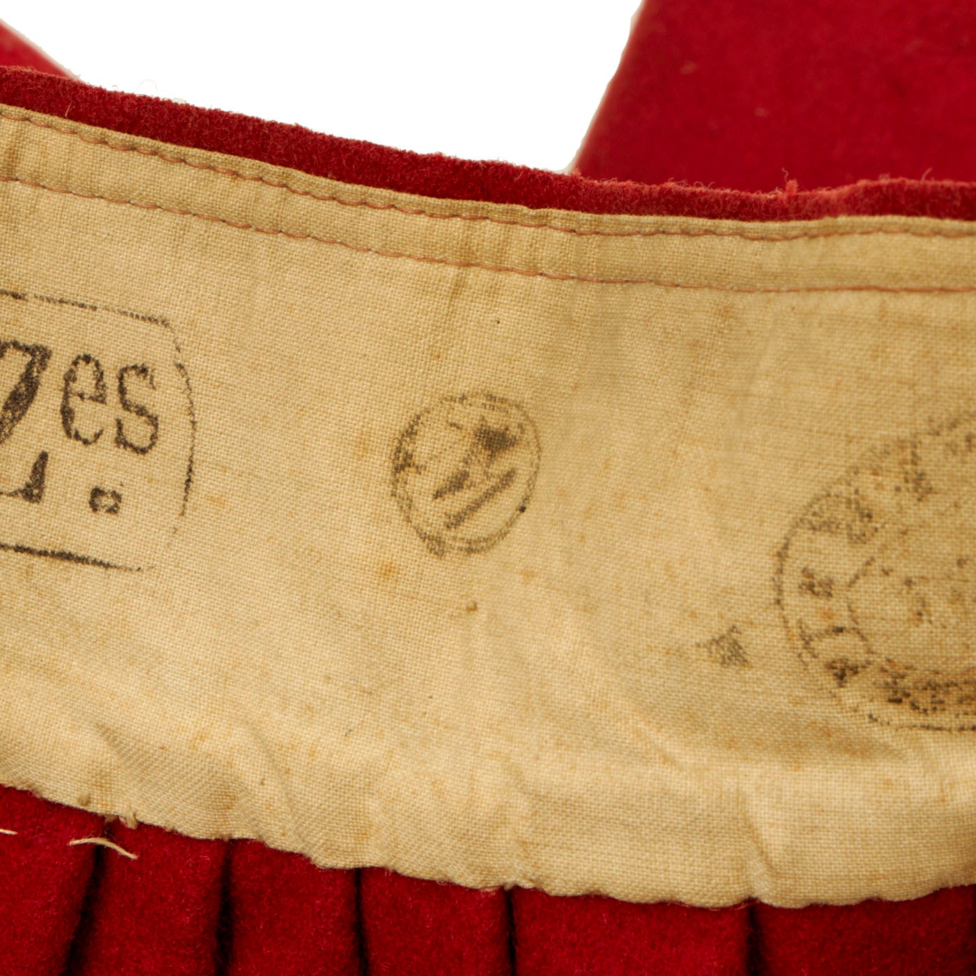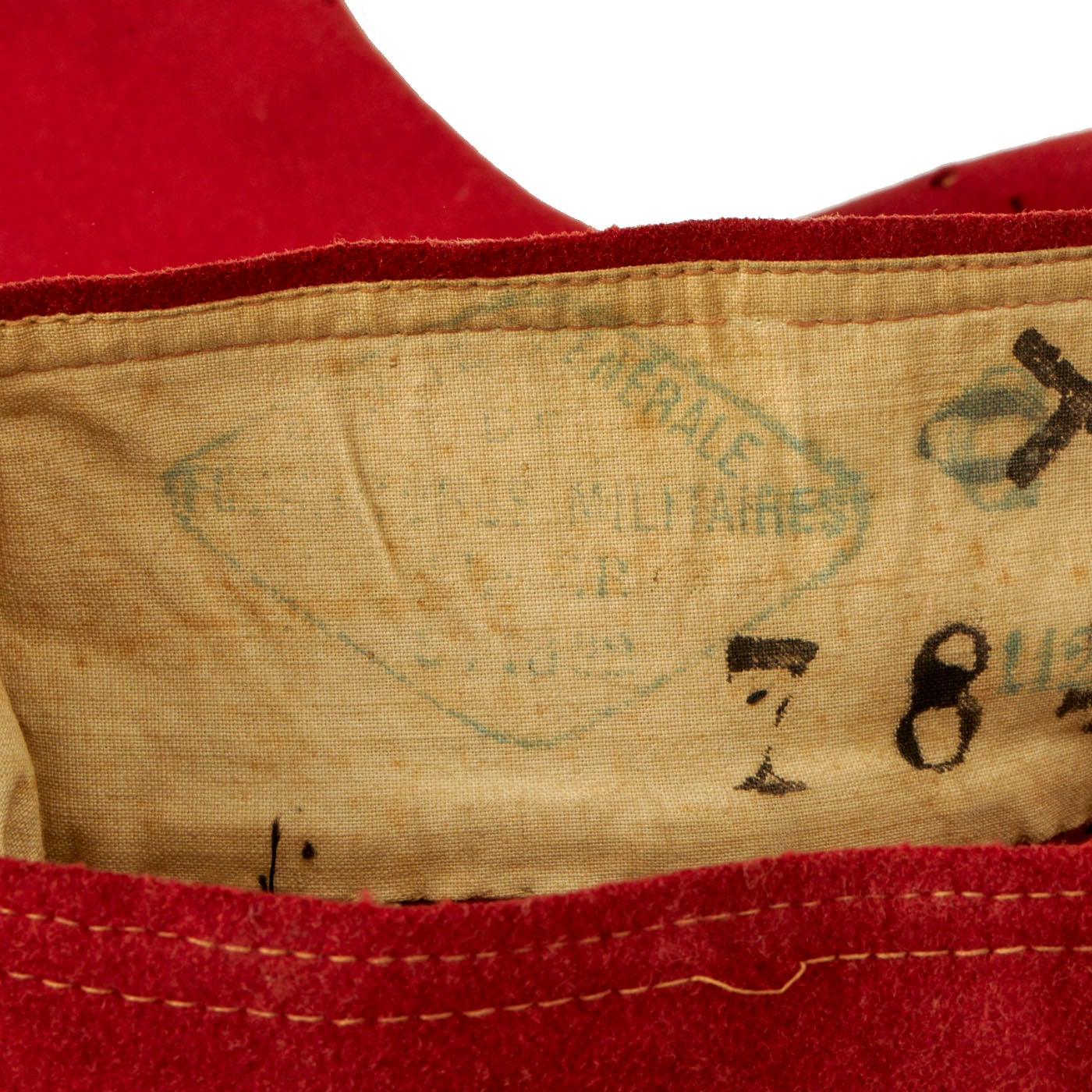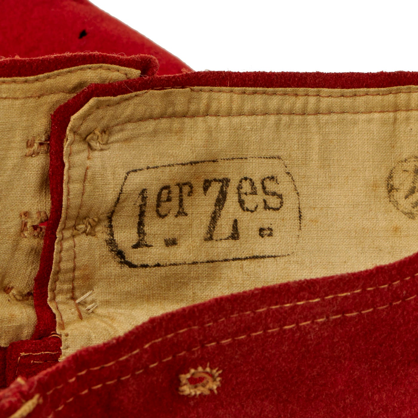 This specific vest is marked with French ink stamps on the back, with a makers mark that is faded, and possibly size markings. On the inside of the right it is marked 1er Zes, most likely for 1st Zouave Regiment (1-Première Zouaves), X11 / 7846, which looks to be an inventory number. The pants have identical markings inside the waistband. On the left is X11 / 7846 and on the right is 1er Zes. There are manufacturers' stamps but unfortunately are faded. The condition on both of these items are excellent given their age. They have minor moth holes which are expected with wool material this old. The stitching and colors are still very vibrant and beautiful.