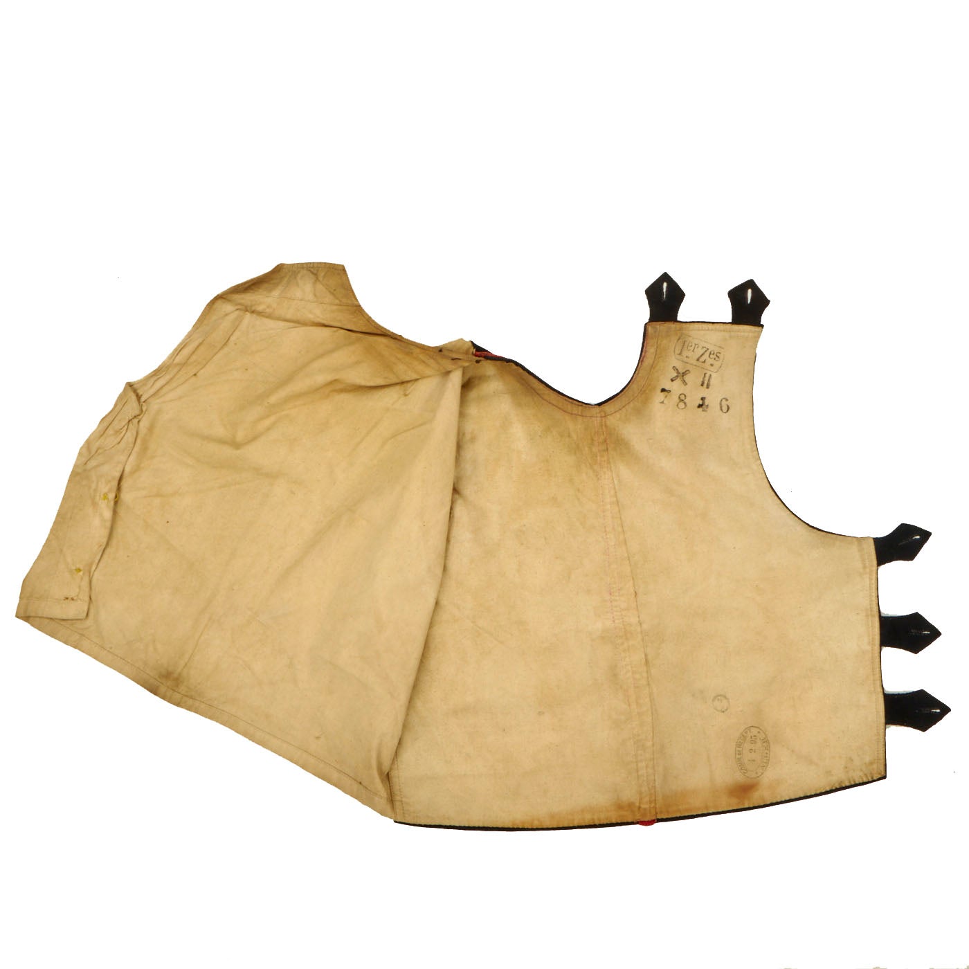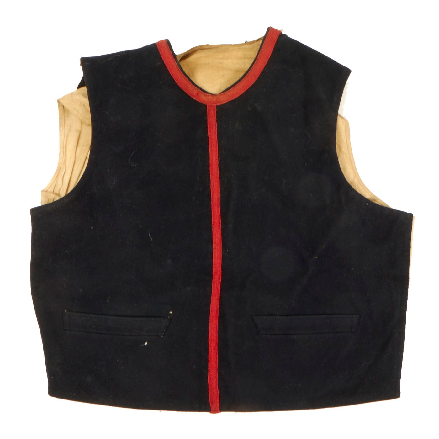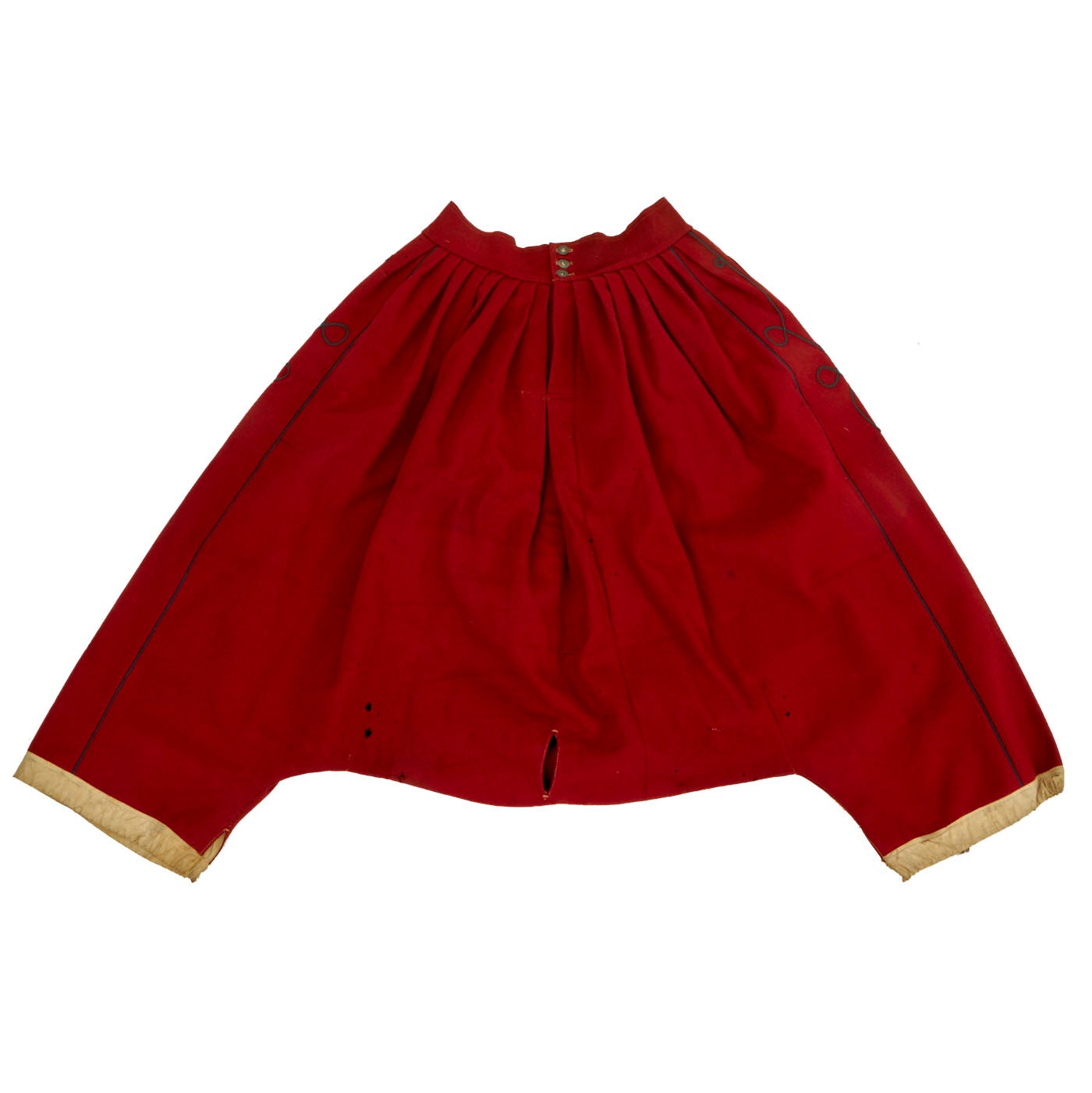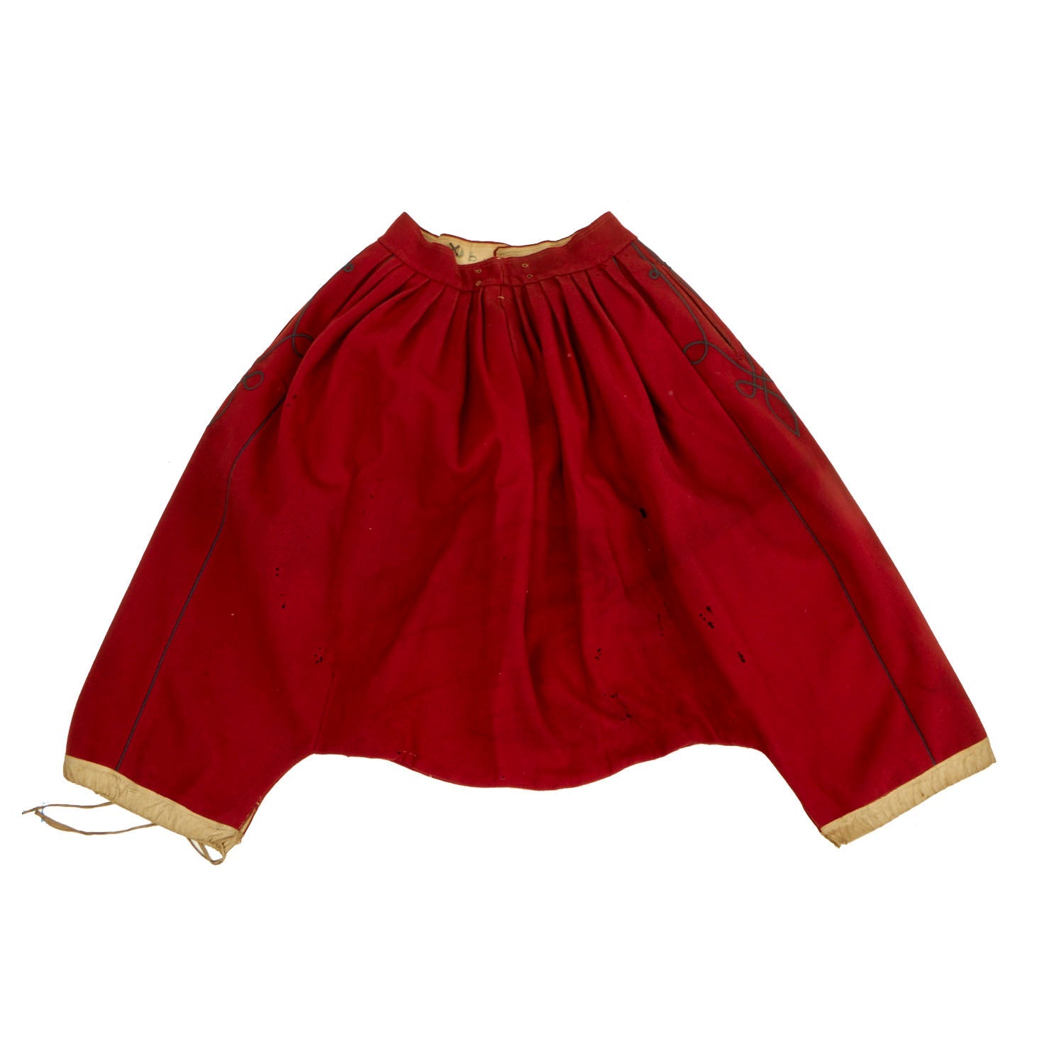 This specific vest is marked with French ink stamps on the back, with a makers mark that is faded, and possibly size markings. On the inside of the right it is marked 1er Zes, most likely for 1st Zouave Regiment (1-Première Zouaves), X11 / 7846, which looks to be an inventory number. The pants have identical markings inside the waistband. On the left is X11 / 7846 and on the right is 1er Zes. There are manufacturers' stamps but unfortunately are faded. The condition on both of these items are excellent given their age. They have minor moth holes which are expected with wool material this old. The stitching and colors are still very vibrant and beautiful.