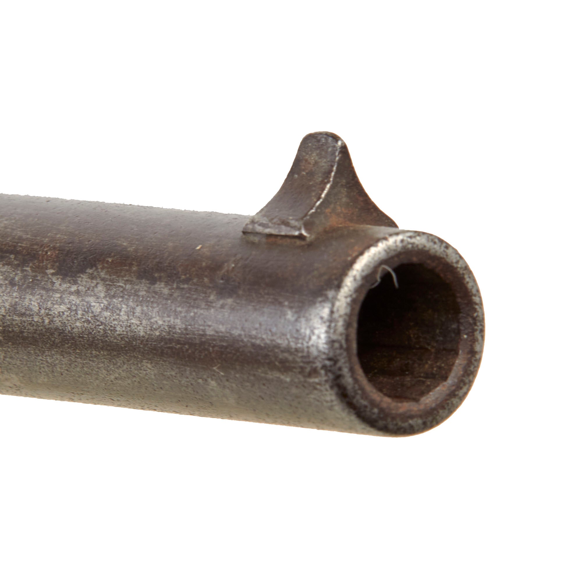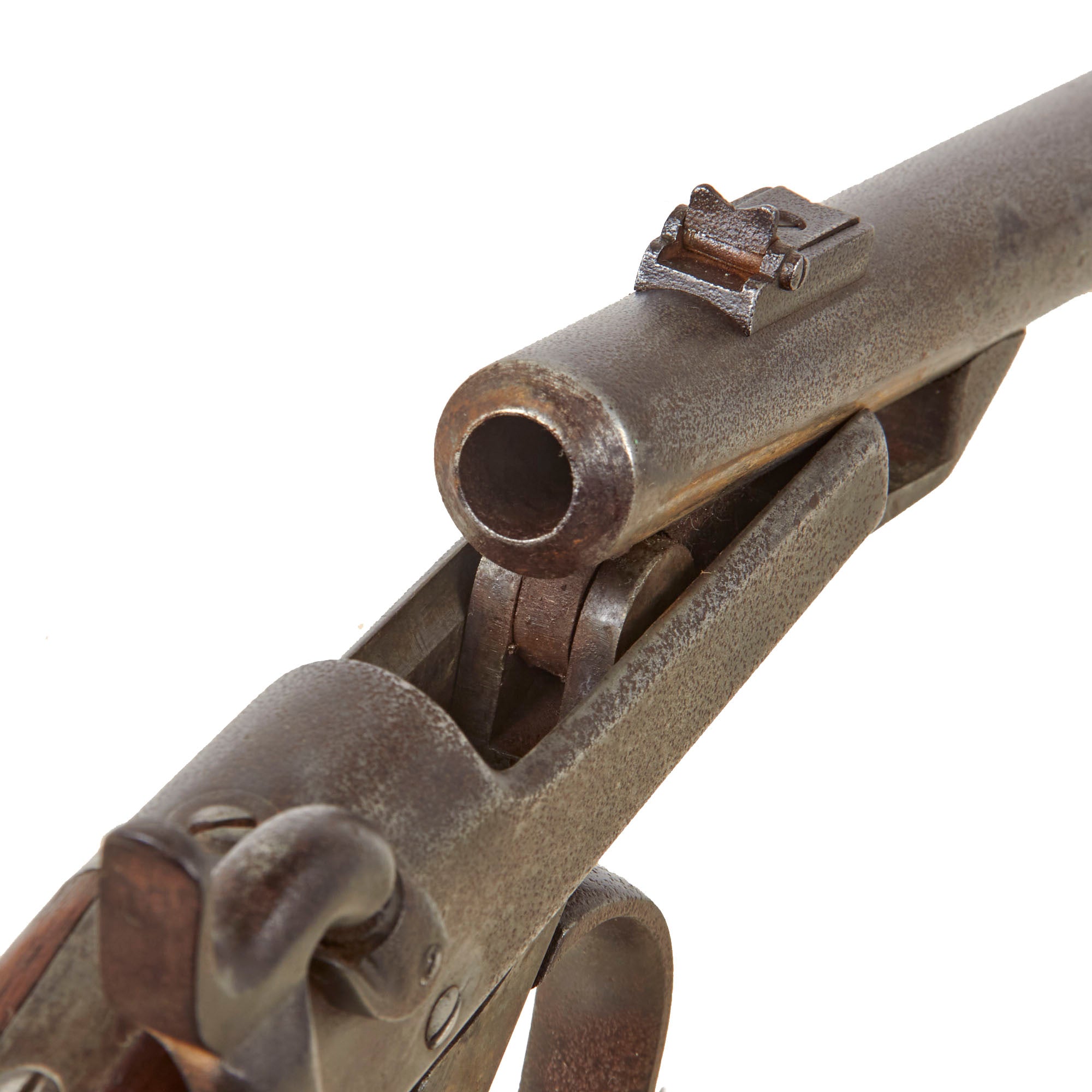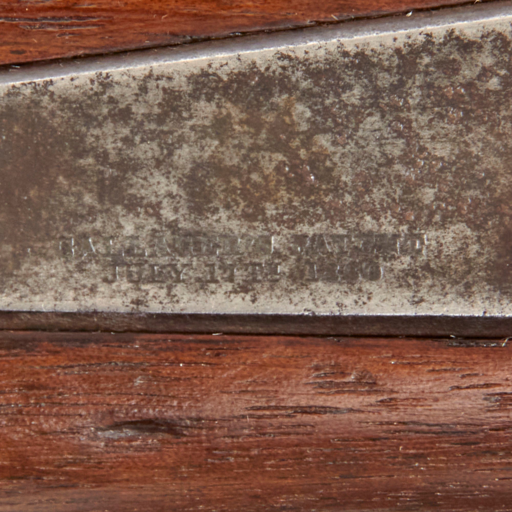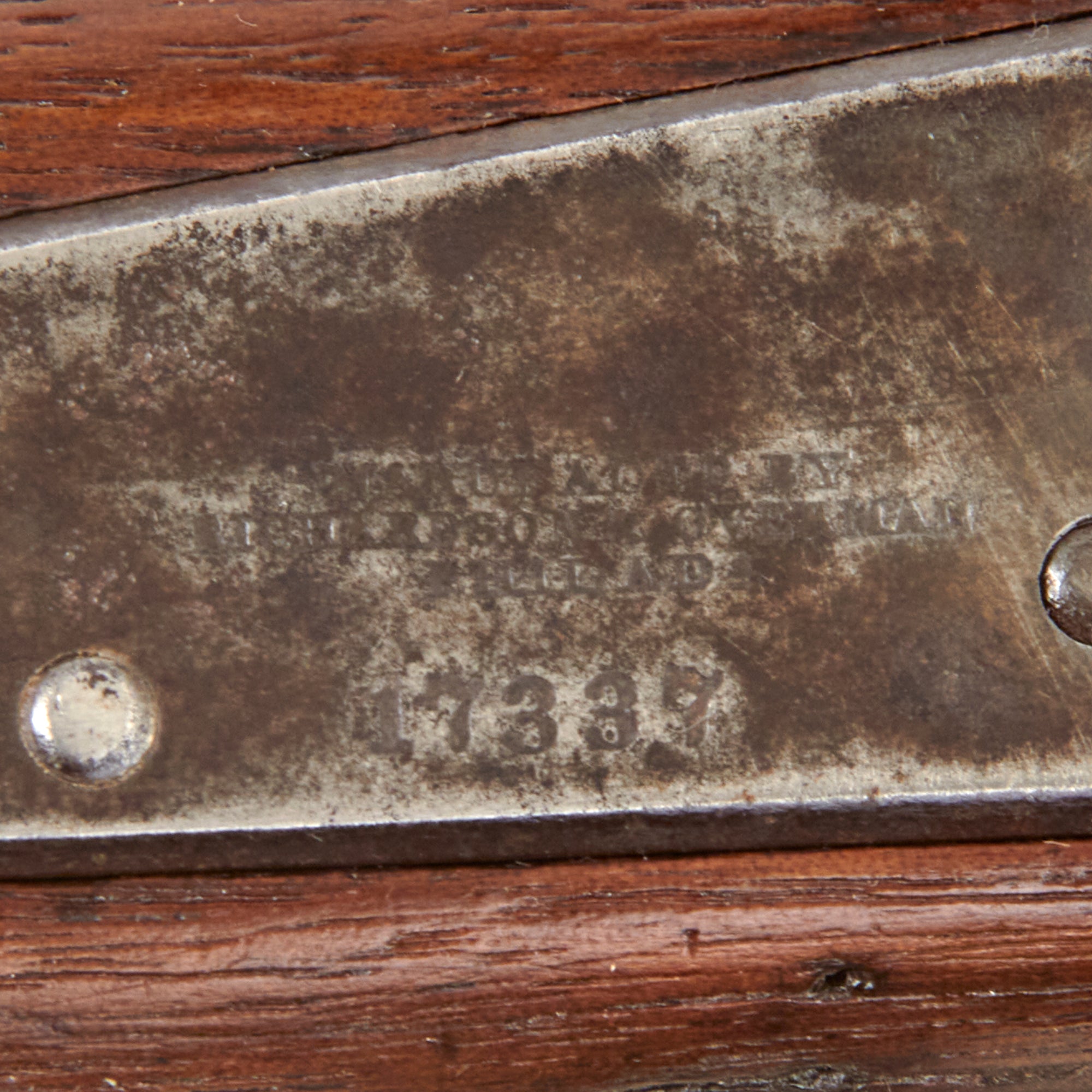 The Gallager Carbine is definitely one of the latter, as while well-designed, their actual use proved to be quite problematic. The cartridges could be unreliable, and often got stuck in the barrel. Only 17,782 were made, and due to their unreliability most were disposed of, so they are quite rare. This fine example is only the fifth that we have ever seen. It still has mostly clear markings on the lock plate, with the patent markings on the left: