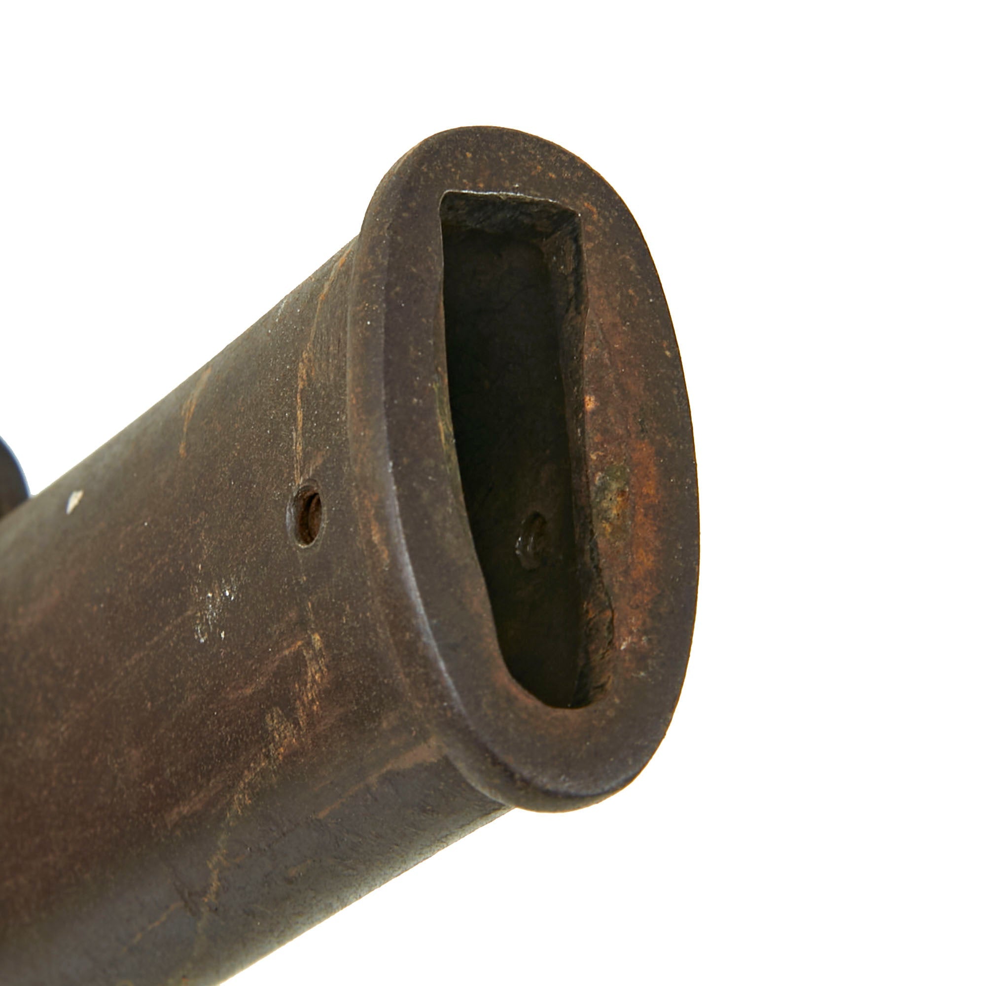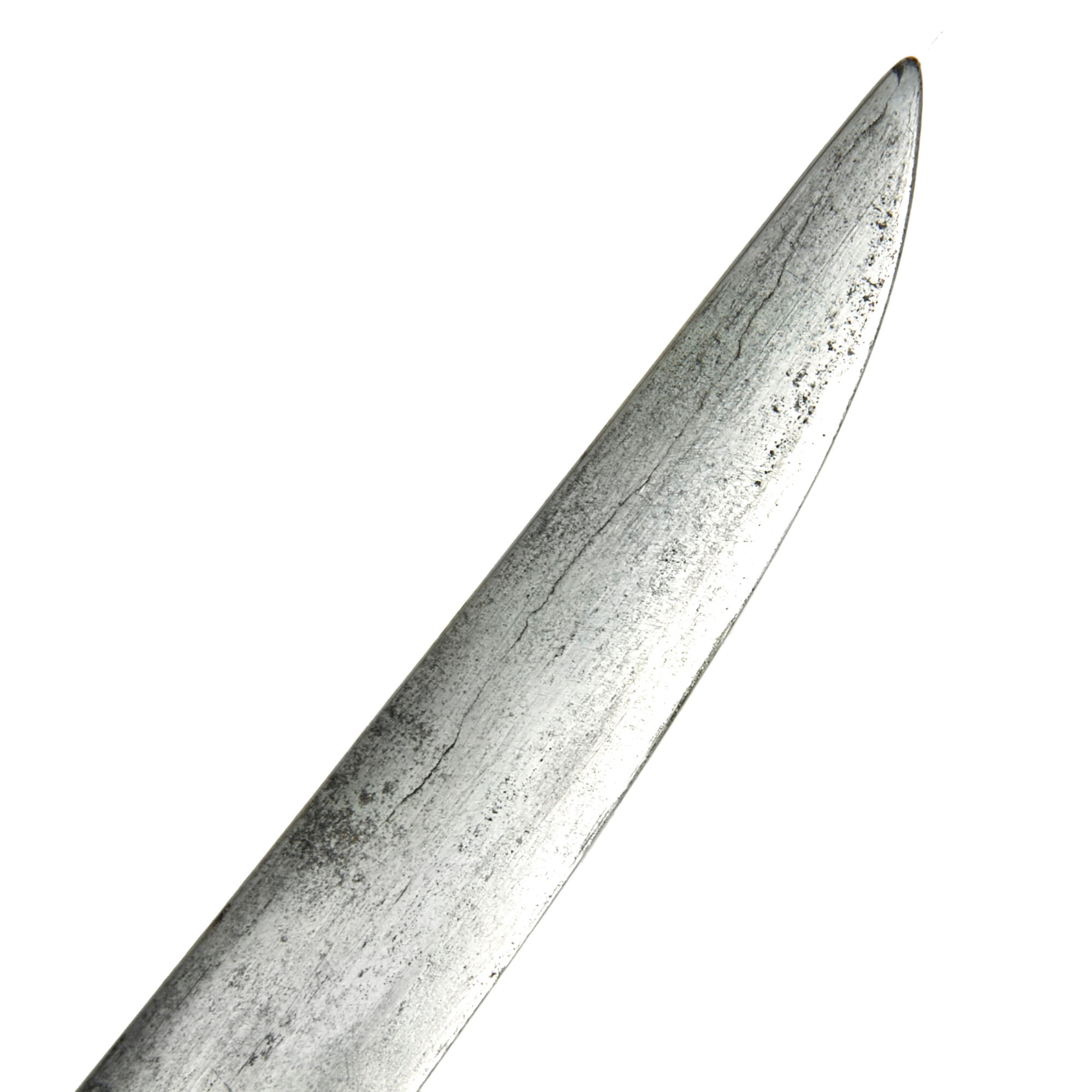 The blade itself has a nice aged patina with some nicks and dents to the edge of the blade, and the tip of the blade has become a small bit rounded. There is some light oxidation to the blade as well. The hilt is still tight on the sword, with the leather-wrapped grip only retaining about 65% of the leather. The wire wrap is still all present, but due to the leather loss it has become very loose on the grip. This example could definitely use some work. The scabbard is in fair shape with both of its rings retained, and a heavy amount of pitting at the opposite end of the scabbard as seen. It is also missing the screw that retains the throat. There are a few small dents to the scabbard but nothing too serious. The patina and age match the sword itself well.