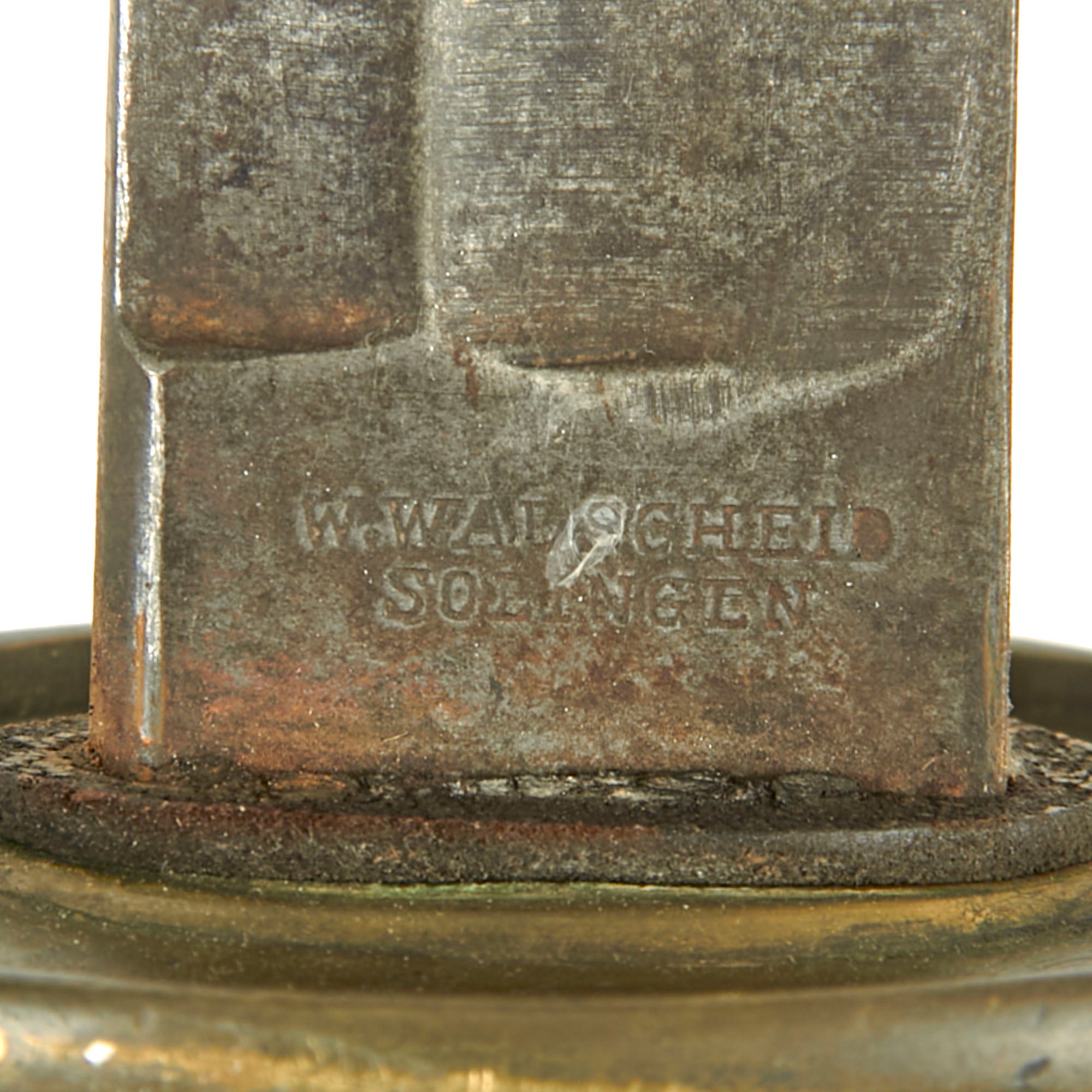 This fair example is marked W. WALSCHEID, SOLINGEN. This Company’s history is very short and does not seem to have extended beyond the Civil War. The only blades known to be made by this firm are the P1822 British cavalry officer’s saber and the M1840 US enlisted man and officers sabers.