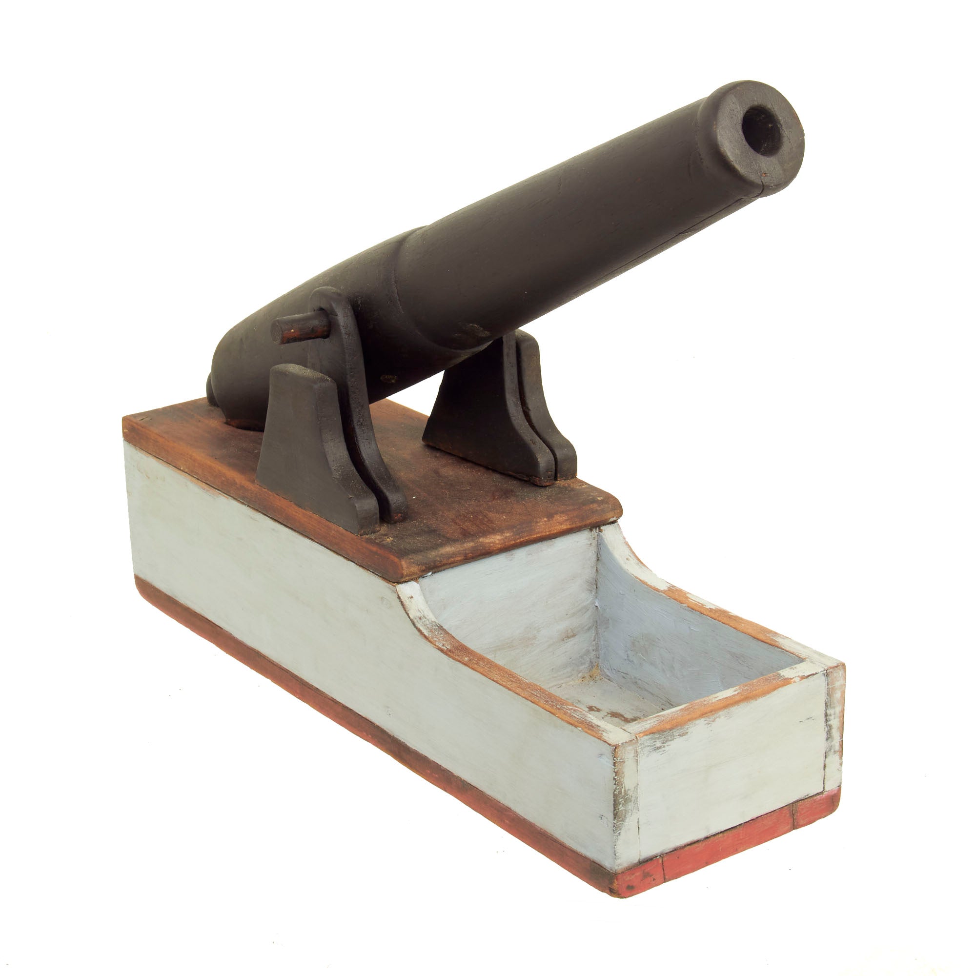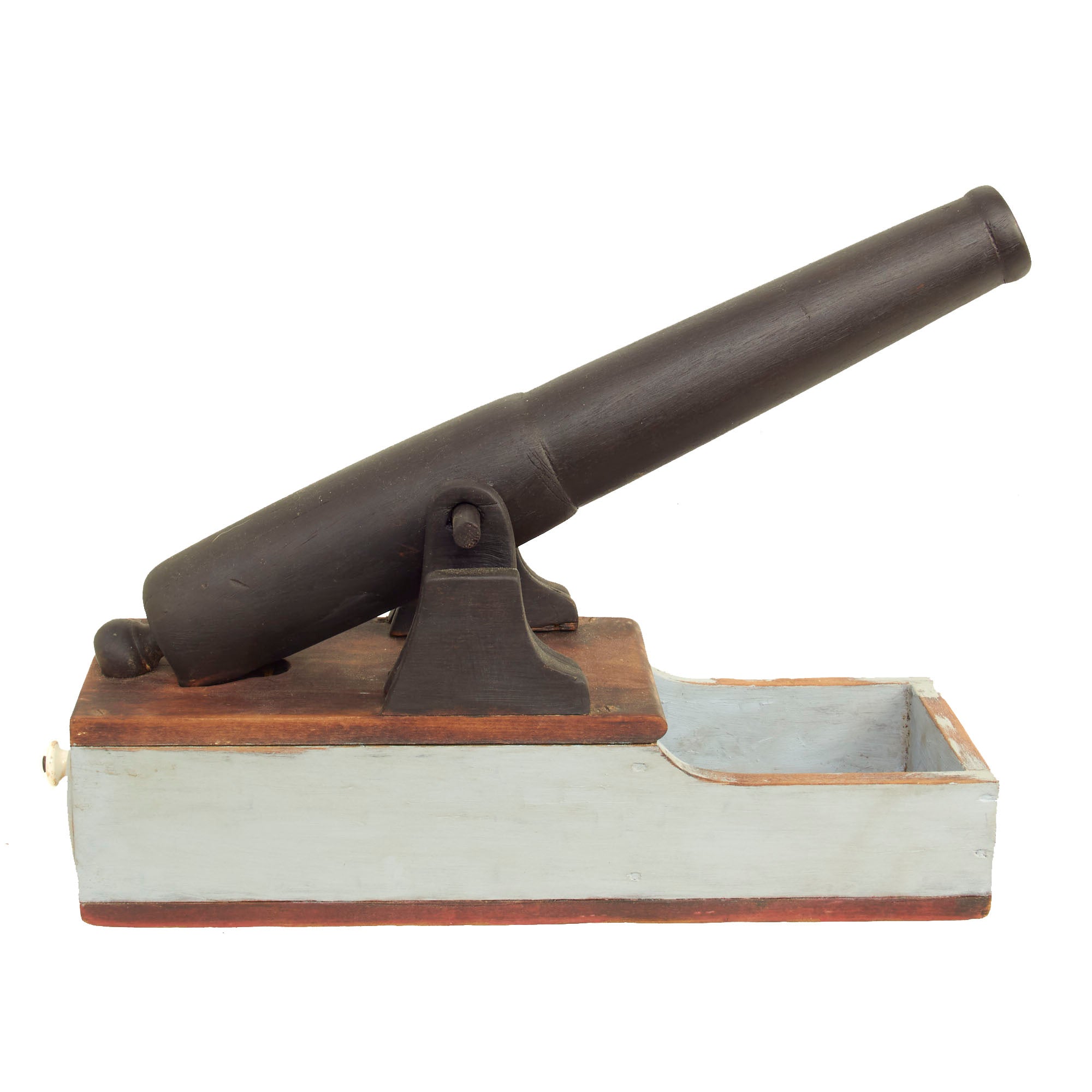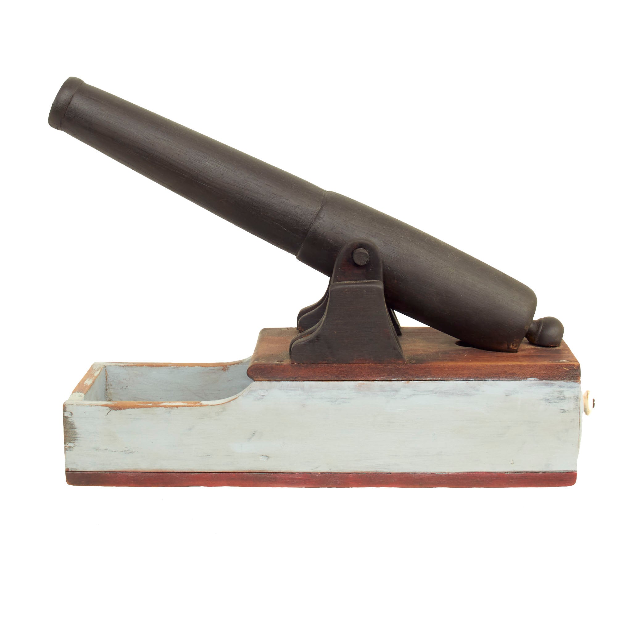 The piece is in very good condition, especially considering the age. It does look to have been repainted at some point, but we have no idea when this occurred. The supports for the "cannon" are also a bit loose and wobbly, as the nails attaching them seem to no longer grip well. The ballot drawer still opens correctly, but it is a bit tight fitting, so it may take some effort to open.