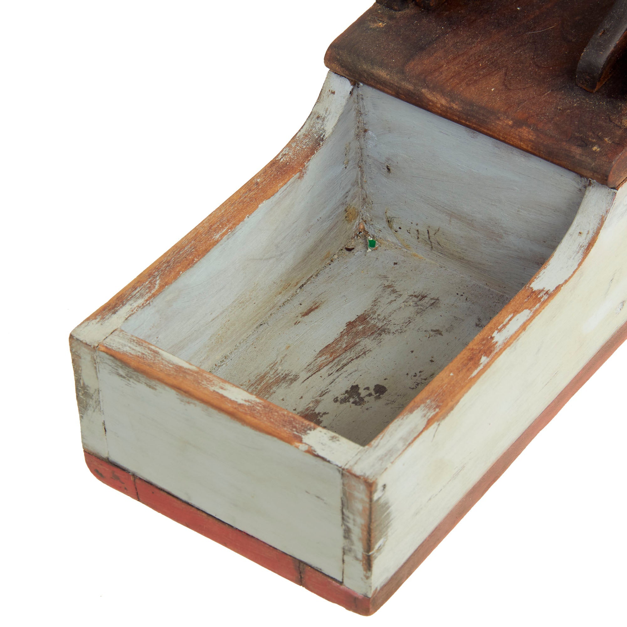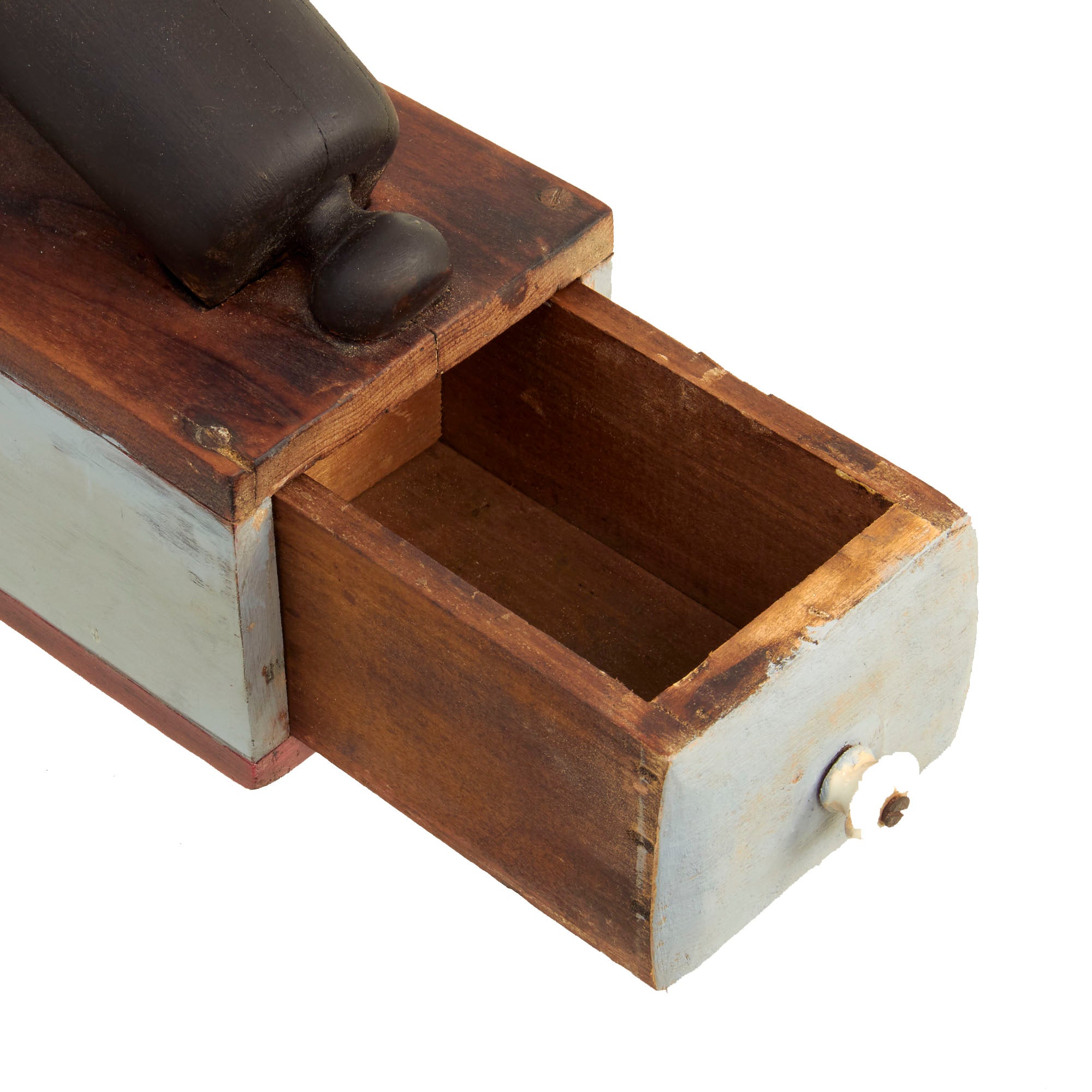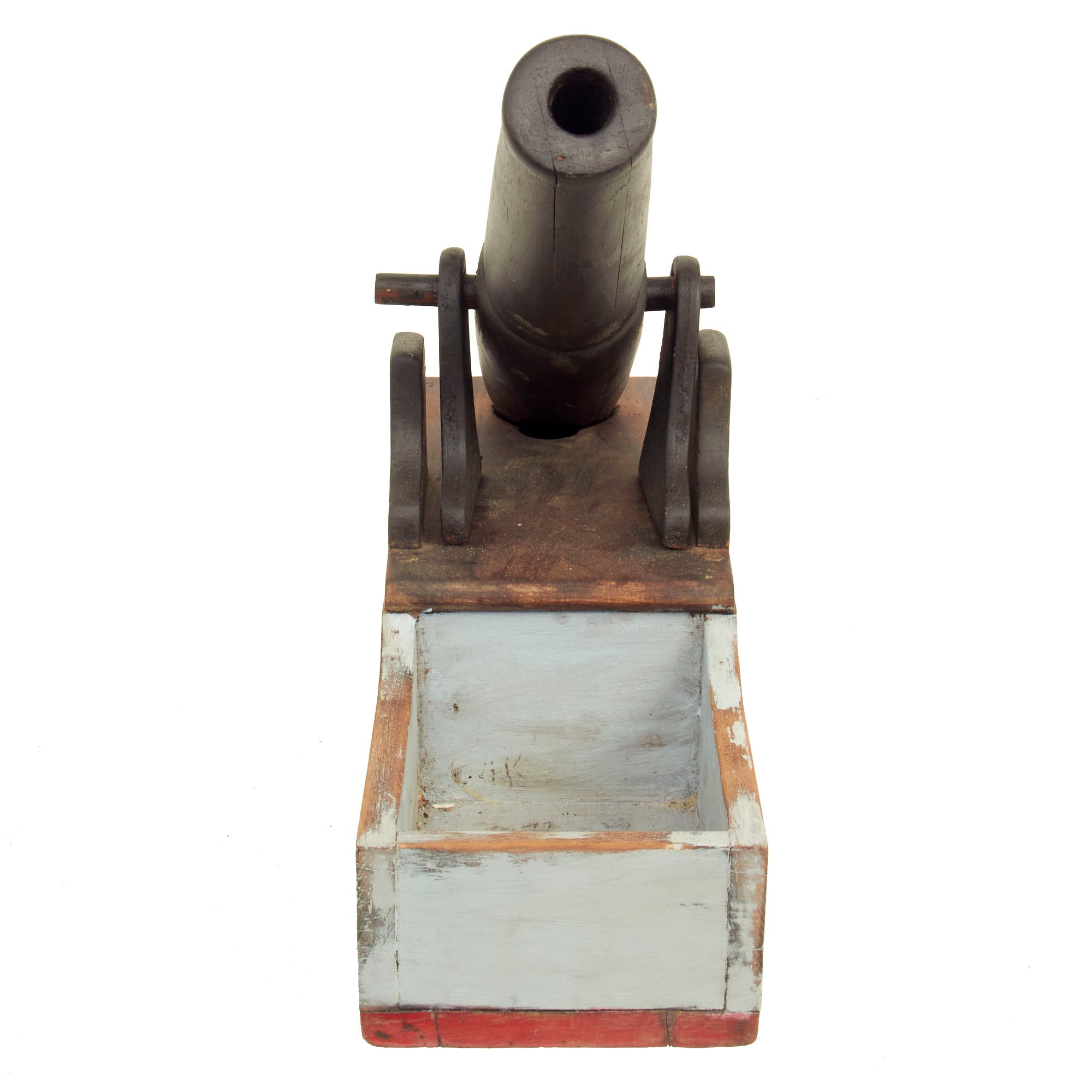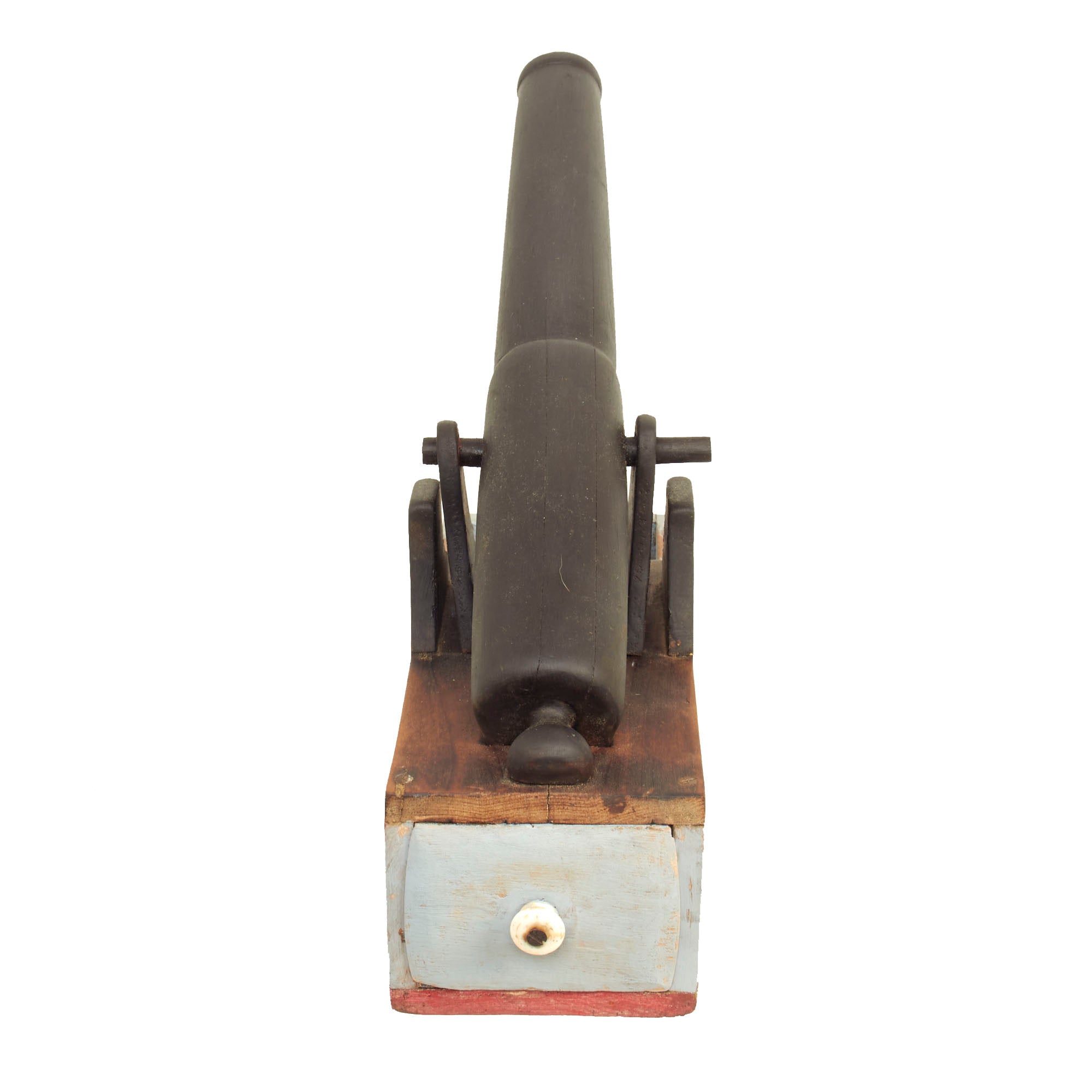 The piece is in very good condition, especially considering the age. It does look to have been repainted at some point, but we have no idea when this occurred. The supports for the "cannon" are also a bit loose and wobbly, as the nails attaching them seem to no longer grip well. The ballot drawer still opens correctly, but it is a bit tight fitting, so it may take some effort to open.