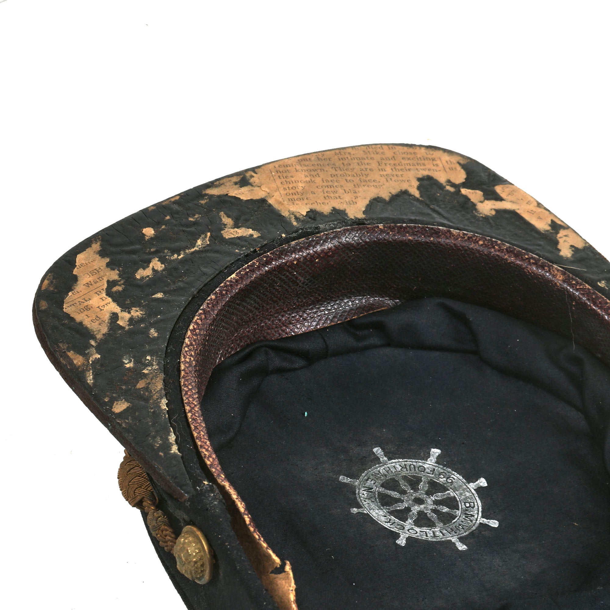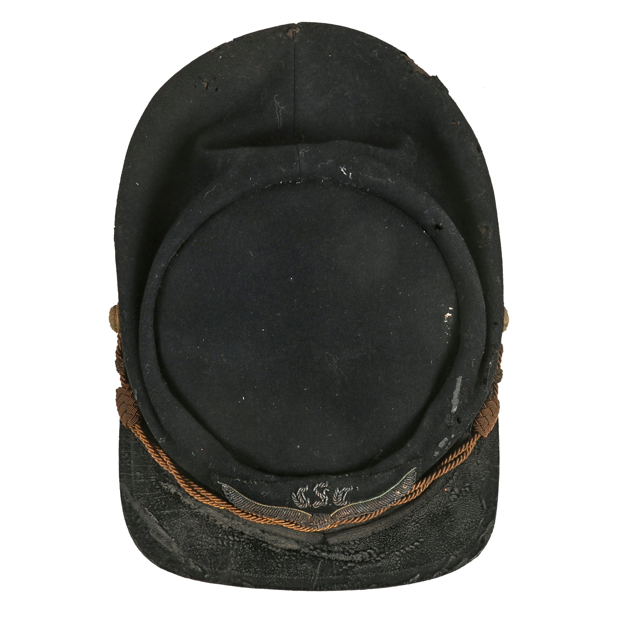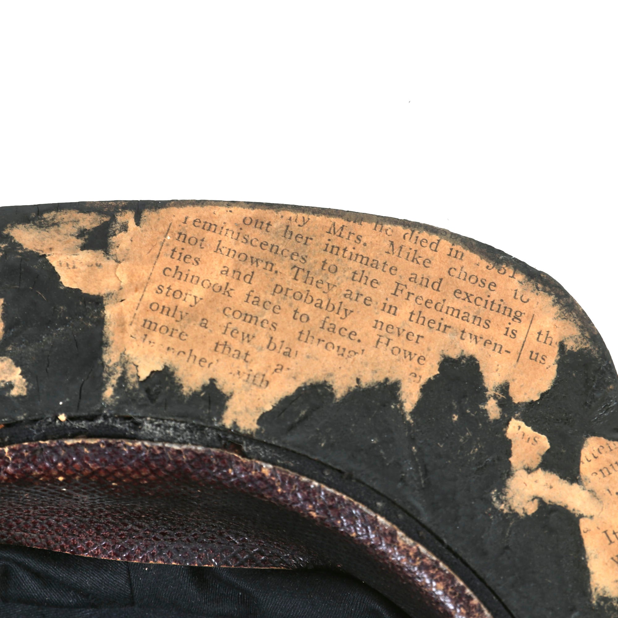 The Kepi is an 1872 Model with a maker’s mark on the interior for B.M. Whitlock at 99 Fourth Avenue, New York. The front of the kepi has a lovely bullion eagle under the letters C.S.C.(?), due to the script style we aren’t able to identify the first and last letters. The lovely bullion chinstrap is held in place by two small Civil War Federal buttons. There are bits of period newspaper stuck to the underside of the brim. The original sweatband is still present, but the stitching is entirely gone. The underside of the sweatband is inscribed with the name E. H. HOWES, a lovely research opportunity. The cap has some moth damage as shown, but nothing terribly serious.