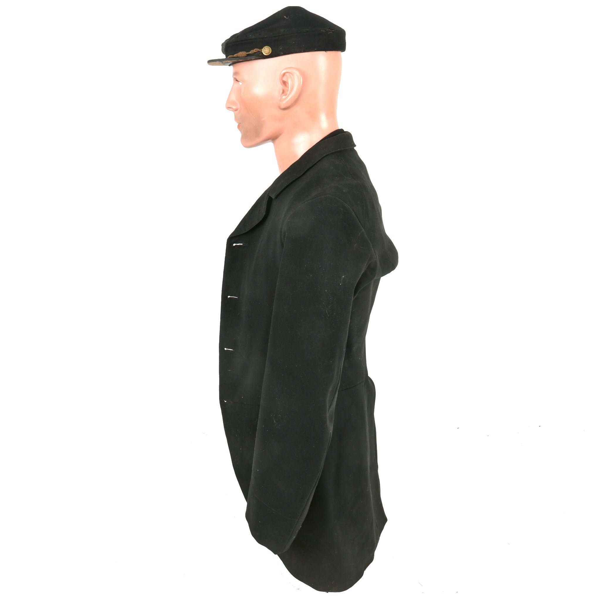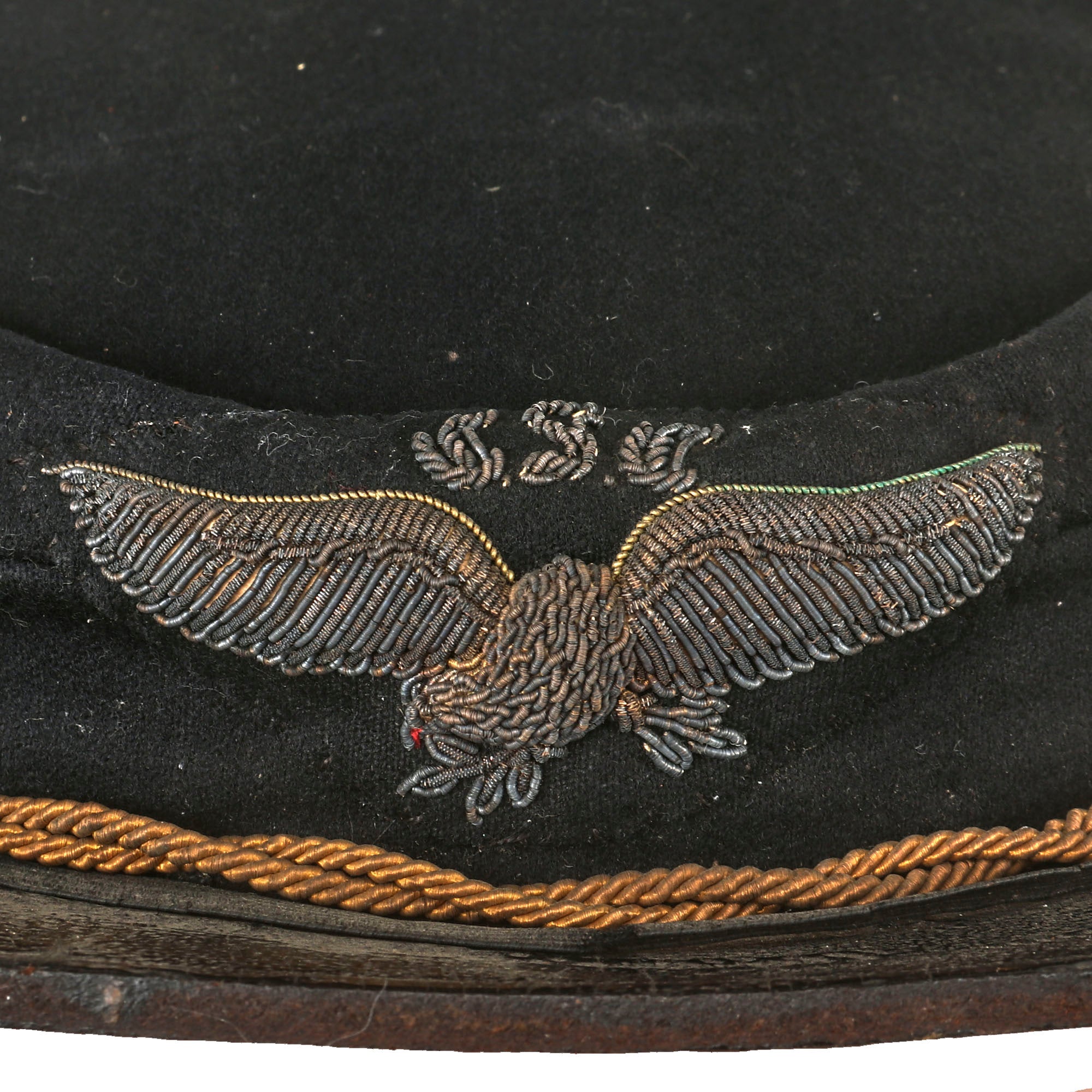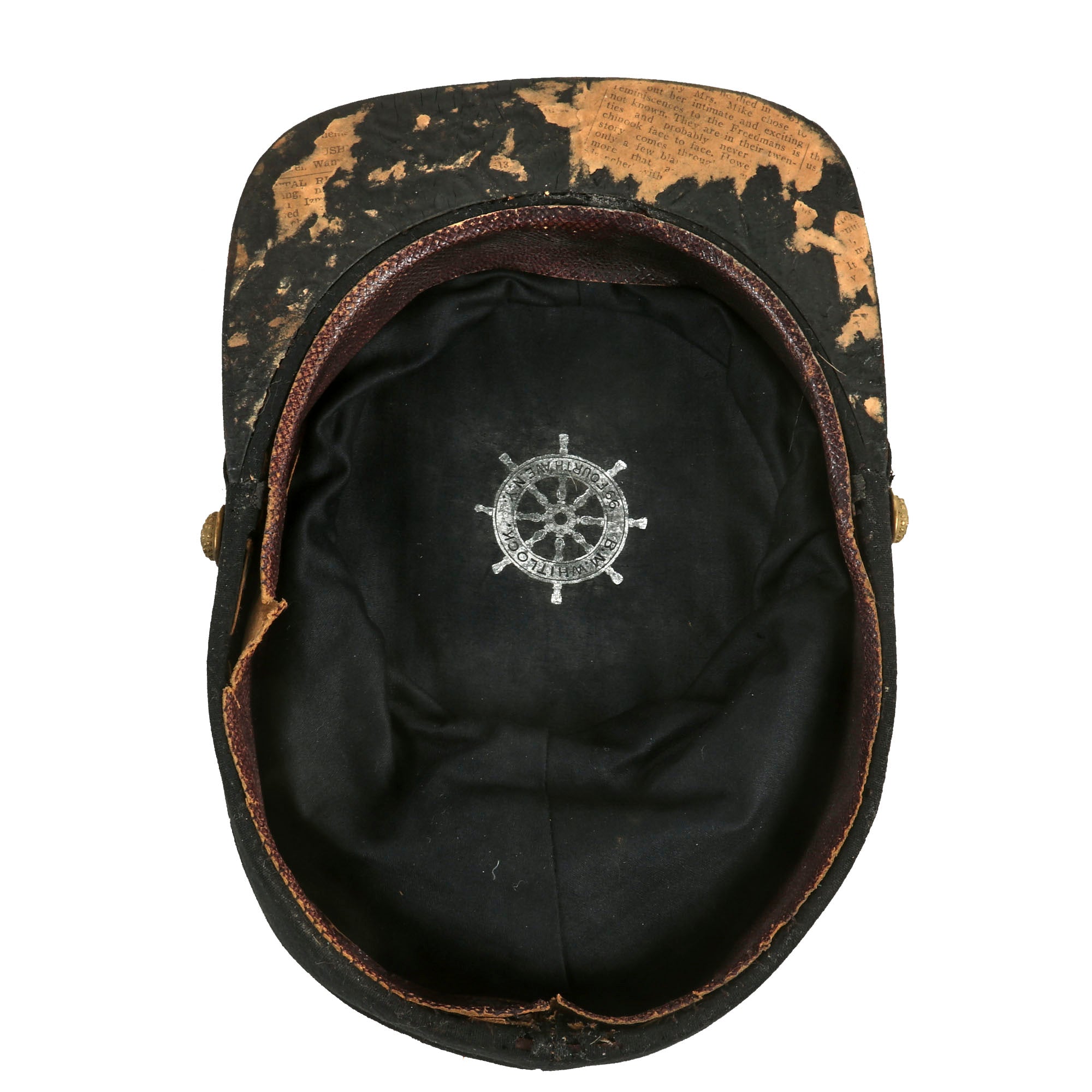 The Kepi is an 1872 Model with a maker’s mark on the interior for B.M. Whitlock at 99 Fourth Avenue, New York. The front of the kepi has a lovely bullion eagle under the letters C.S.C.(?), due to the script style we aren’t able to identify the first and last letters. The lovely bullion chinstrap is held in place by two small Civil War Federal buttons. There are bits of period newspaper stuck to the underside of the brim. The original sweatband is still present, but the stitching is entirely gone. The underside of the sweatband is inscribed with the name E. H. HOWES, a lovely research opportunity. The cap has some moth damage as shown, but nothing terribly serious.