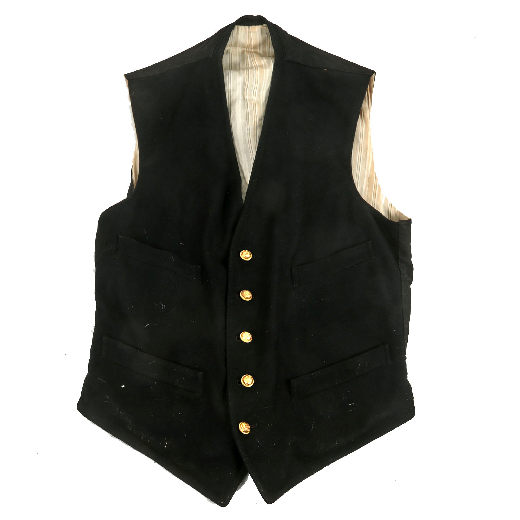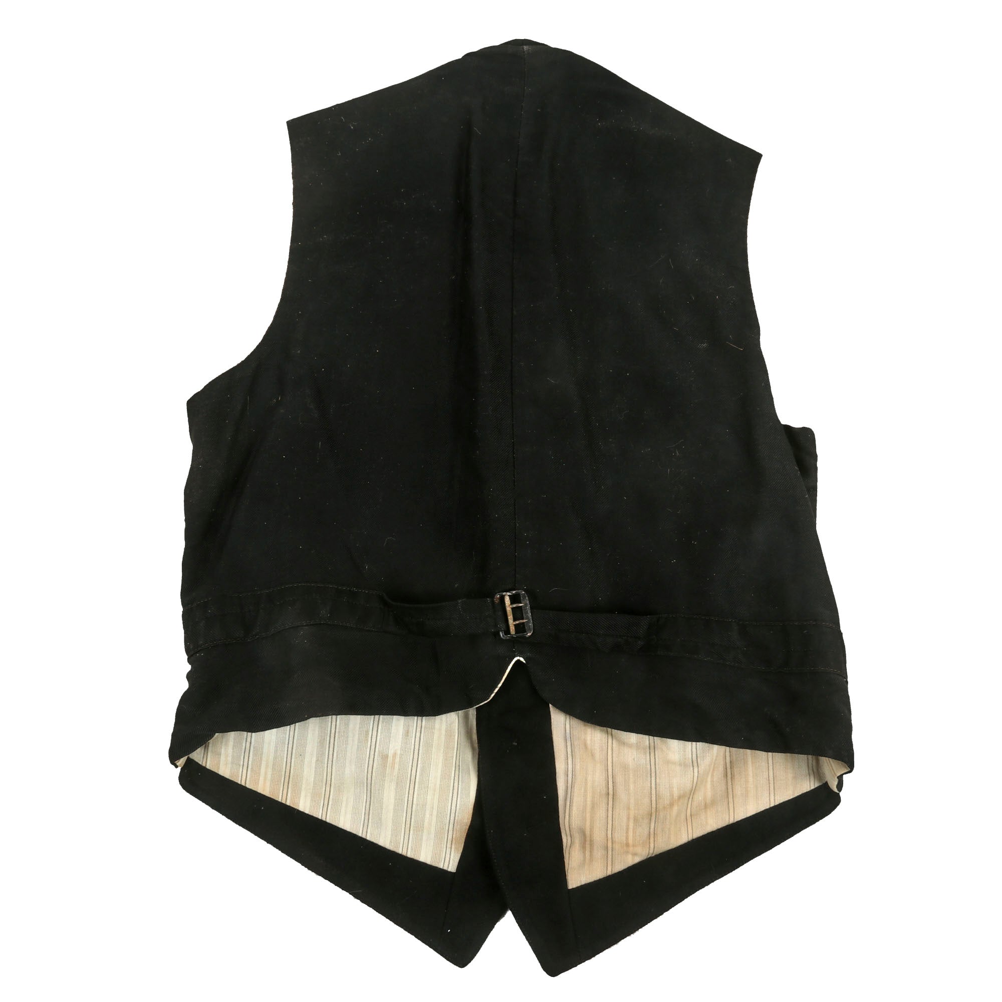 The included vest is an Indian War era soldier’s vest with five small GAR buttons to the front with a tightening belt on the back. It also shows use with some staining on the interior.